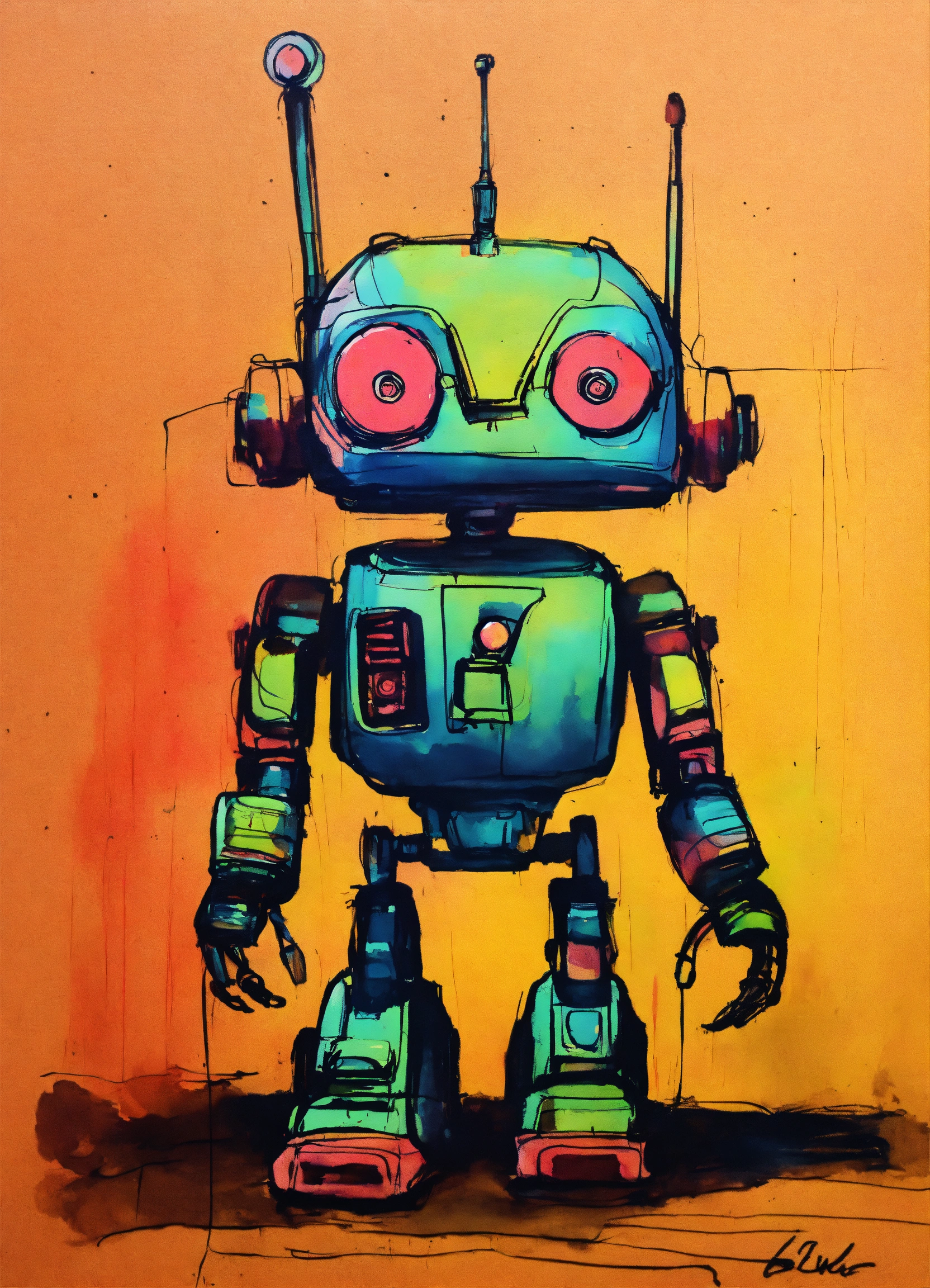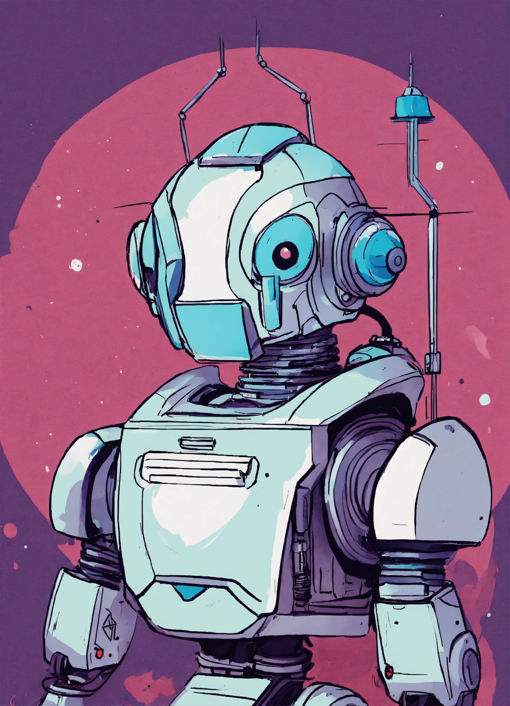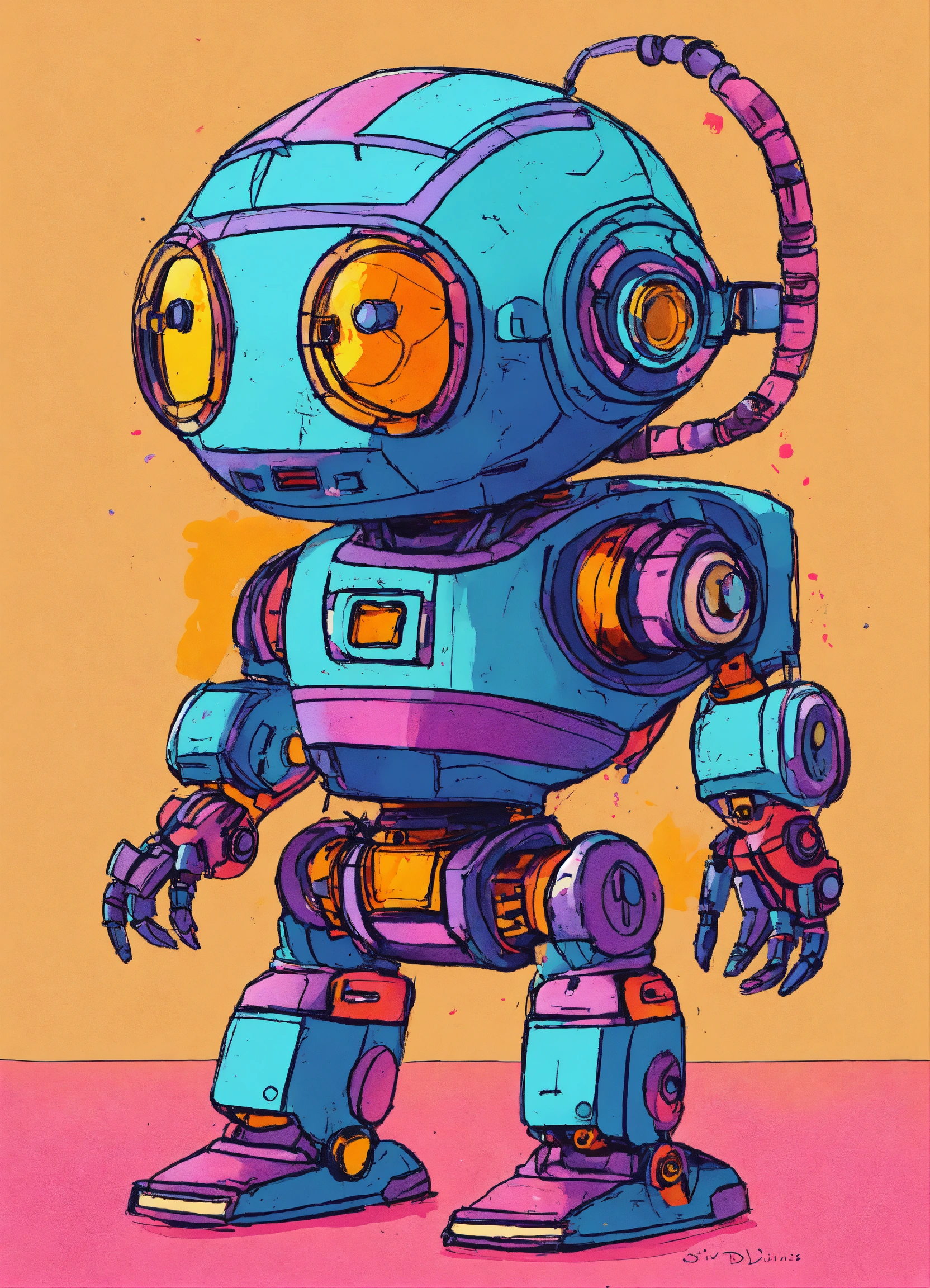 Minimalist painting of sci-fi cute robot design in the style of olivia de berardinis, pen and ink sketch, colorful, rough sketch, first draft, amateur, low quality, bad art