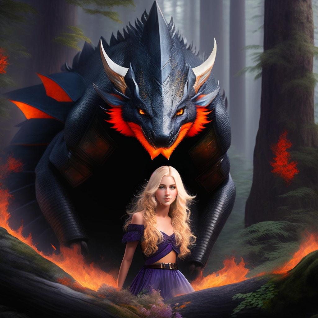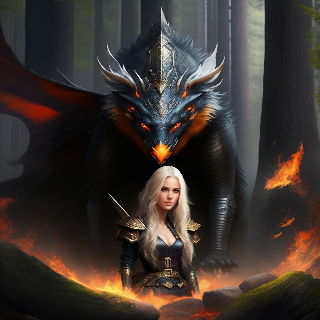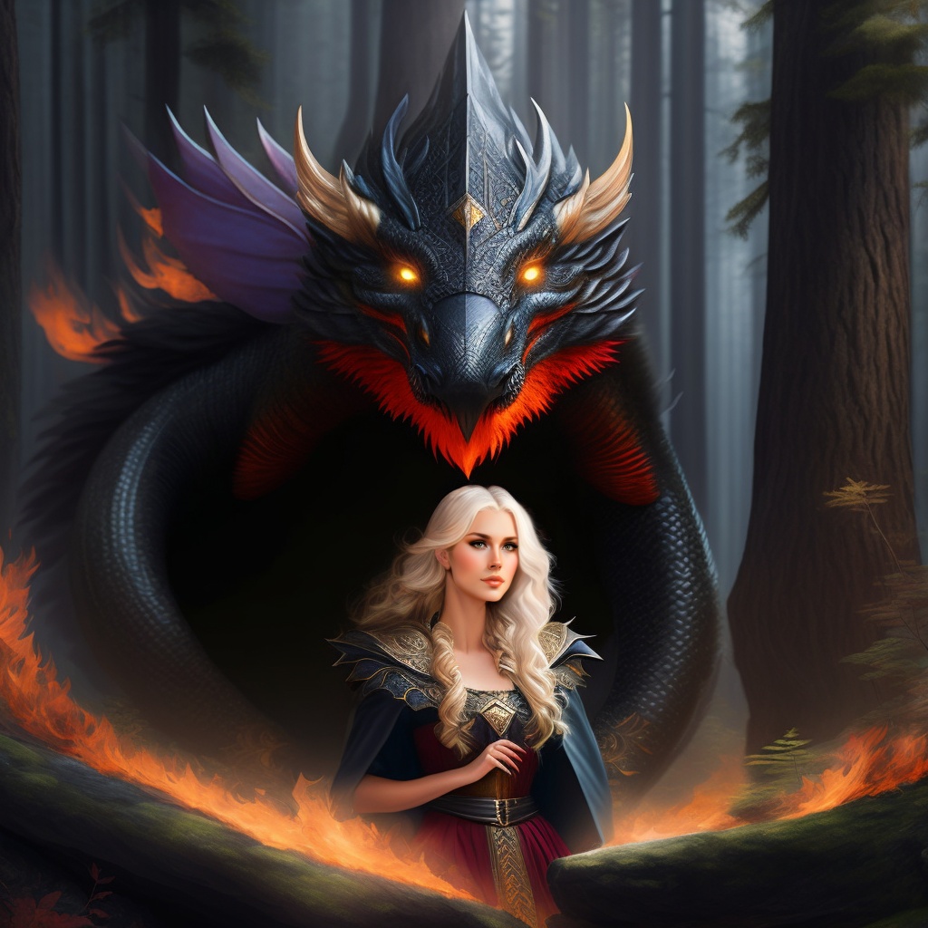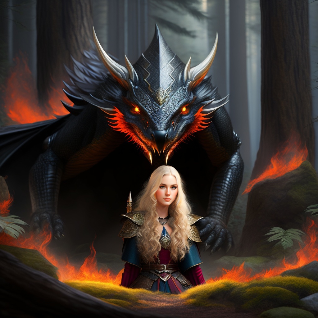 A fiery and black dragon protecting a blonde girl in the forest, luis rollo, dragonlance, lord of the rings