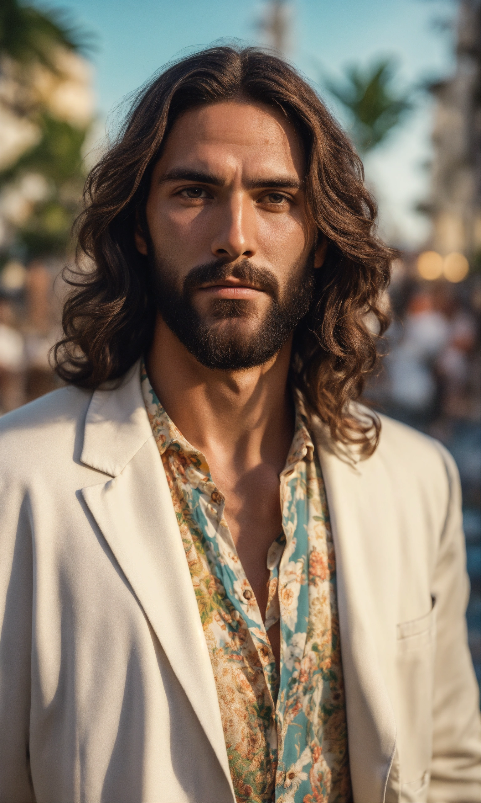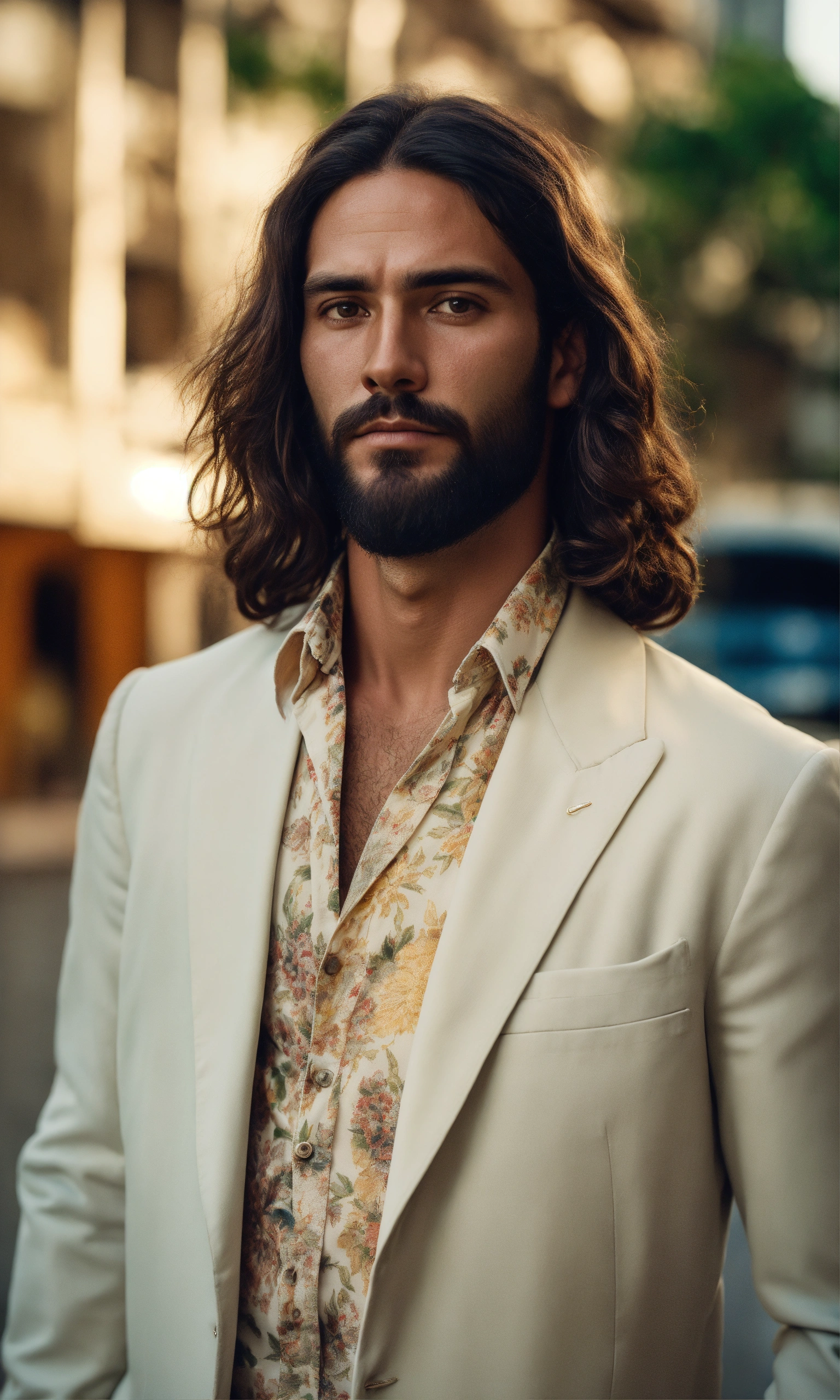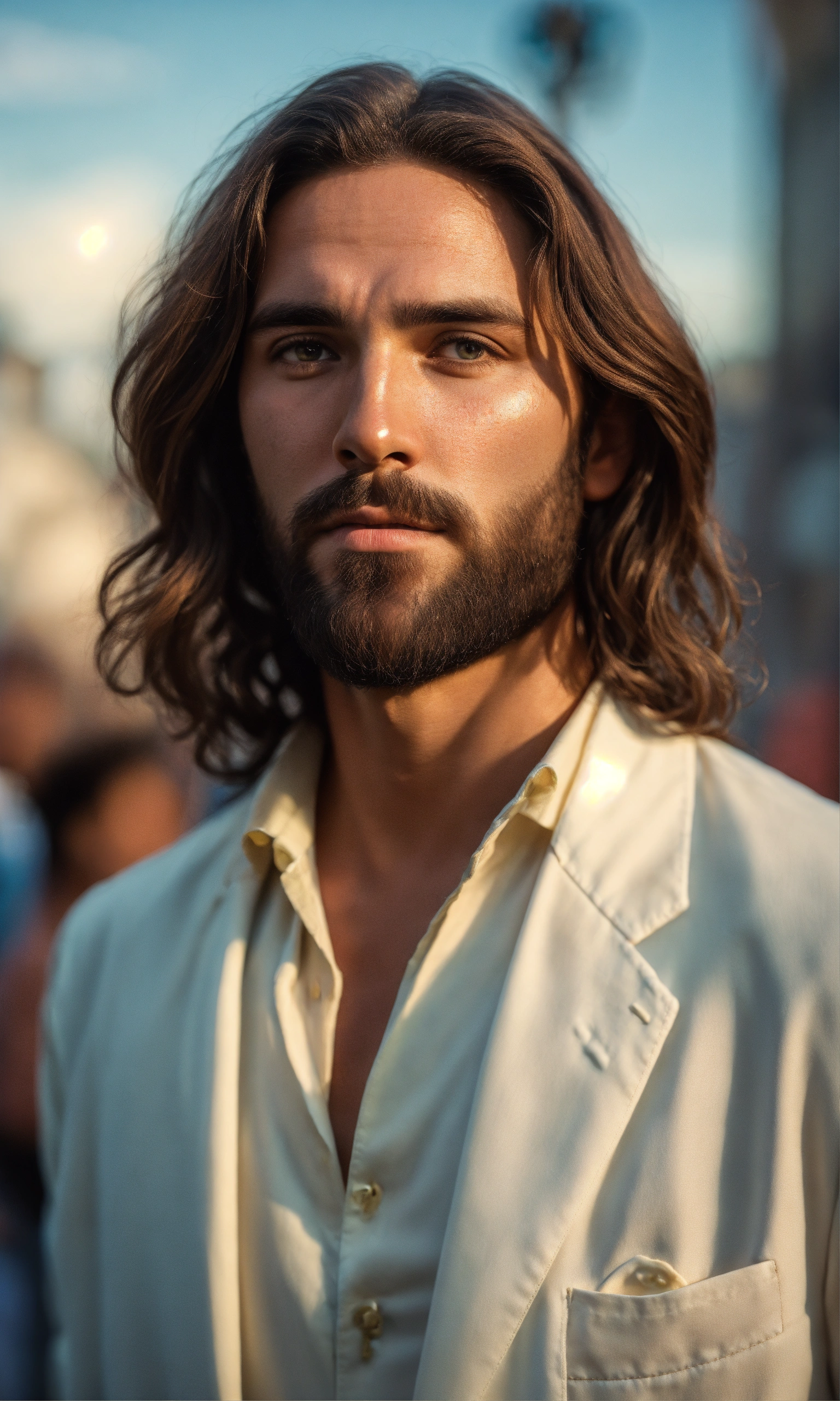 Ultra realistic photo of male brazilian jesus, forties, vintage colors, not painted, very detailed faces, skin with pores, 4k, white suit, ultra detailed rio de janeiro city background, skin not smoothed, face from left to right, desire in the eyes, half profile, glowering, looking into the camera, wearing a summer shirt. all body, glossy