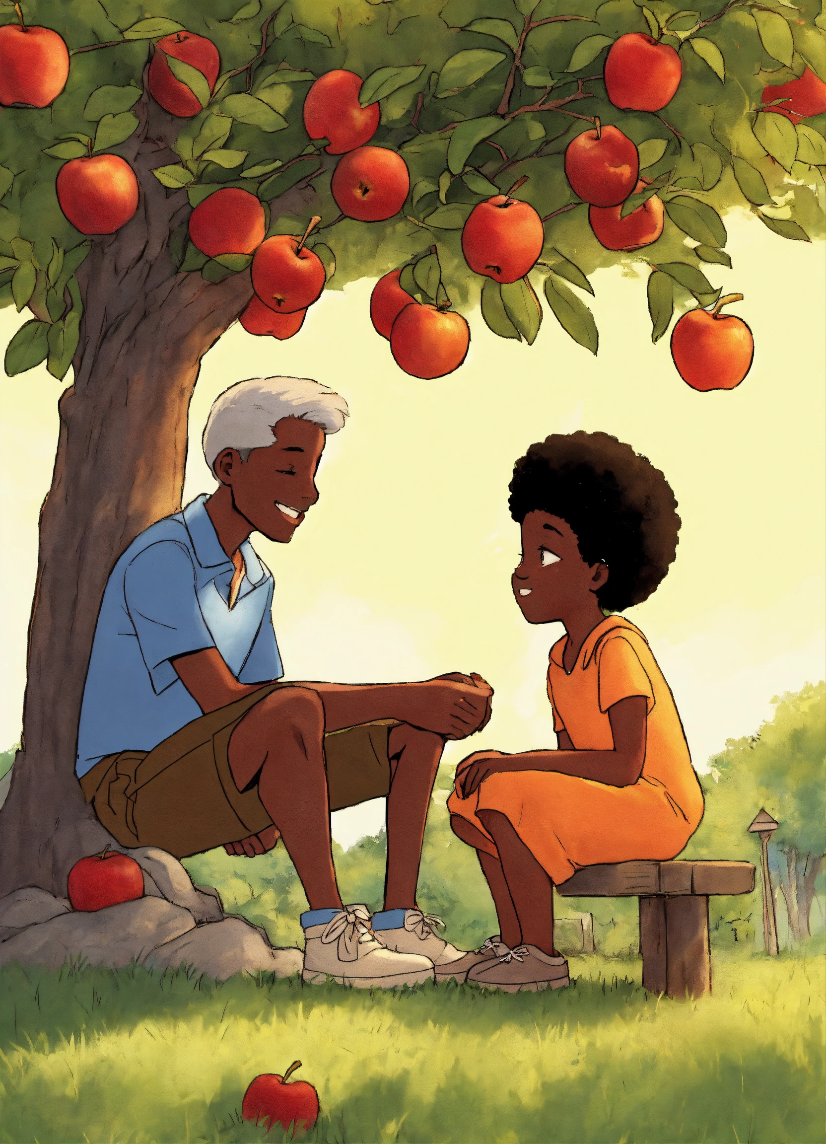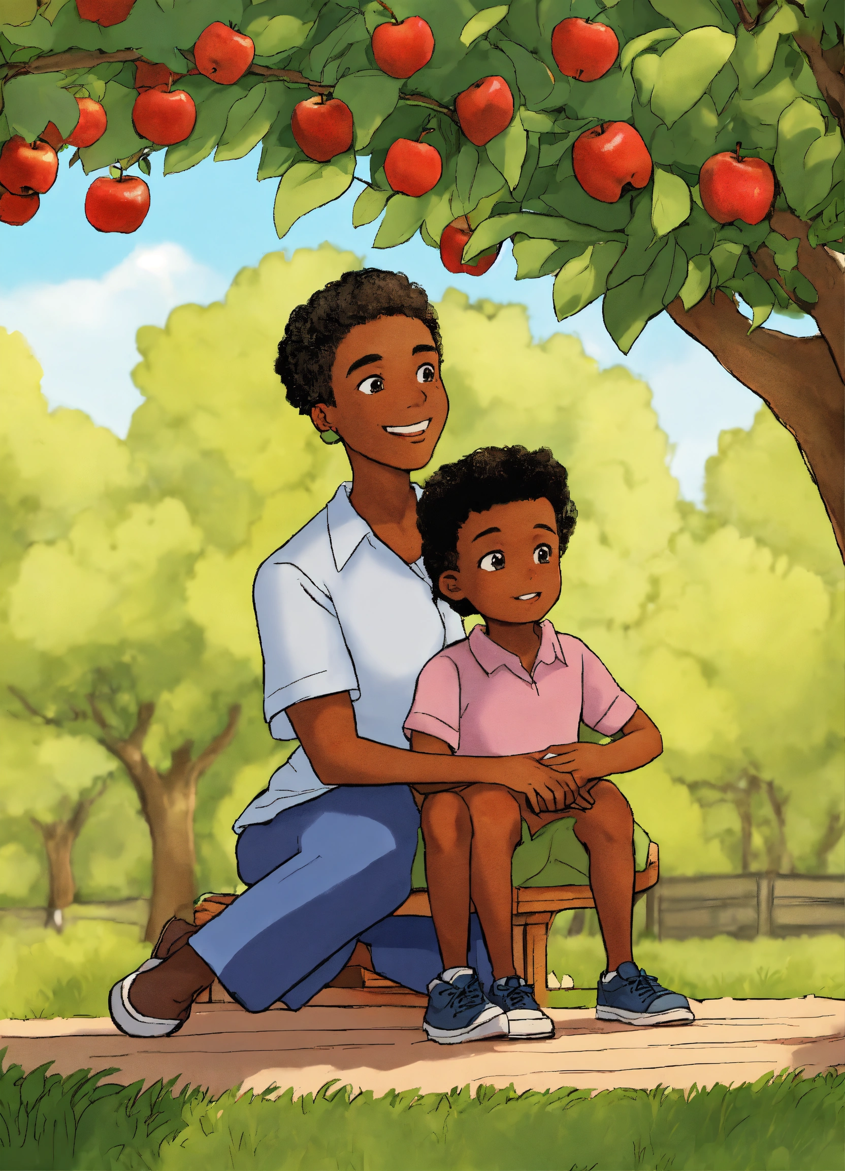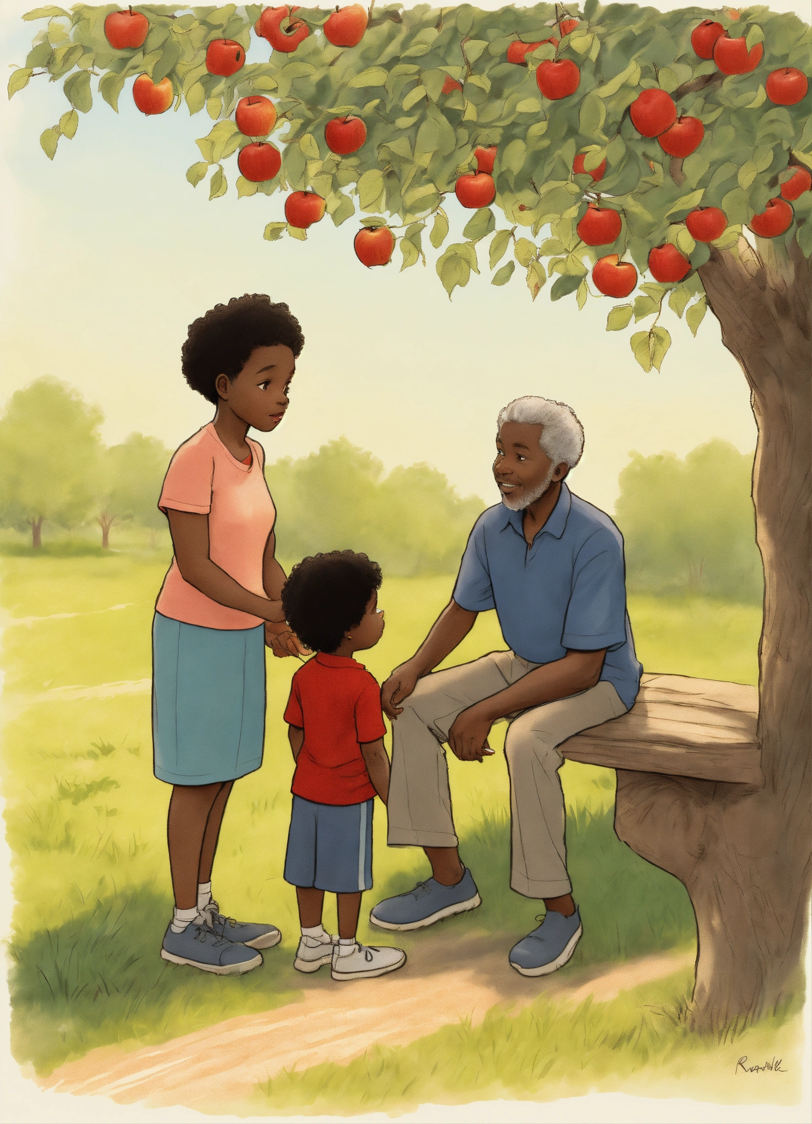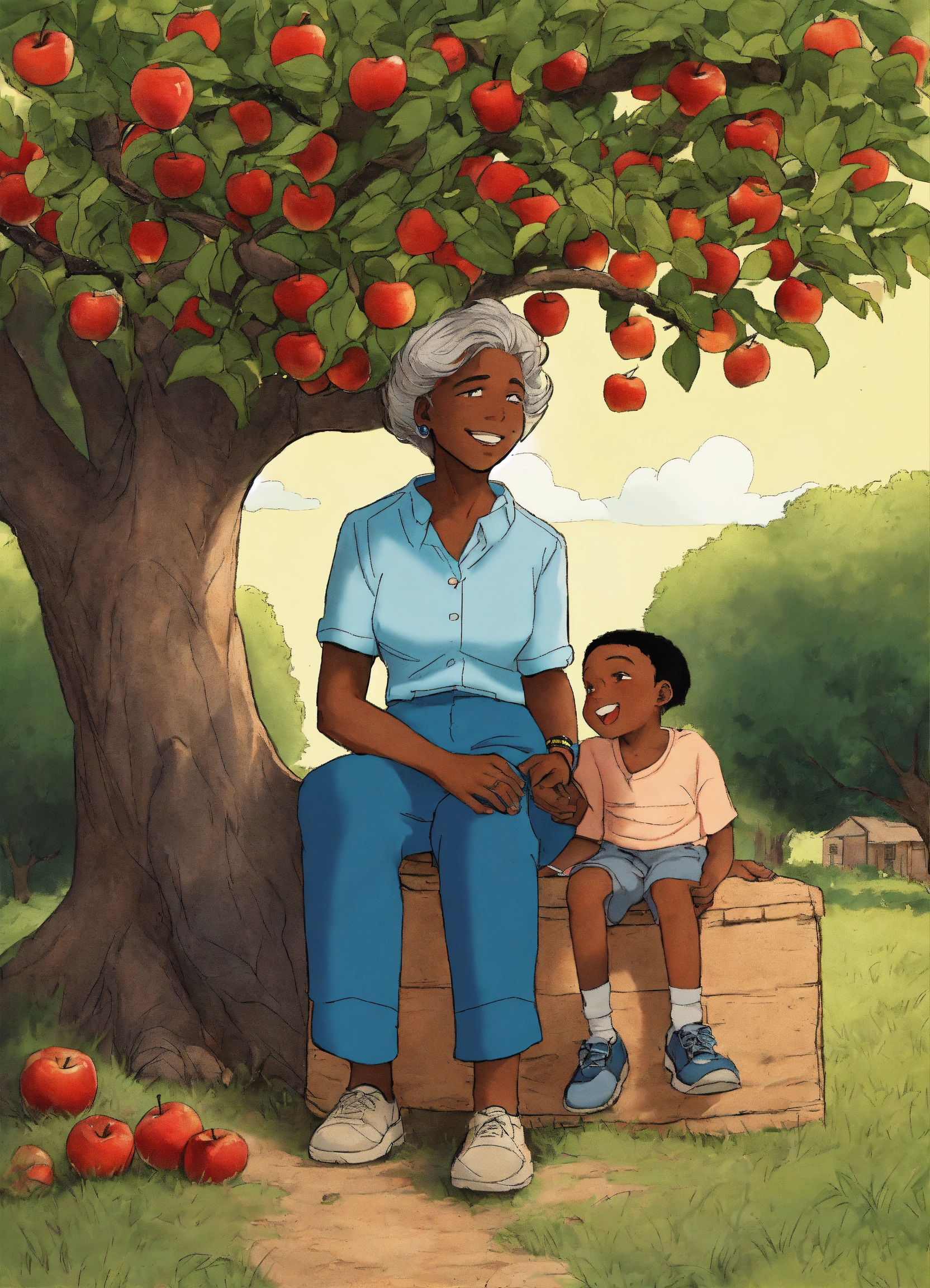 Cartoon drawing. outside, a six-year-old black boy was sitting on his grandmother's lap. she is radiant with age and grace and has silver streaks in her hair. 25 year old man is standing up under an apple tree, talking to 50 year old man.