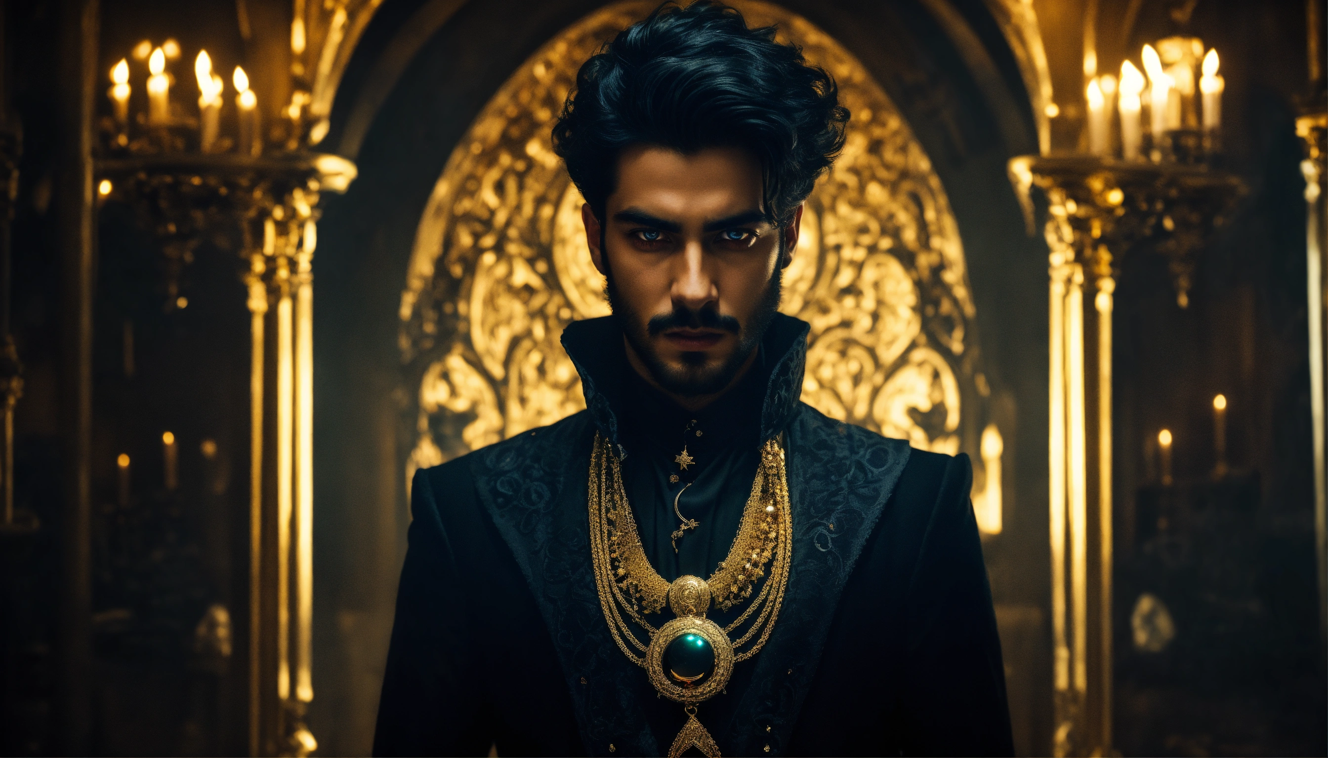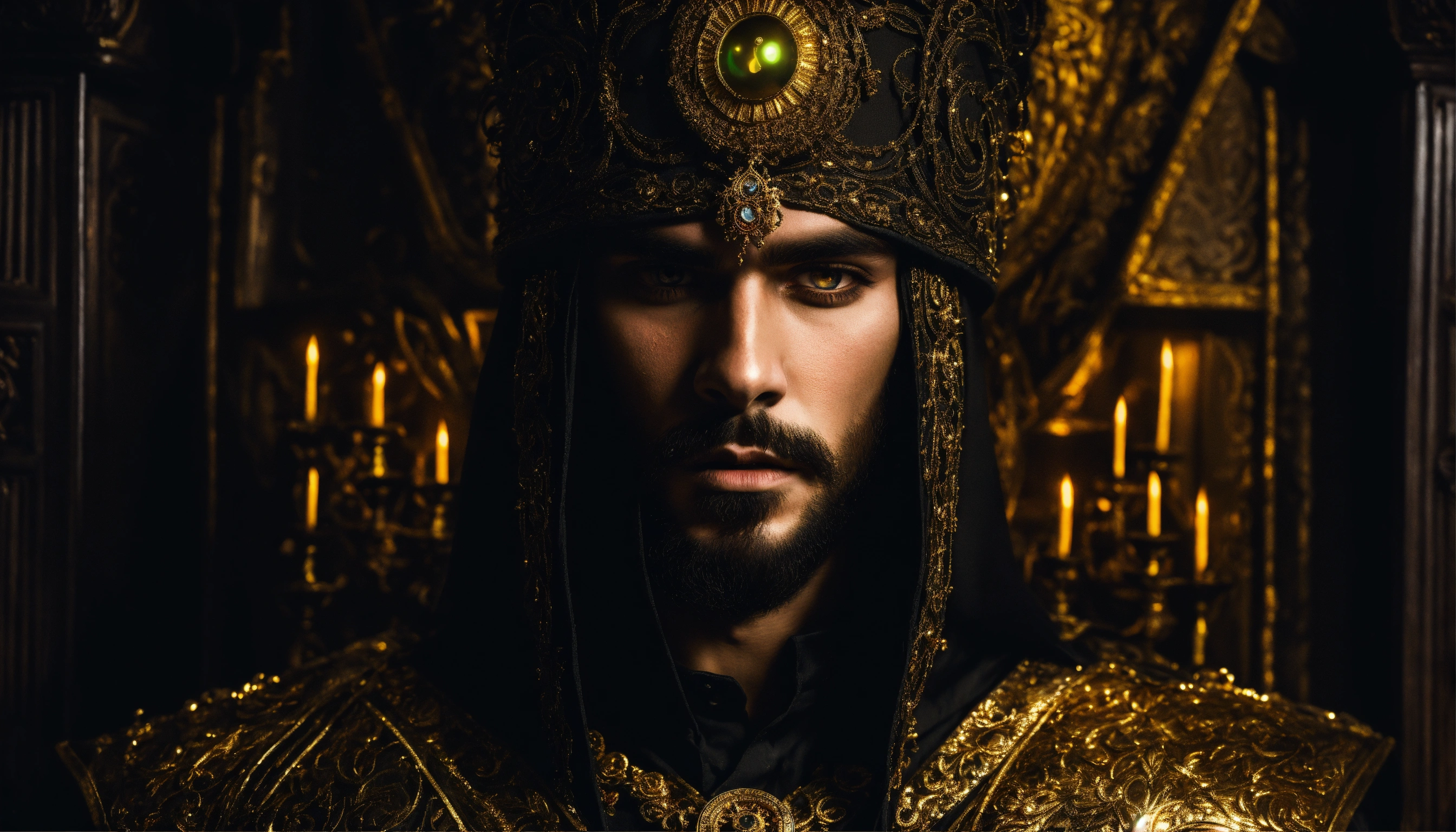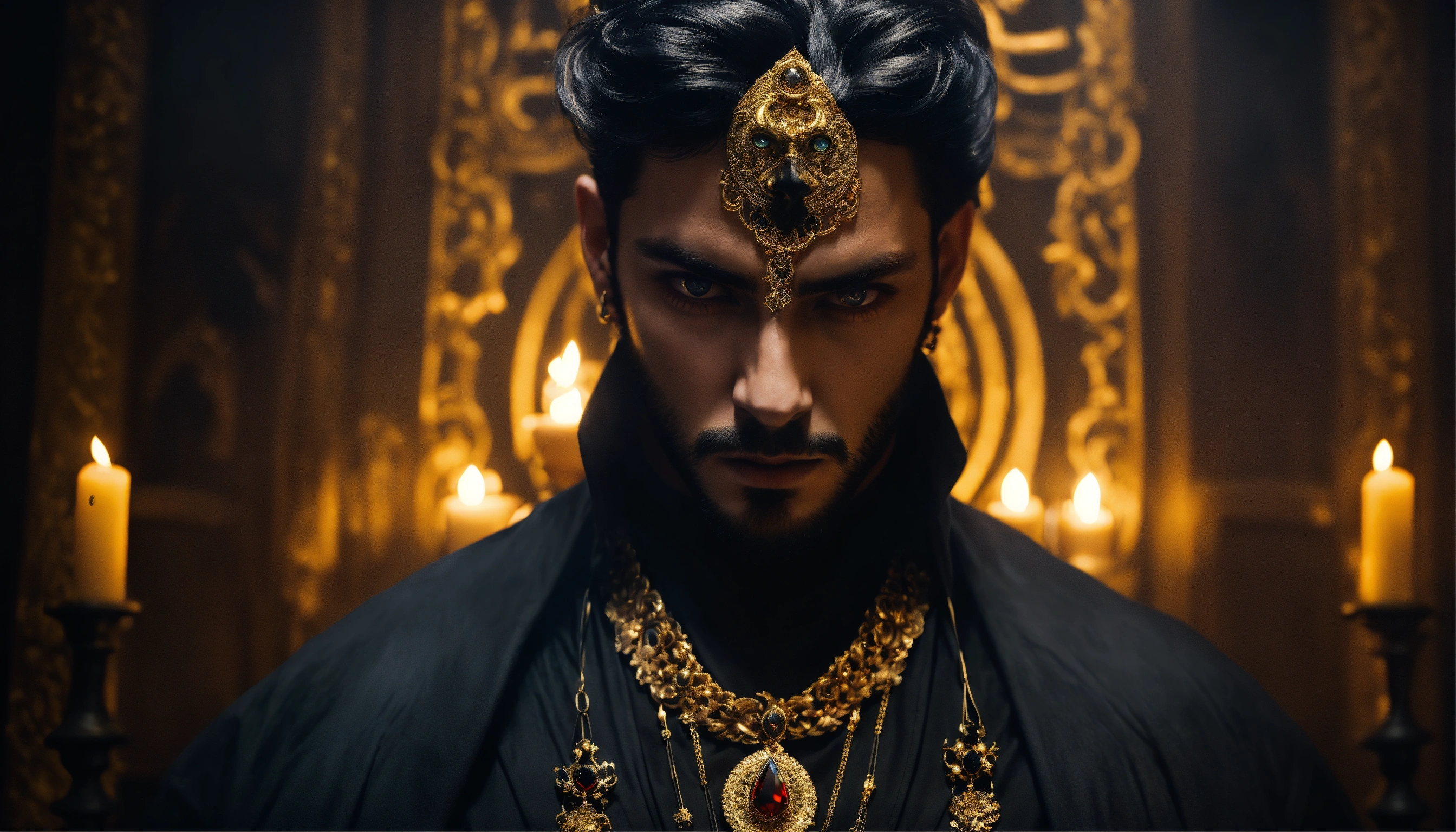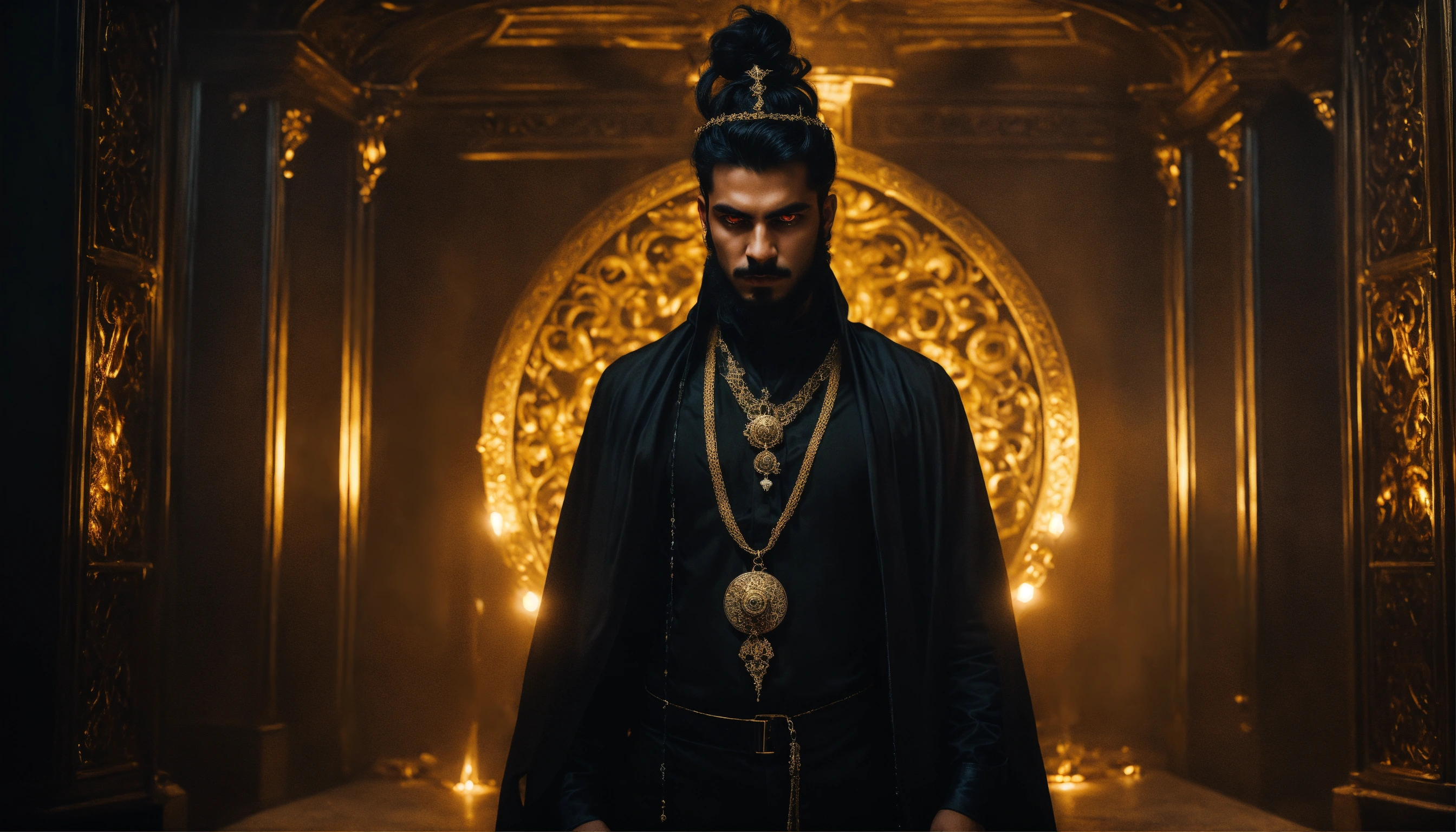 Dark, mysterious and dramatic portrait of a young handsome persian diabolical powerful sorcerer with hypnotic glowing eyes wearing black sinister clothes and gold jewellery in a sinister, dimly-lit secret chamber.