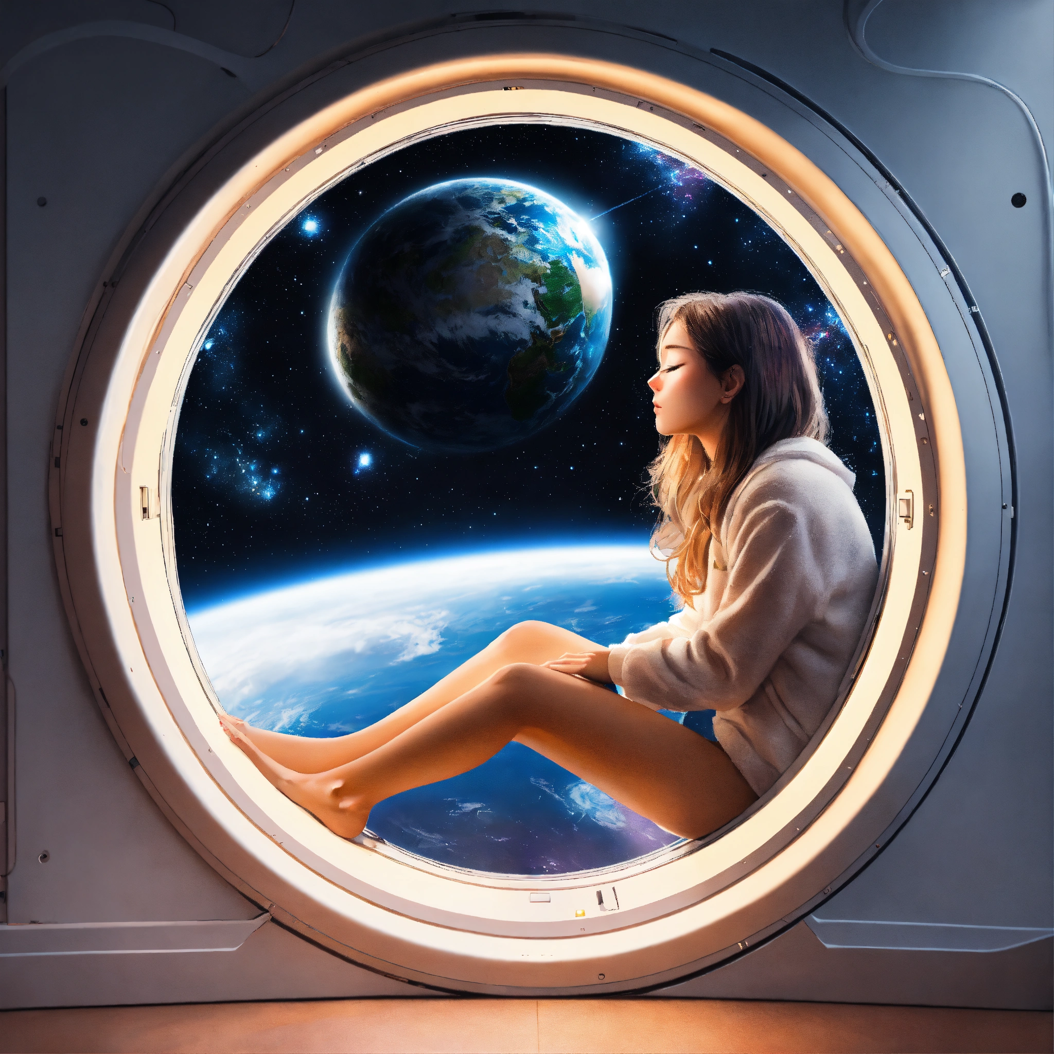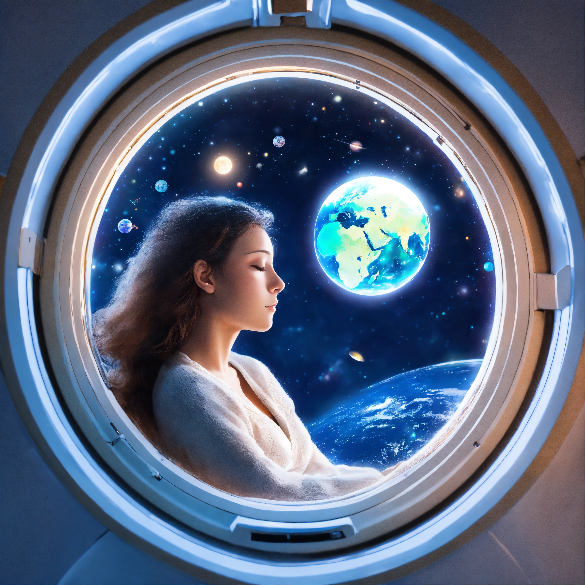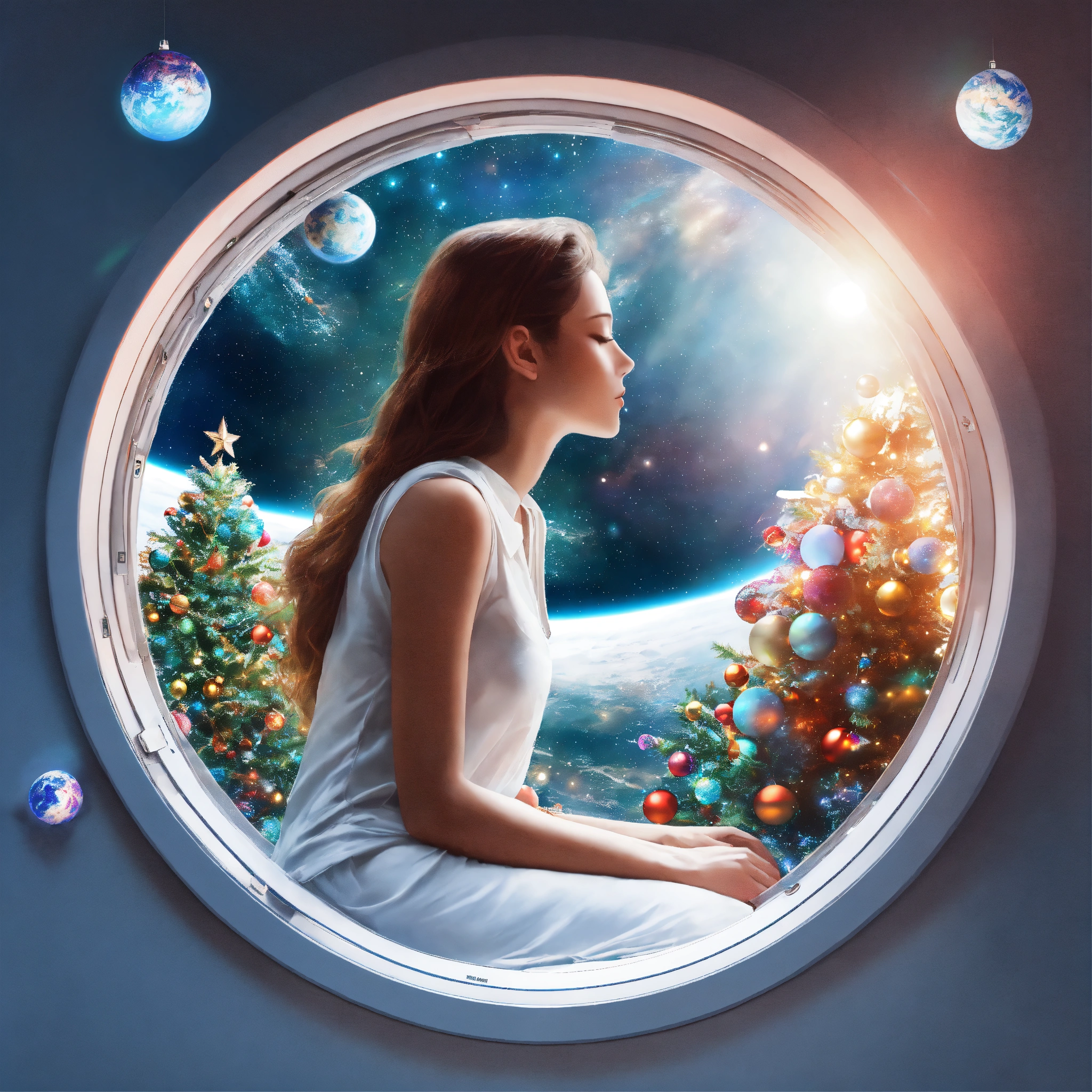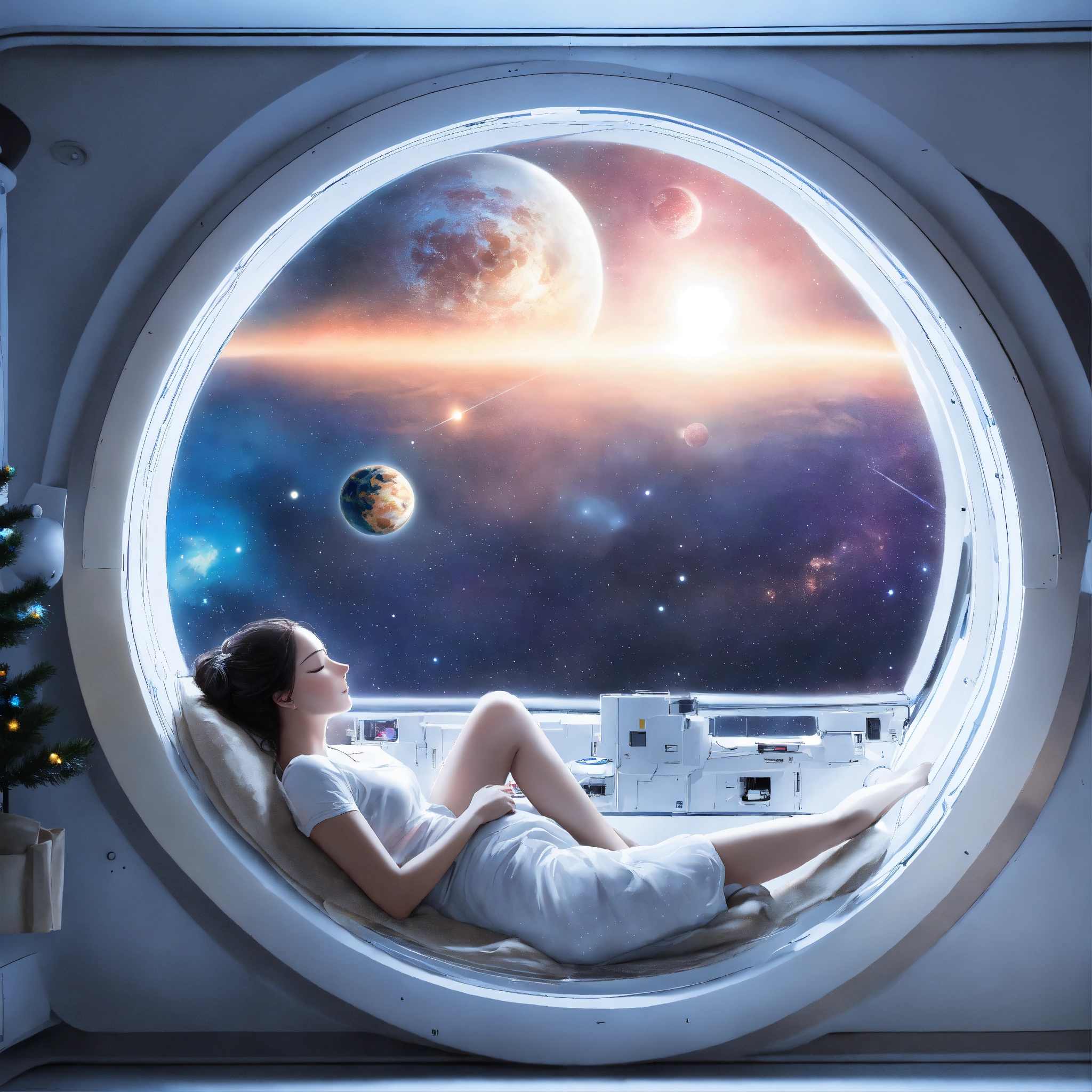 Woman sleeping near window and watching earth from spaceships window and have small chrismas tree inside spaceship, in circle image, holographic, best quality, white outside of circle, white background, just 1 planet