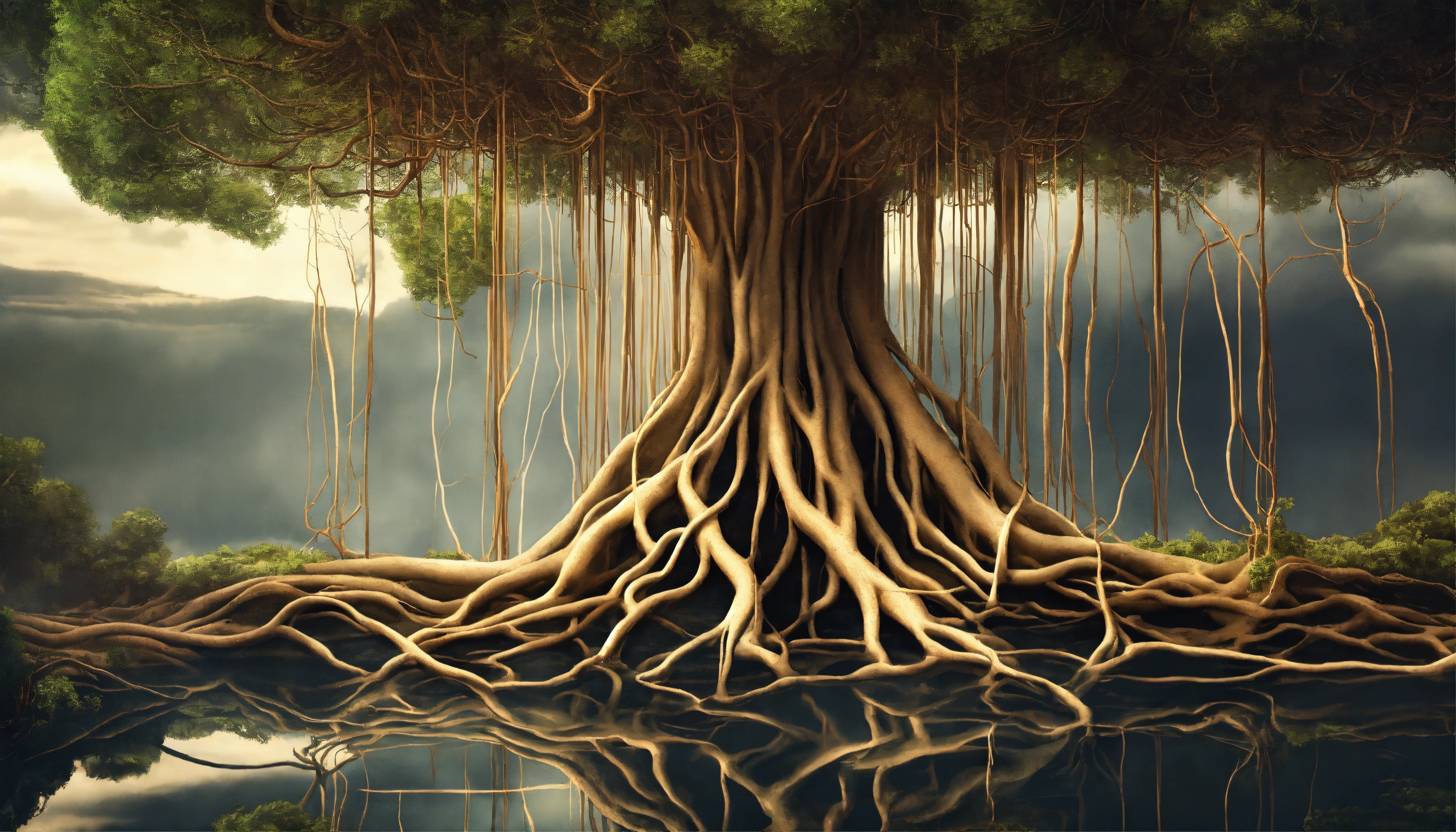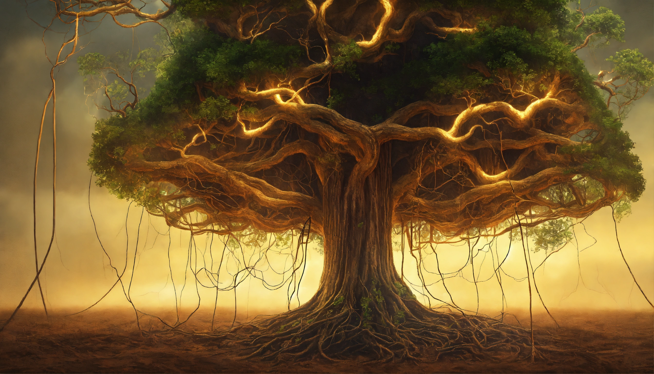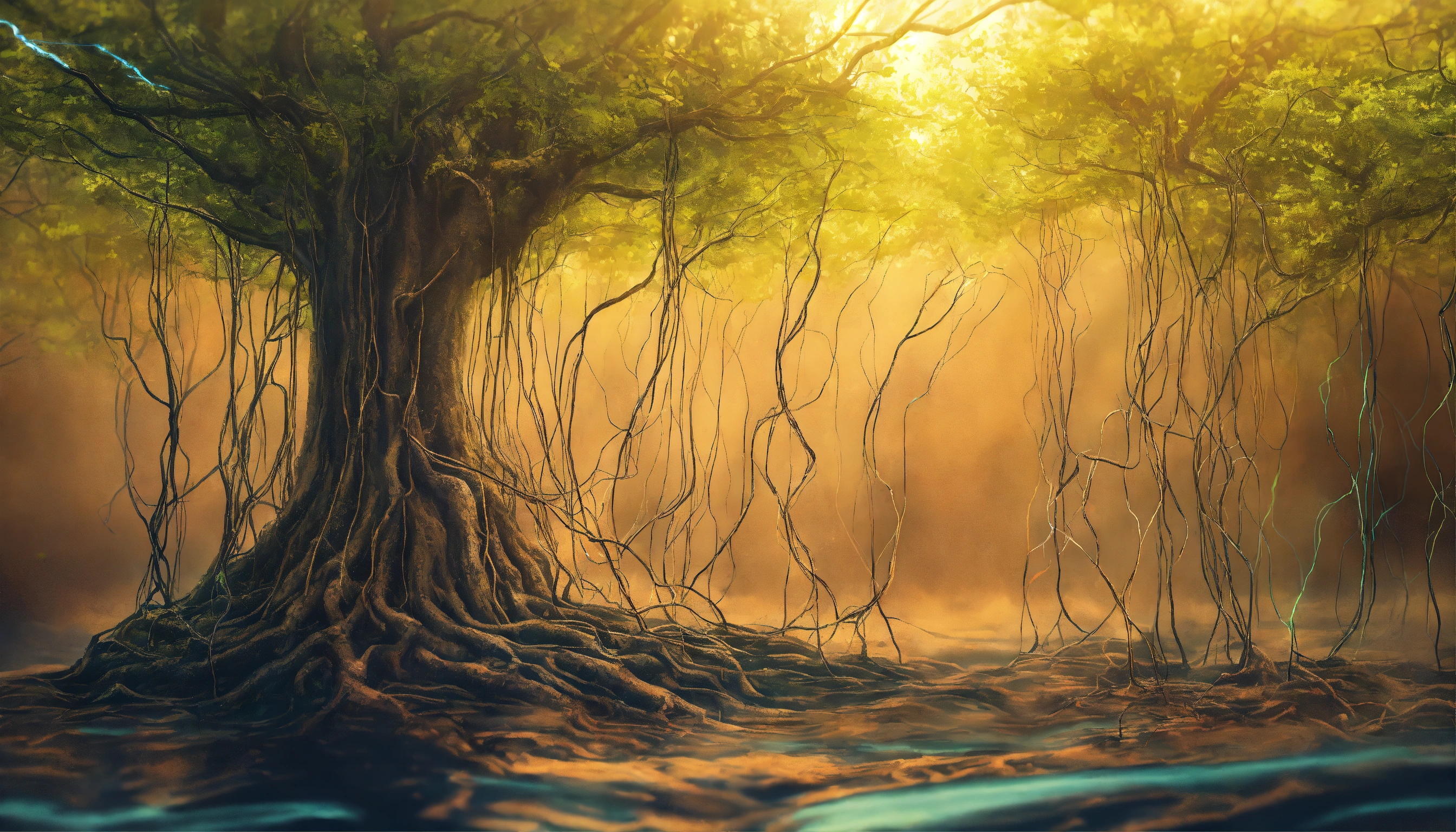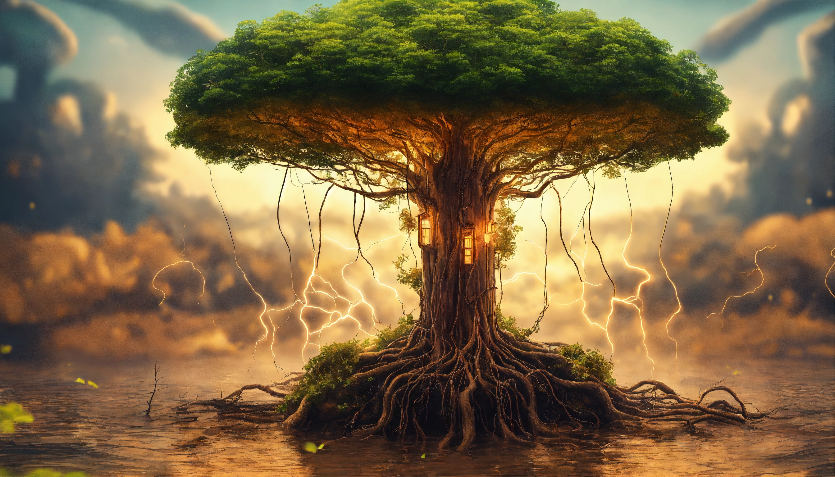 Unrealistic tree roots made of electricity floating in the air in the style of surrealism ai art