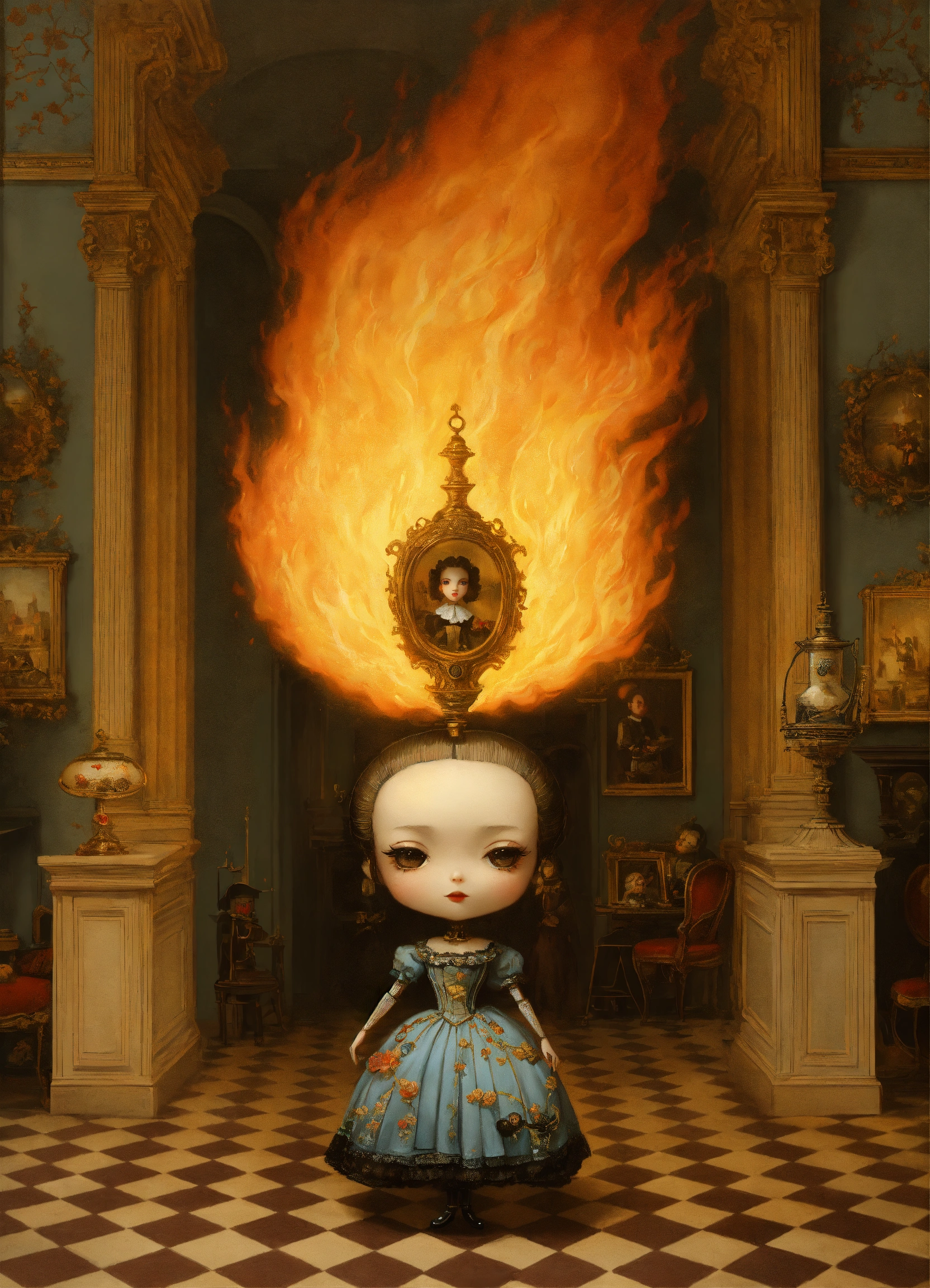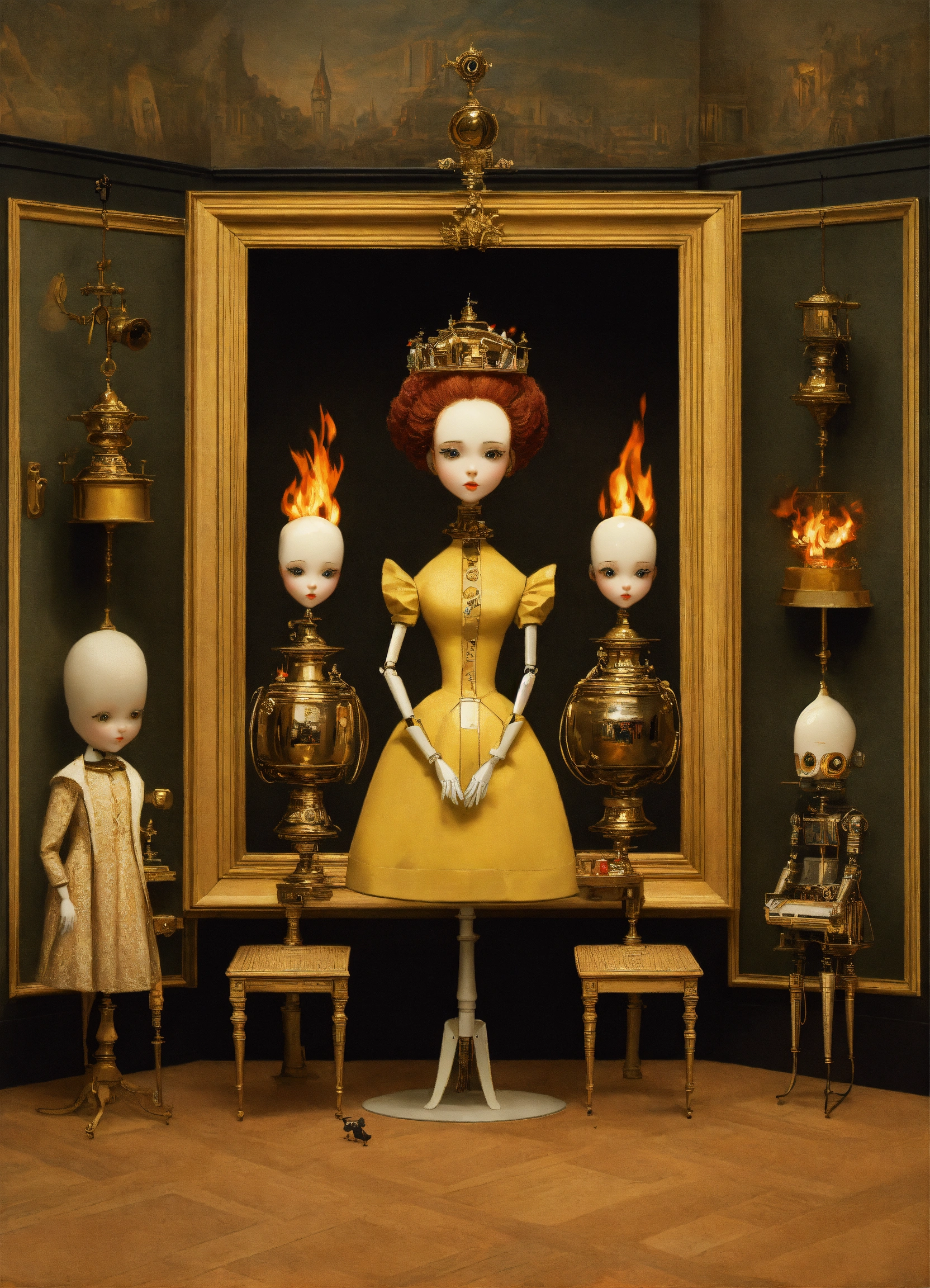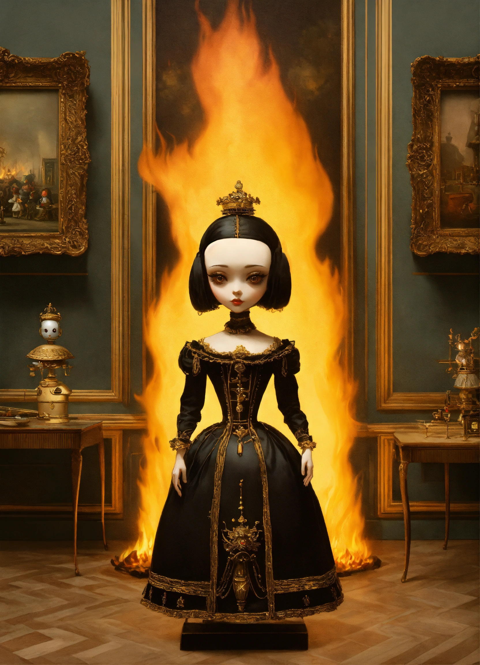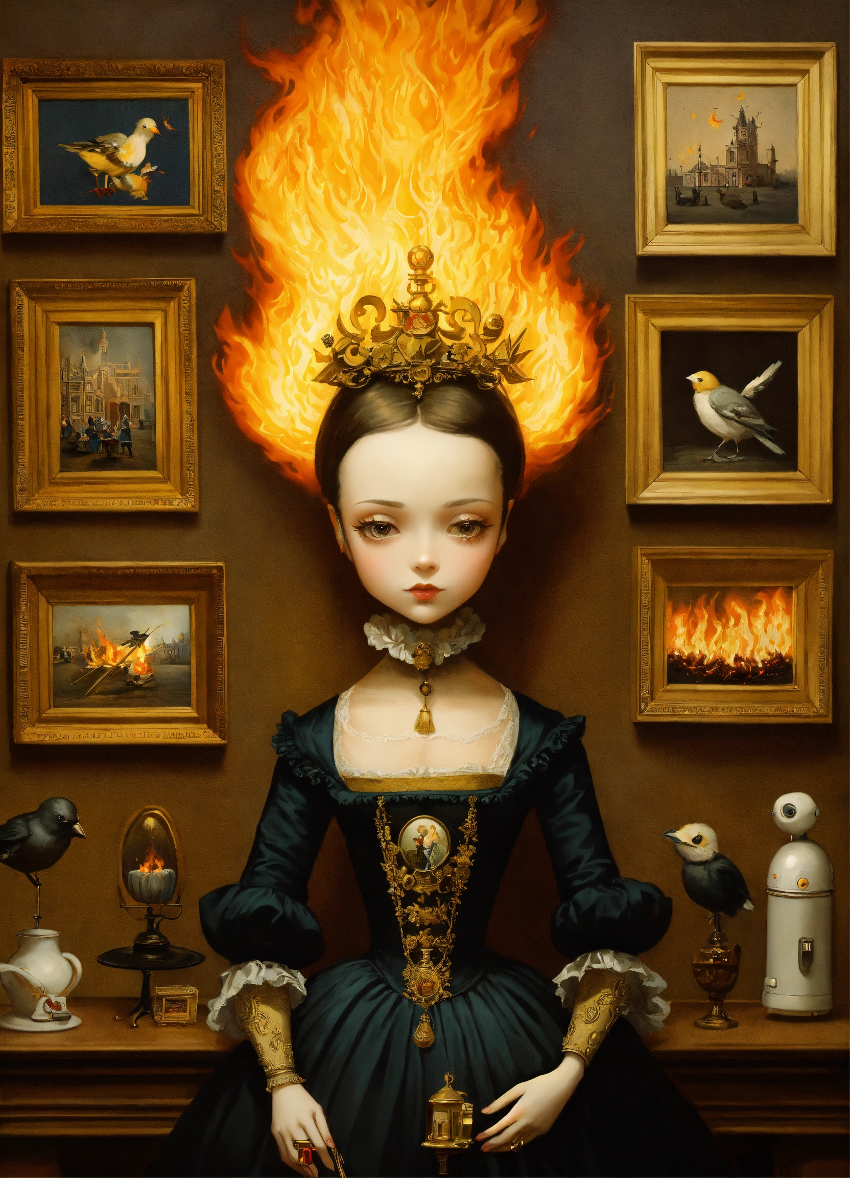 Las meninas made by robots, birds flyng on fire, flames, victorian age, black and gold details by mark ryden
