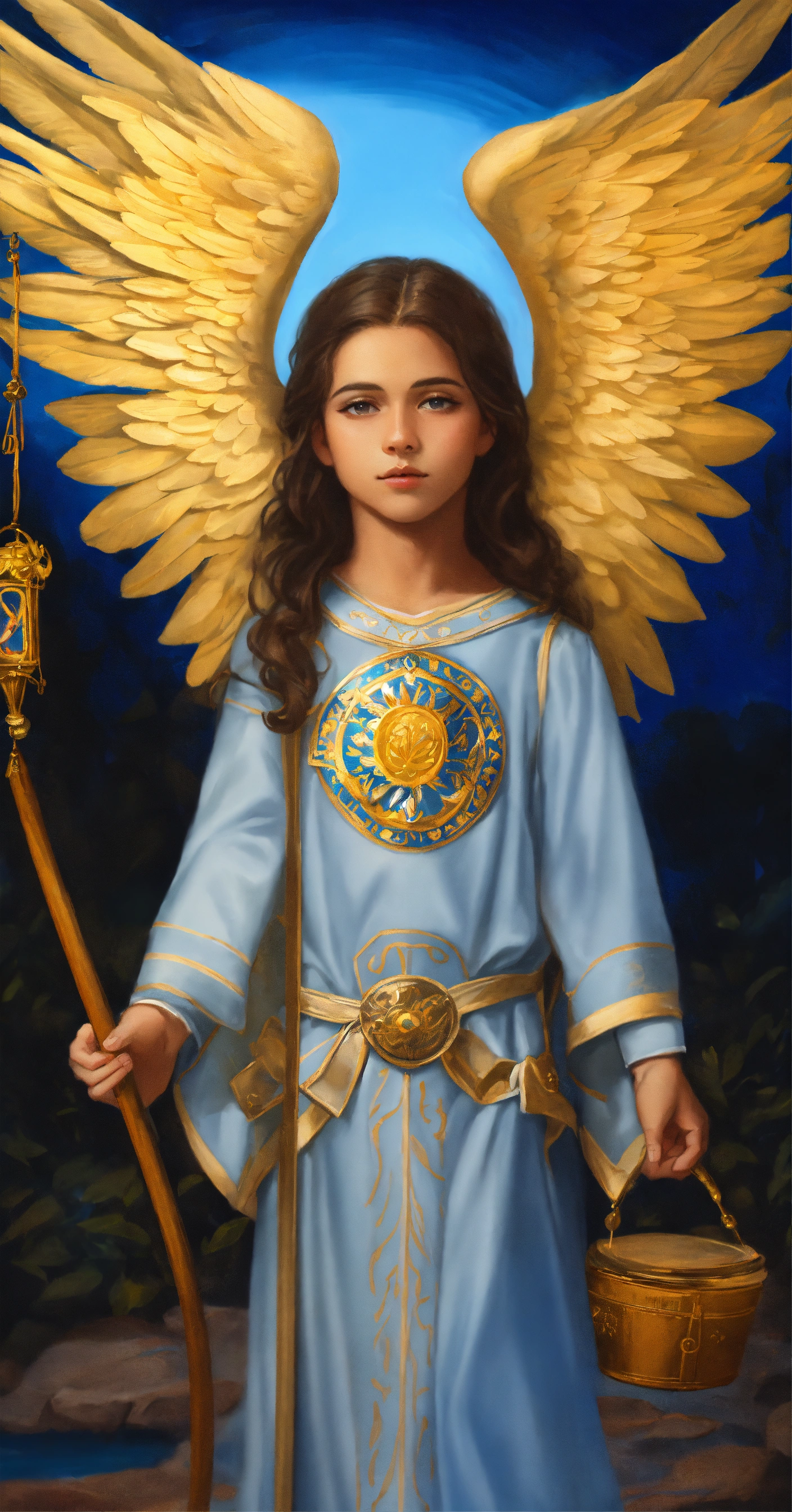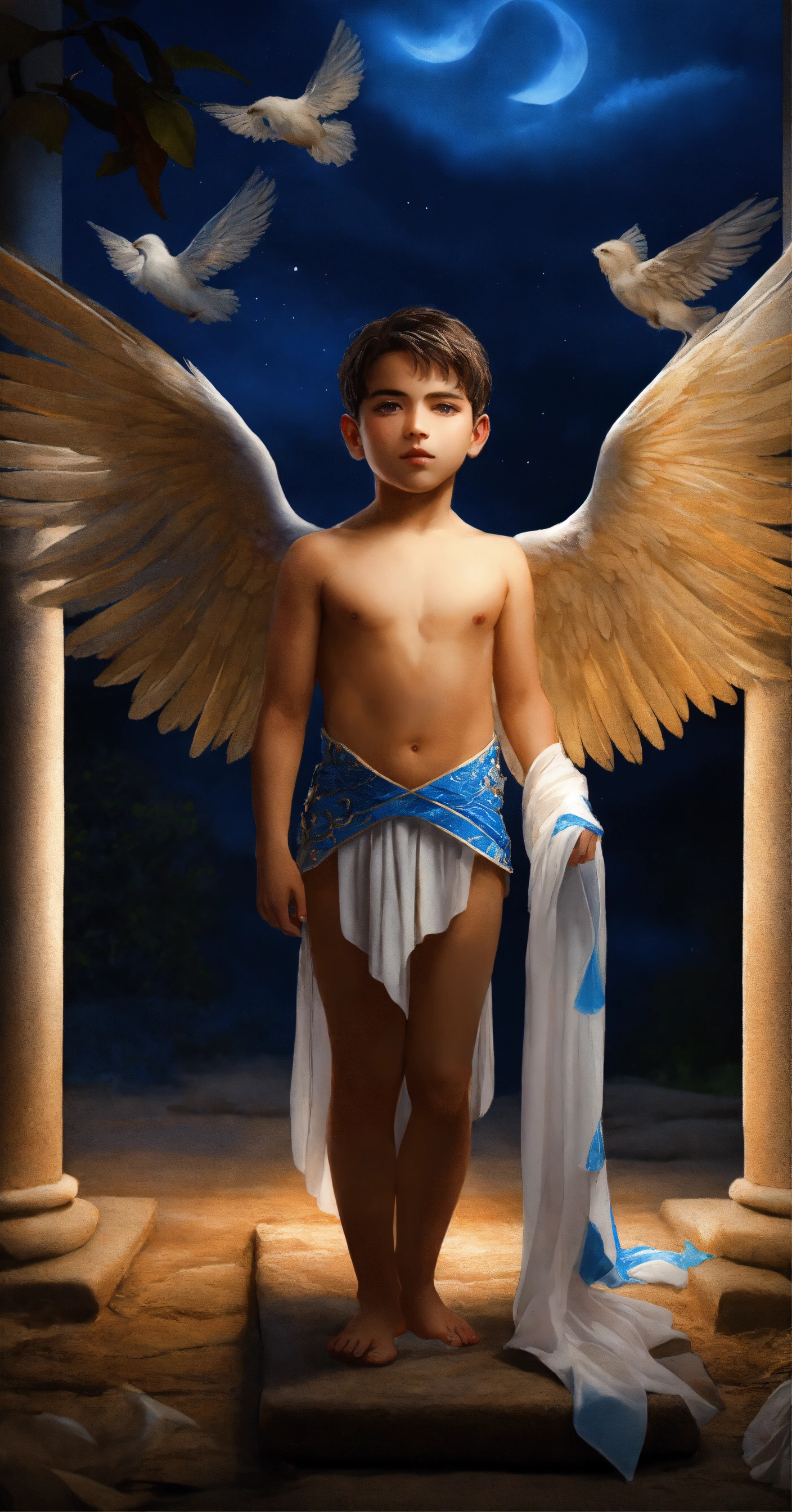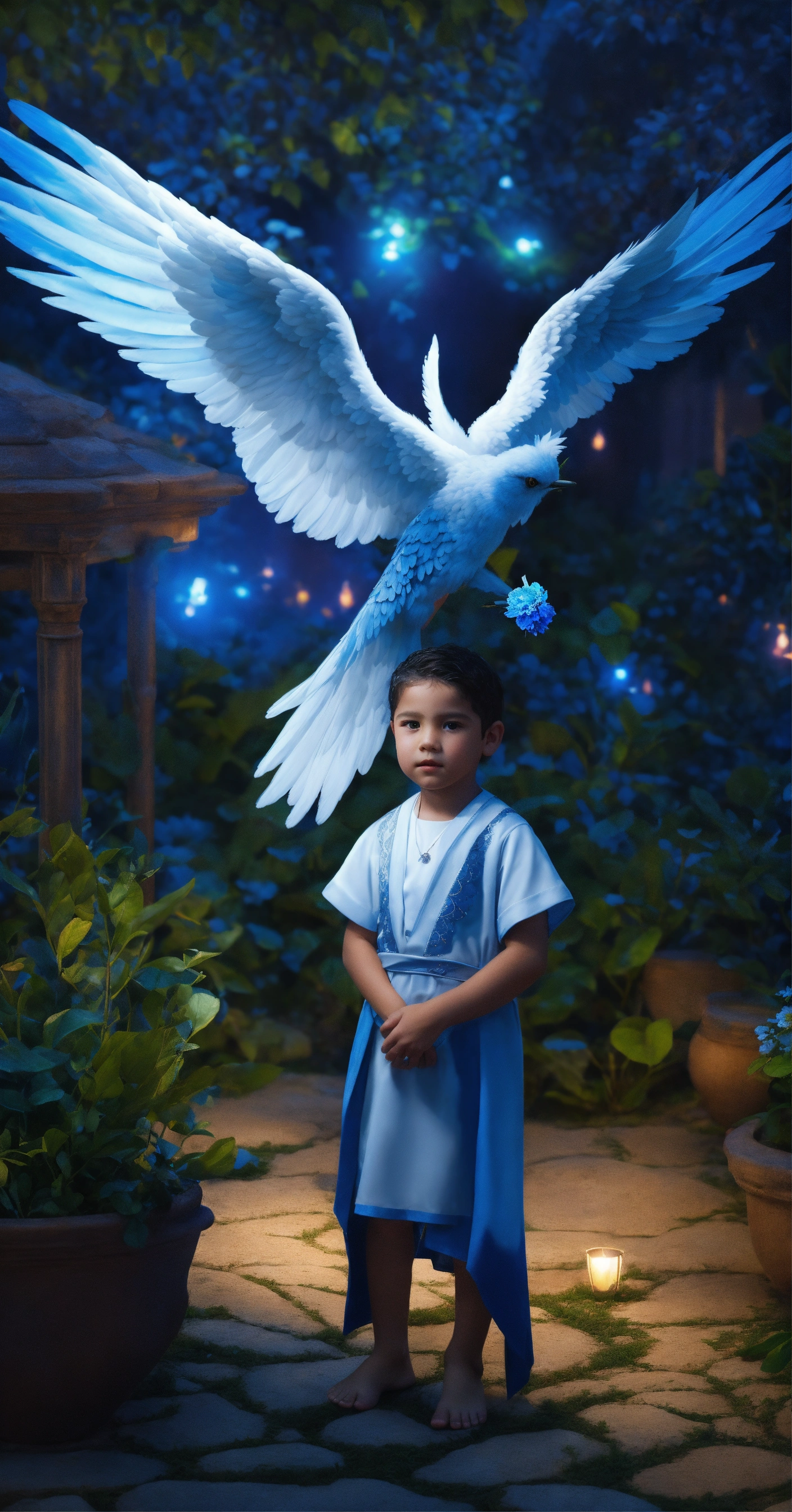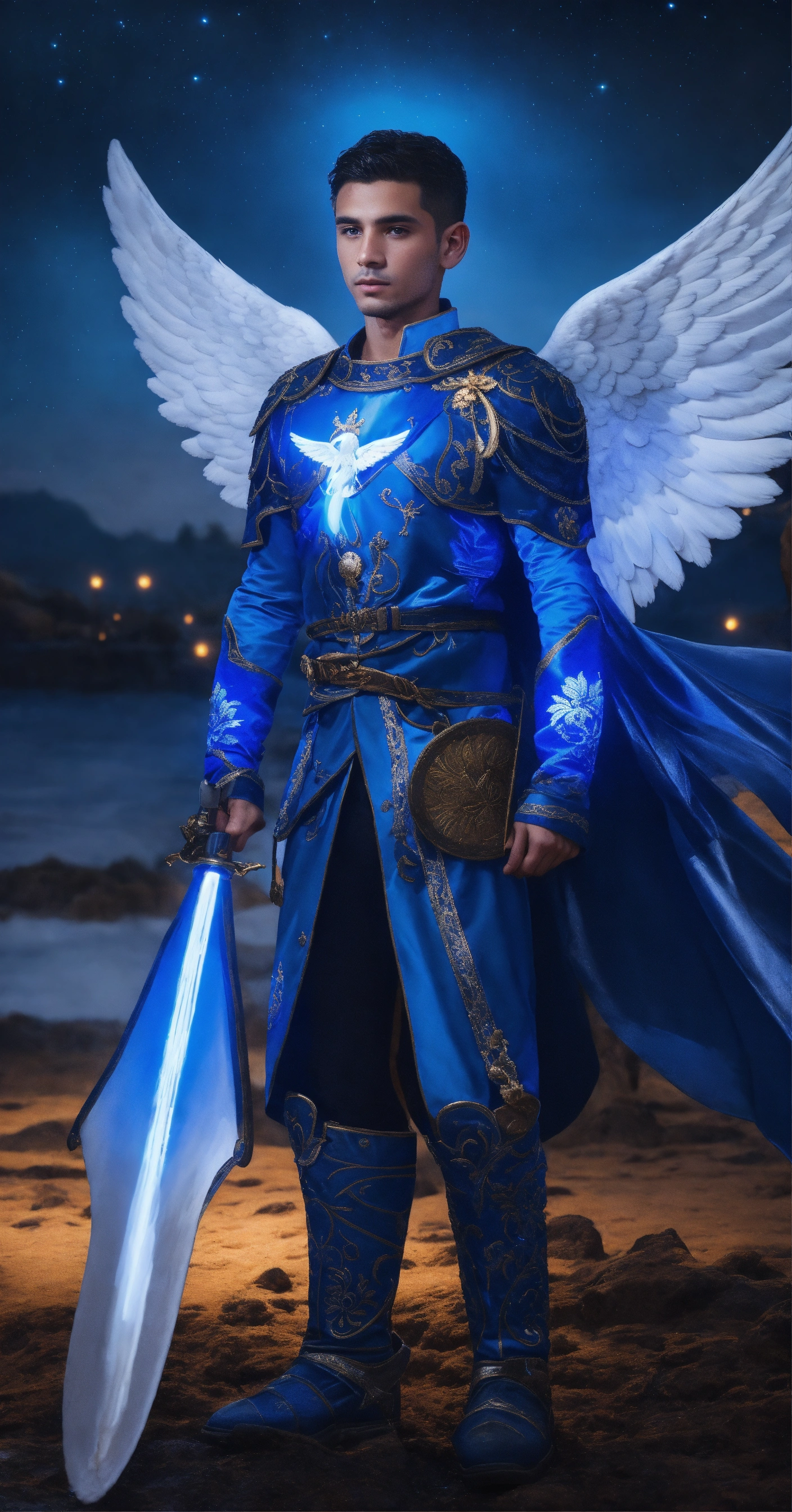 2 arcangel miguel varones con alas de angel de color azul detalladas y luminosas. 1 arcangel miguel varon de 30 años protegiendo a un niño varon angel de 9 años. los 2 arcangeles miguel varones tienen alas azules luminosas grandes y uniformes . sus rostros bellos y detallados. ojos muy claros que se abren con una mirada profunda y penetrante. cabello blanco detallado y varonil. vestidos tipo túnica de color blanco con muchos detalles azules con plateado. están en un jardín hermoso y detallado con un firmamento nocturno. ilustracion hiperdetallada, hiperrealista. realismo. obra maestra. arte digital, hd, alta calidad. alta definición, alta definición. 8k.