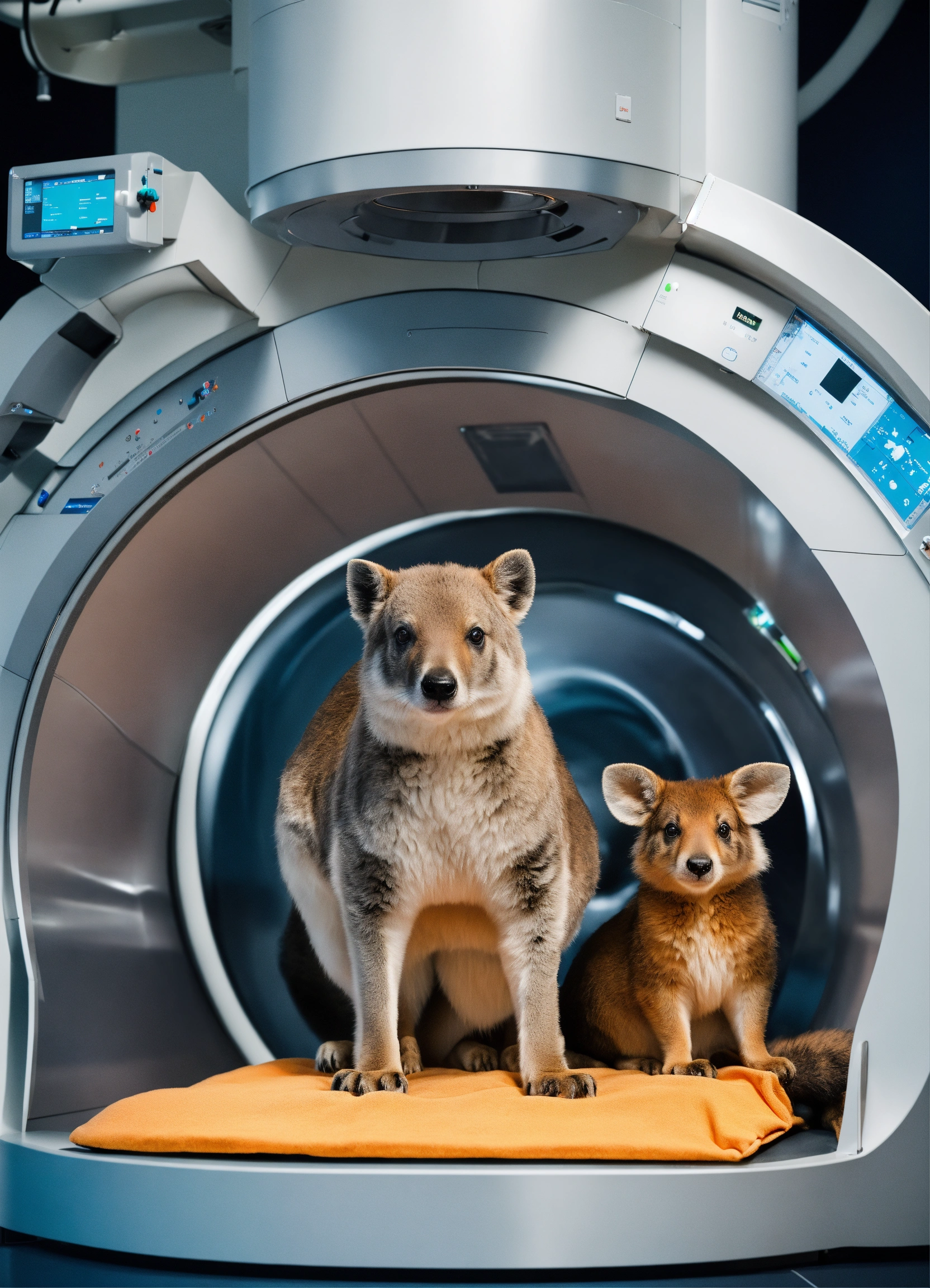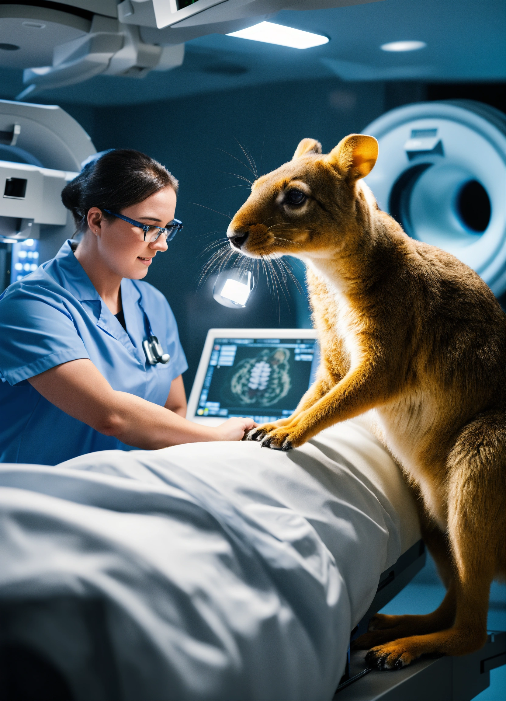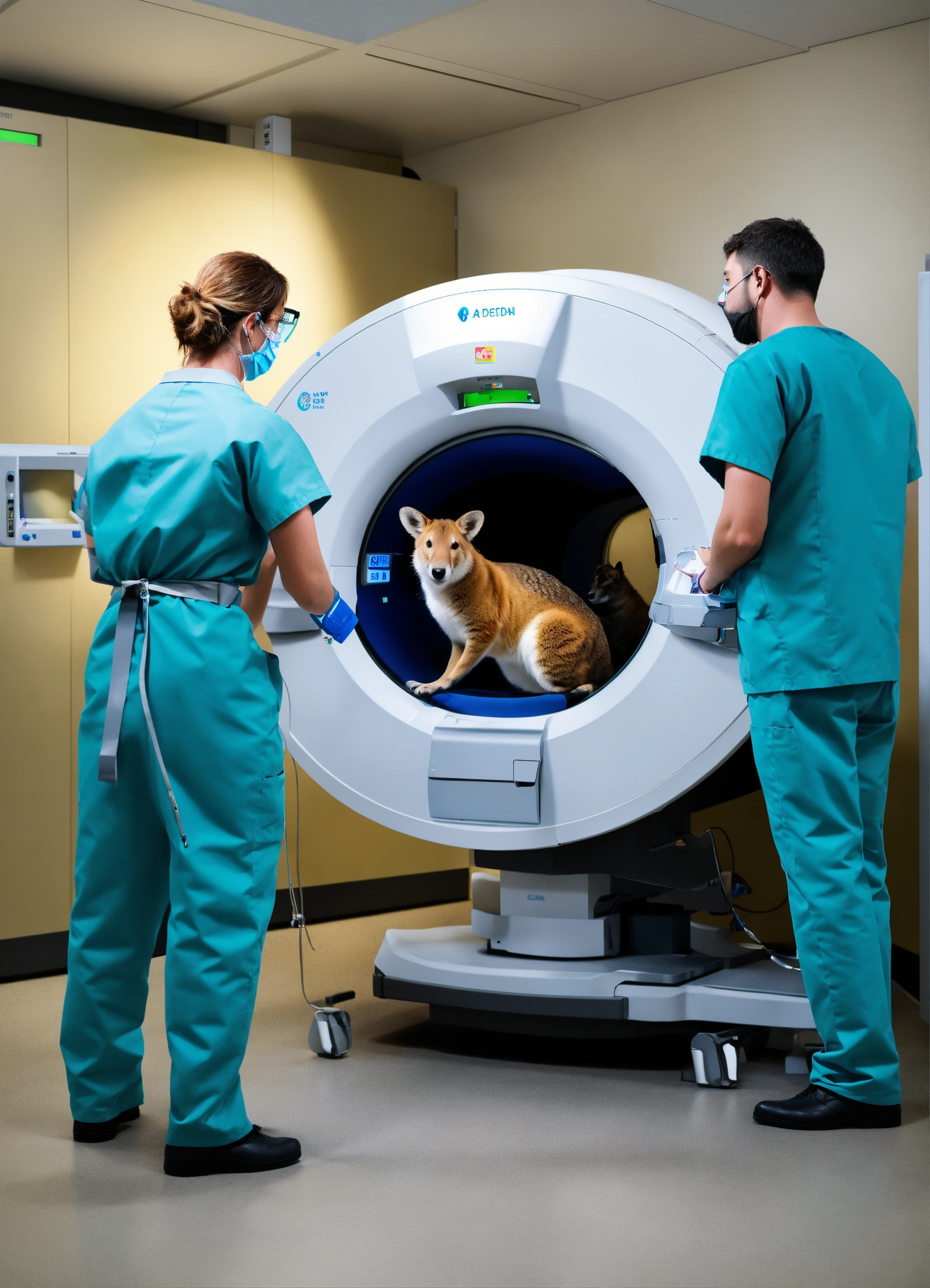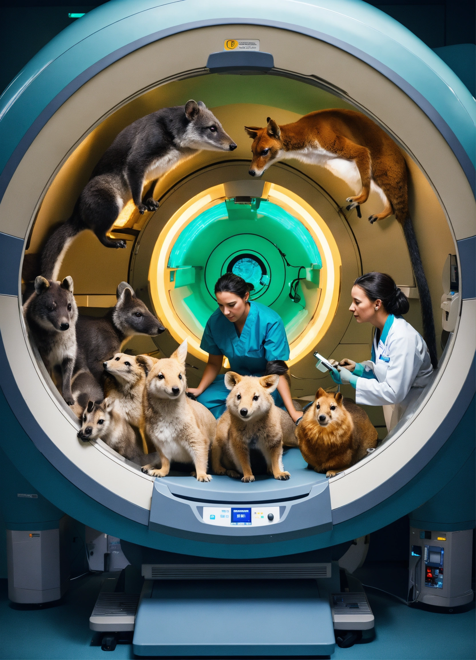 A photo-realistic team of different australian animals working together as radiographers in a ct scanner