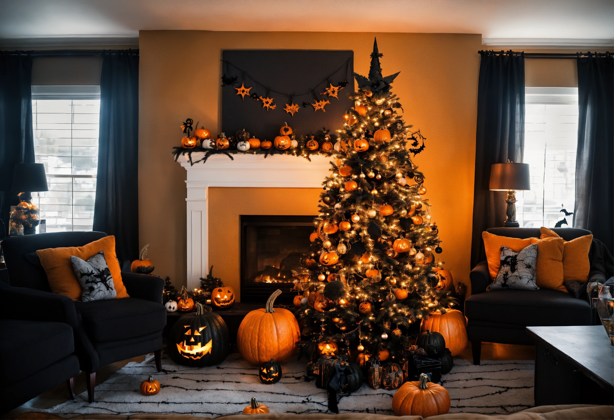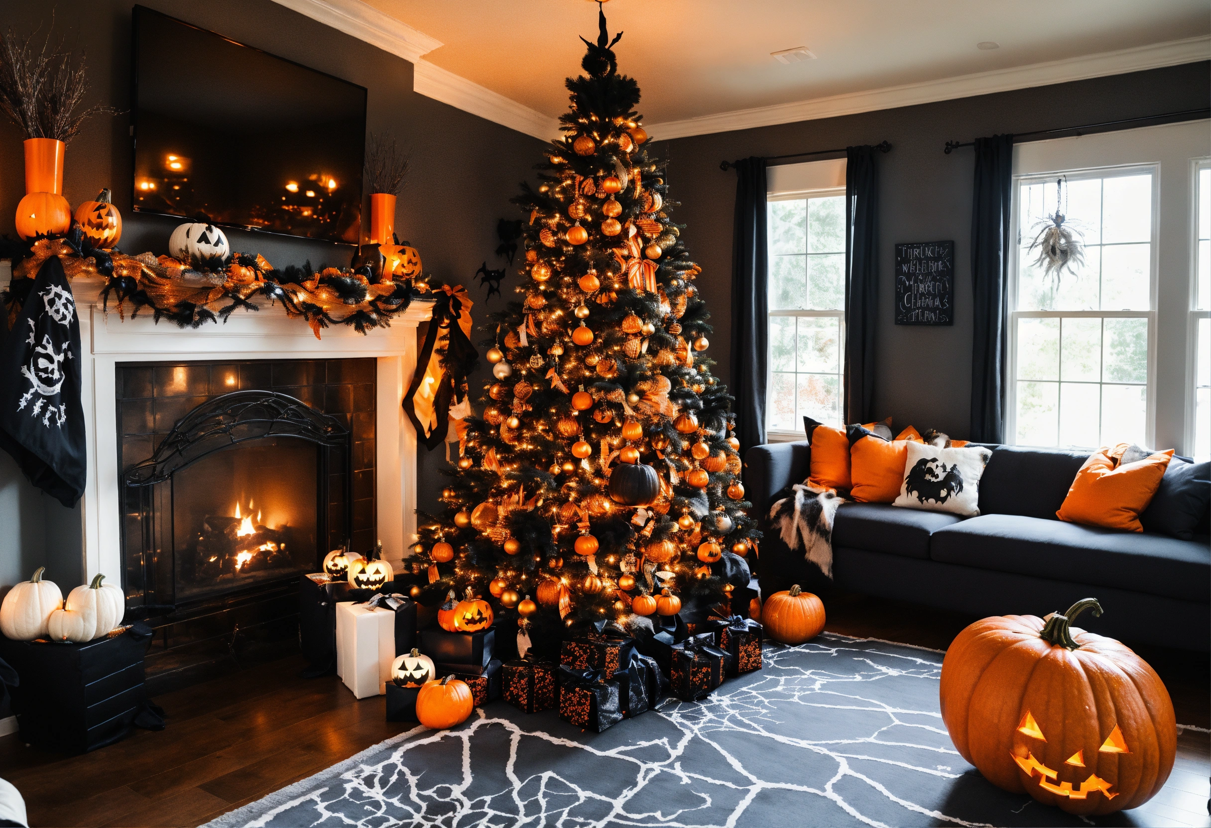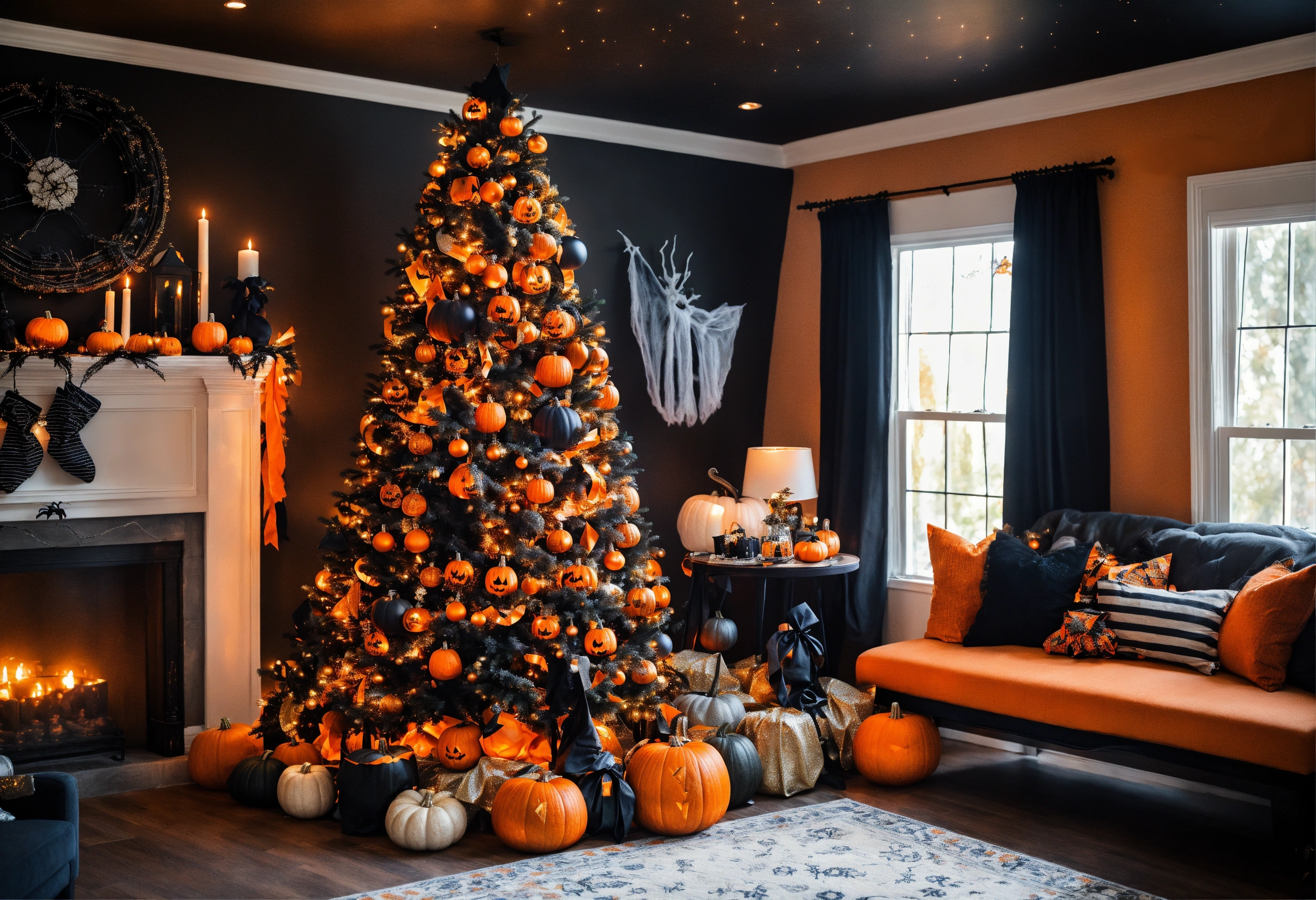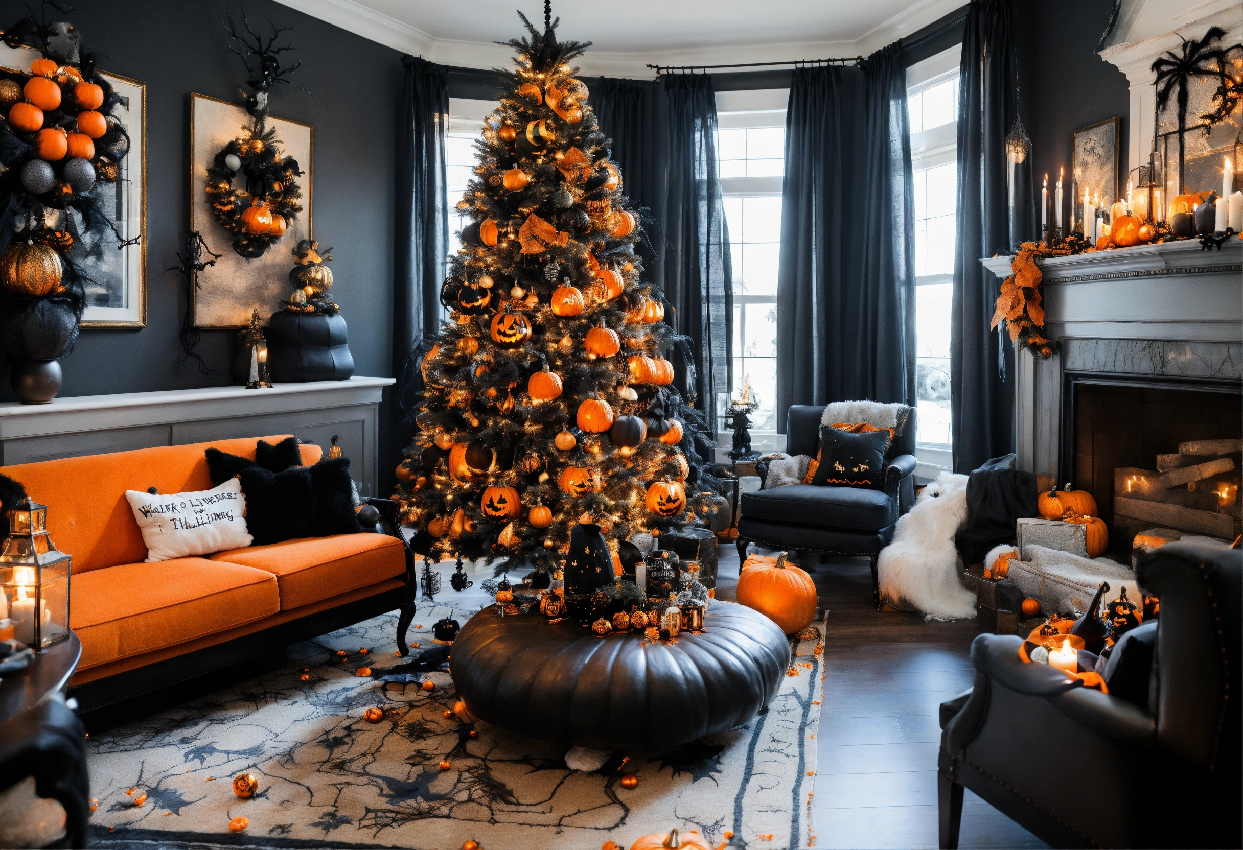 Halloween christmas tree, interior design of the living room filled with wicked halloween decor, black christmas tree with orange ornaments