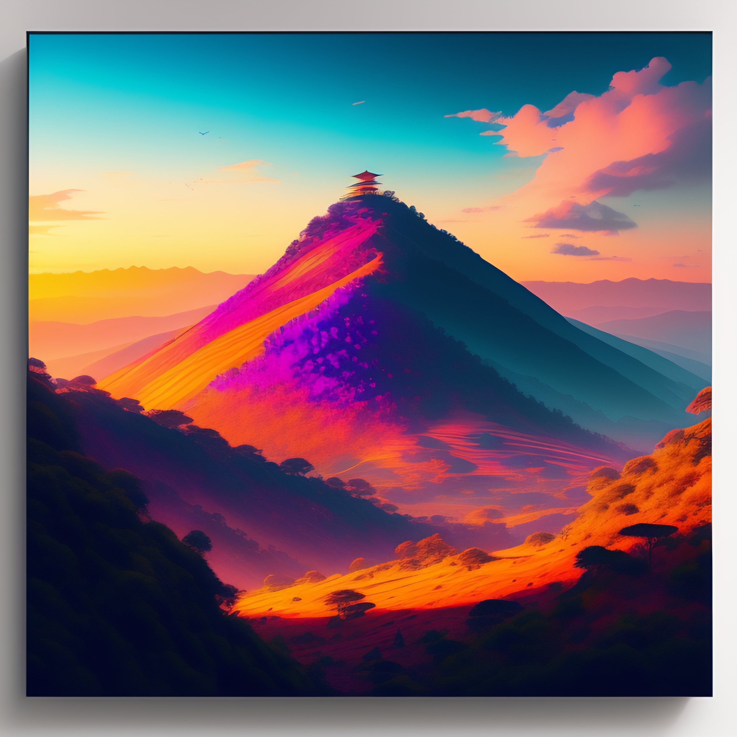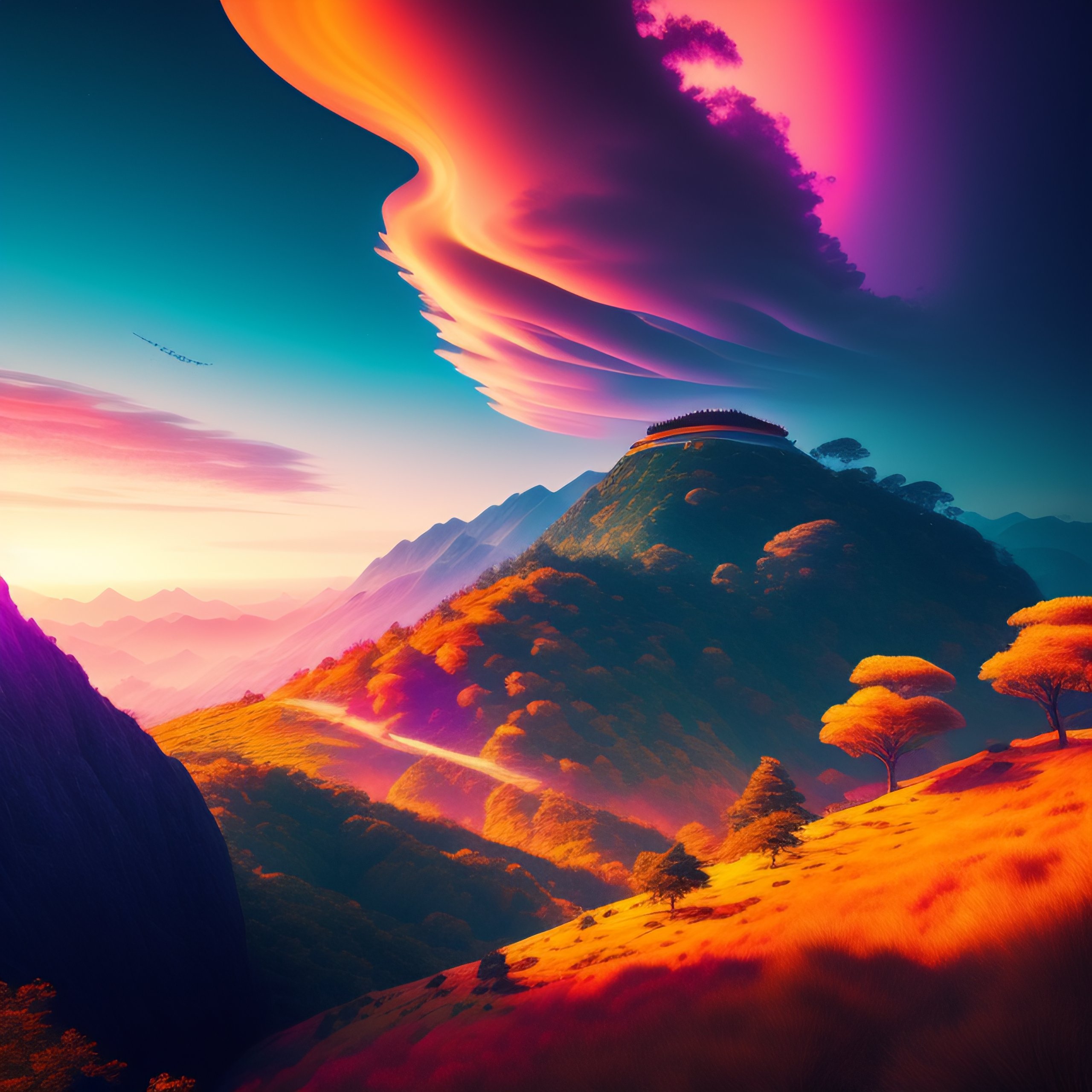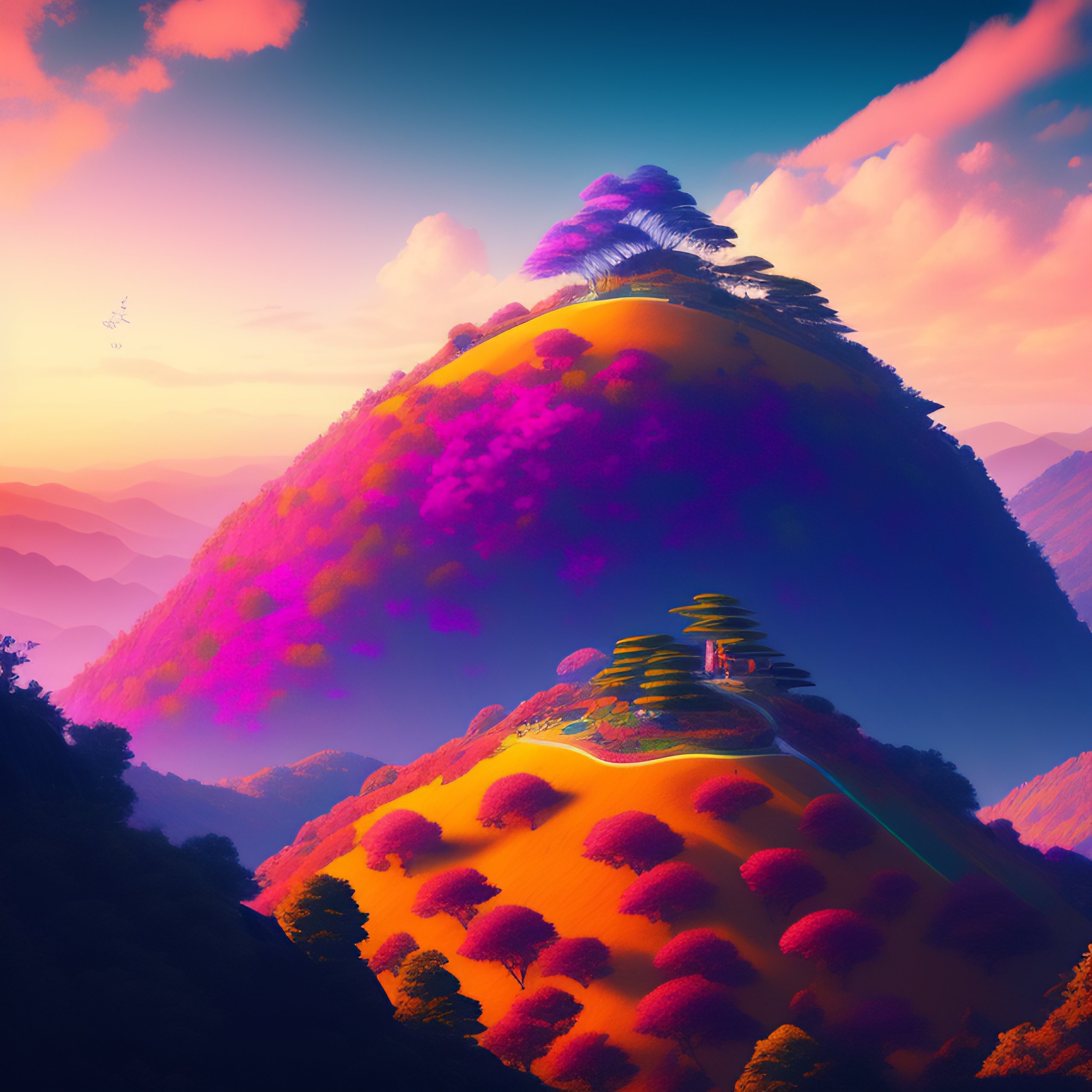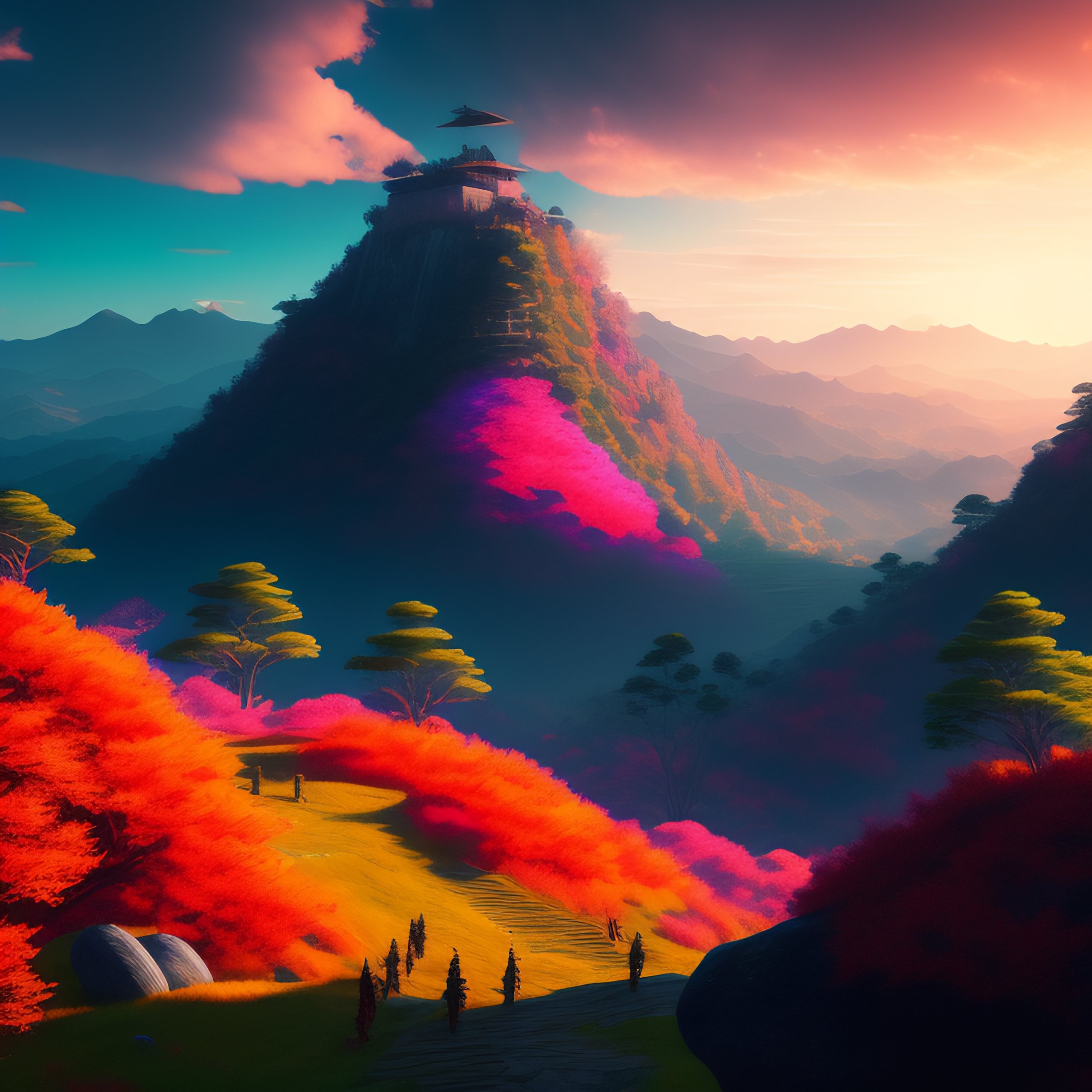 Upscaled hyperdetailed portrait of an epic and dramatic stunning hillside color-ritual scene with a very few tiny samurai, colorful sky with dramatic clouds, the gaudy jungle at the background, intricate line art, finely detailed art station winner by kilian eng and by jake parker, vibrant colors, winning-award masterpiece, fantastically gaudy, aesthetic octane render, 8k hd resolution