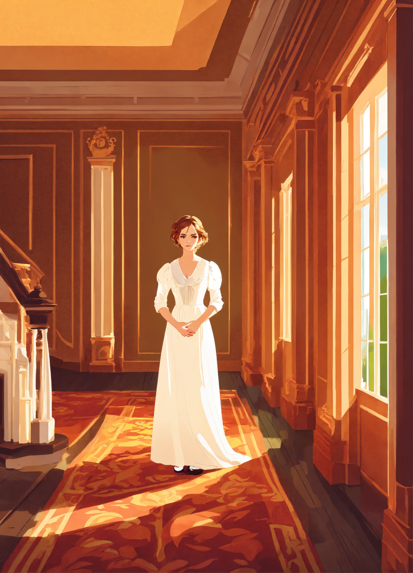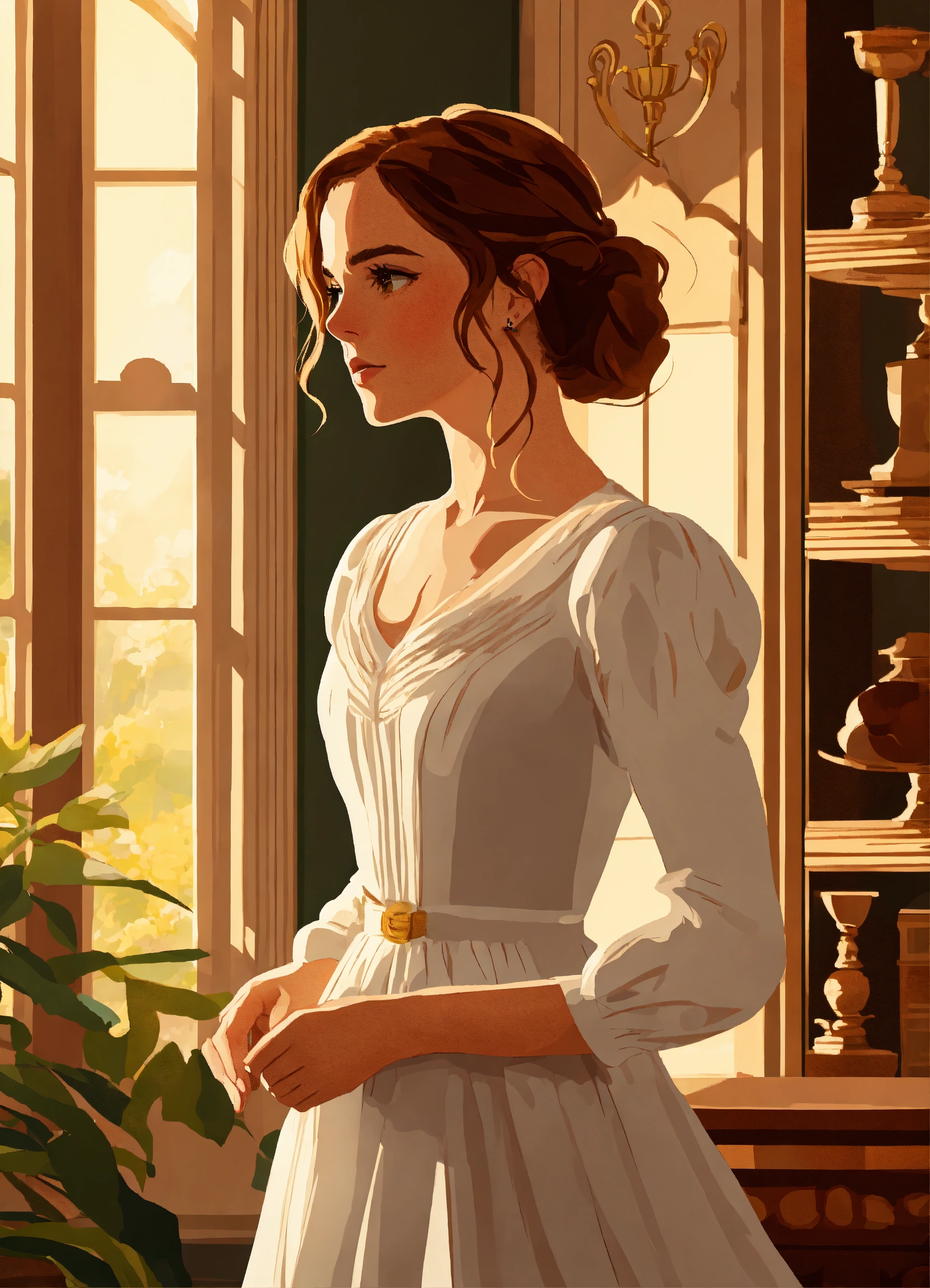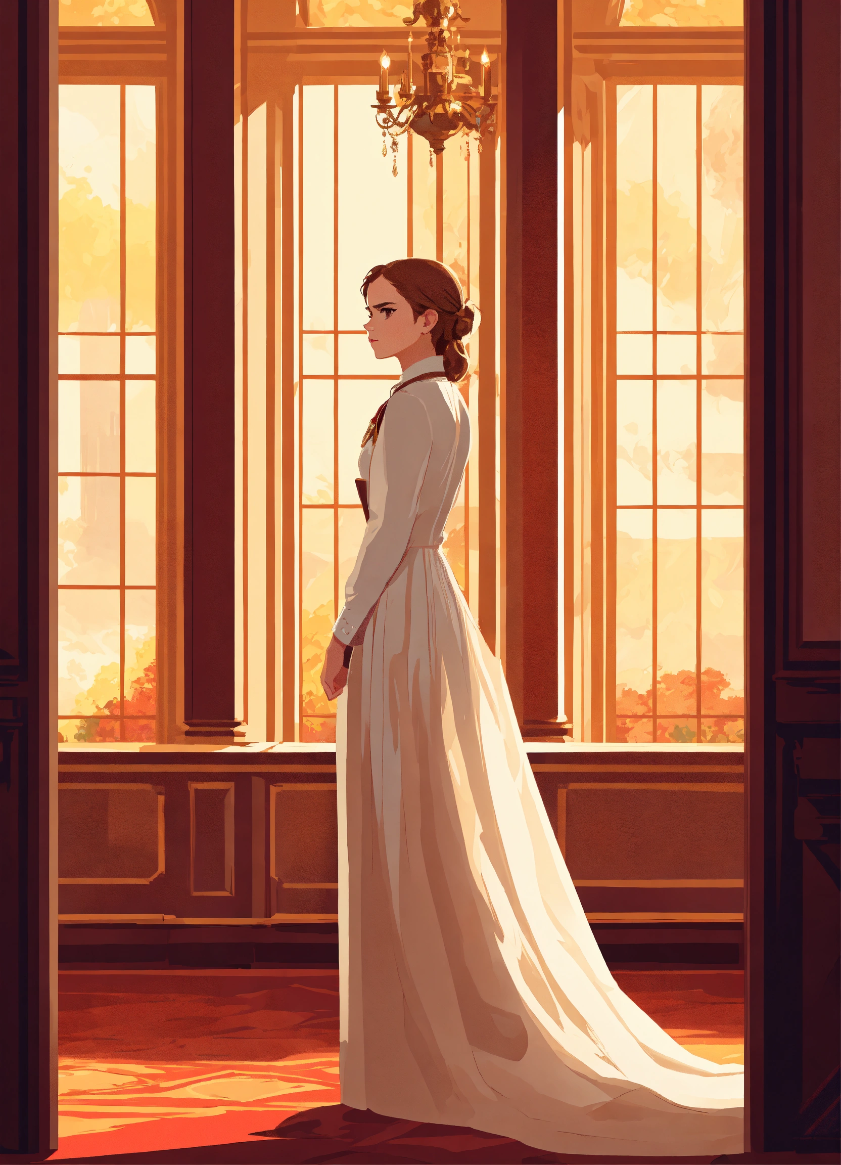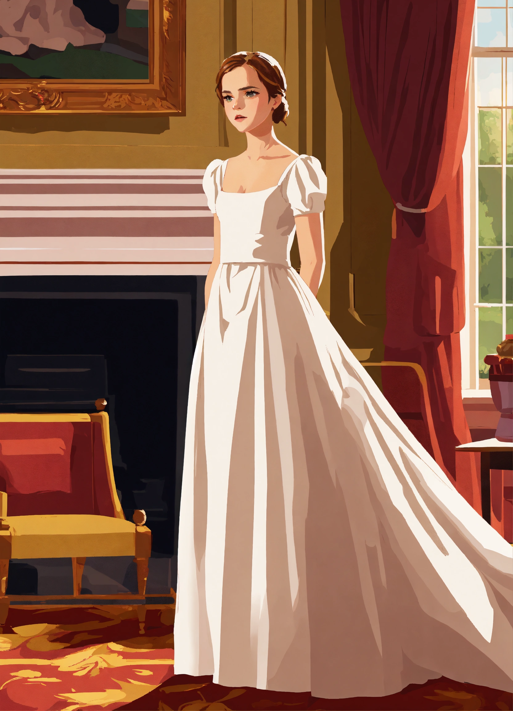 Movie scene of emma watson as hermione granger in a white regency dress indoors a sophisticated country estate. flat design poster, not too complex, modern, 4k, epic composition, flat vector art illustration, very realistic, vibrant colours, long shot