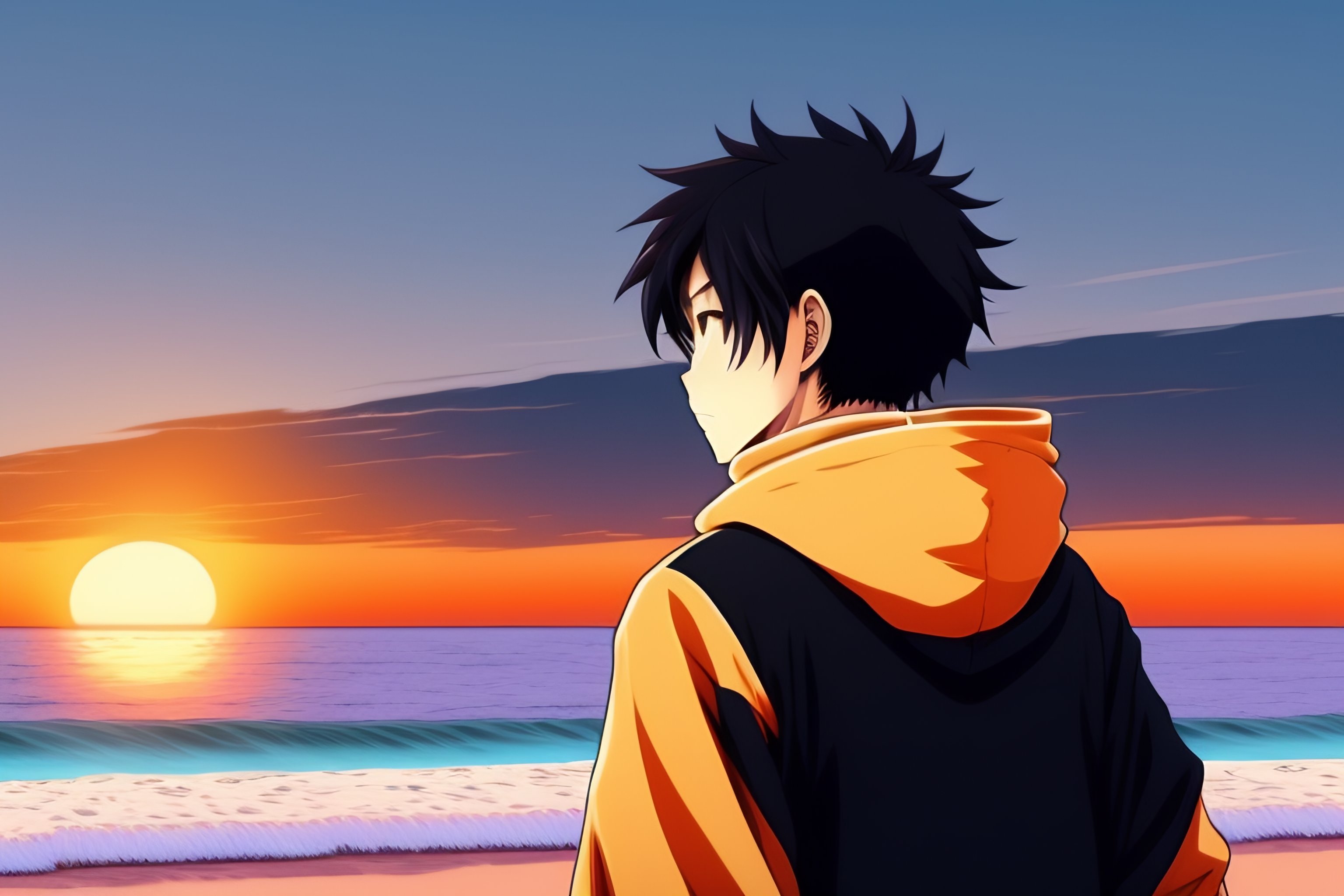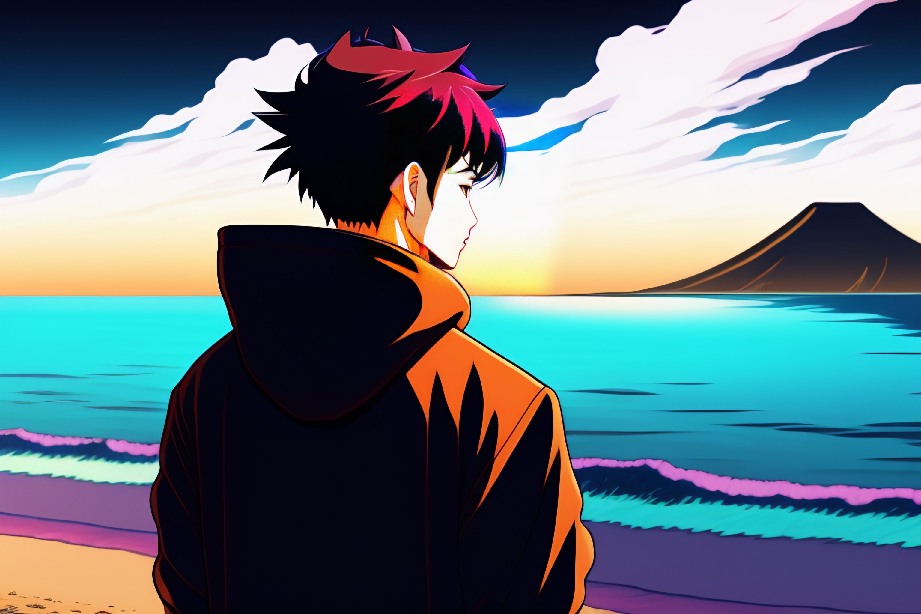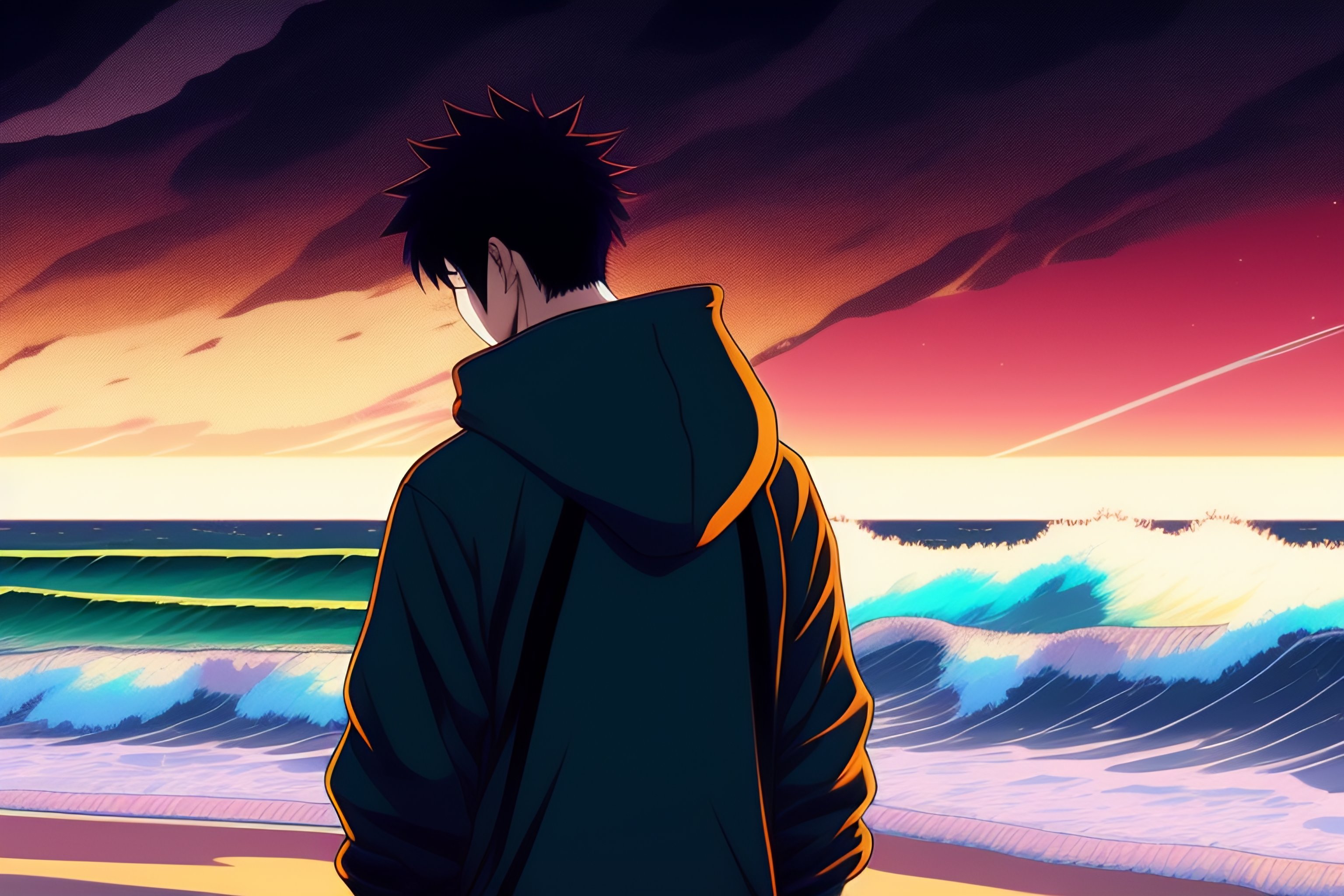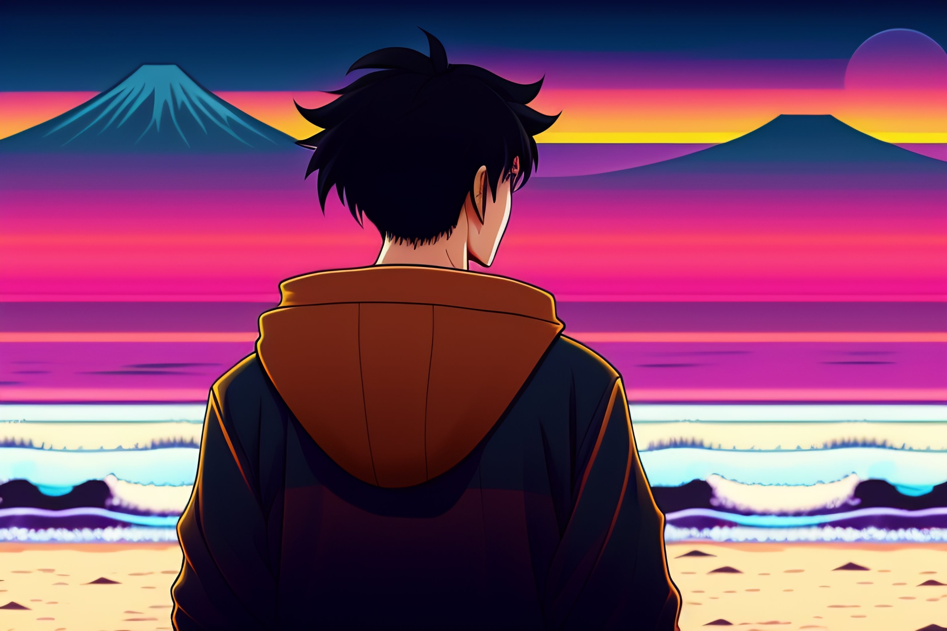 A japanese guy wearing a black hoodie but not wearing a food, standing and showing us his back, looking at the sunset over the ocean at the beach, in the style of 90's vintage anime style. detailed line art.