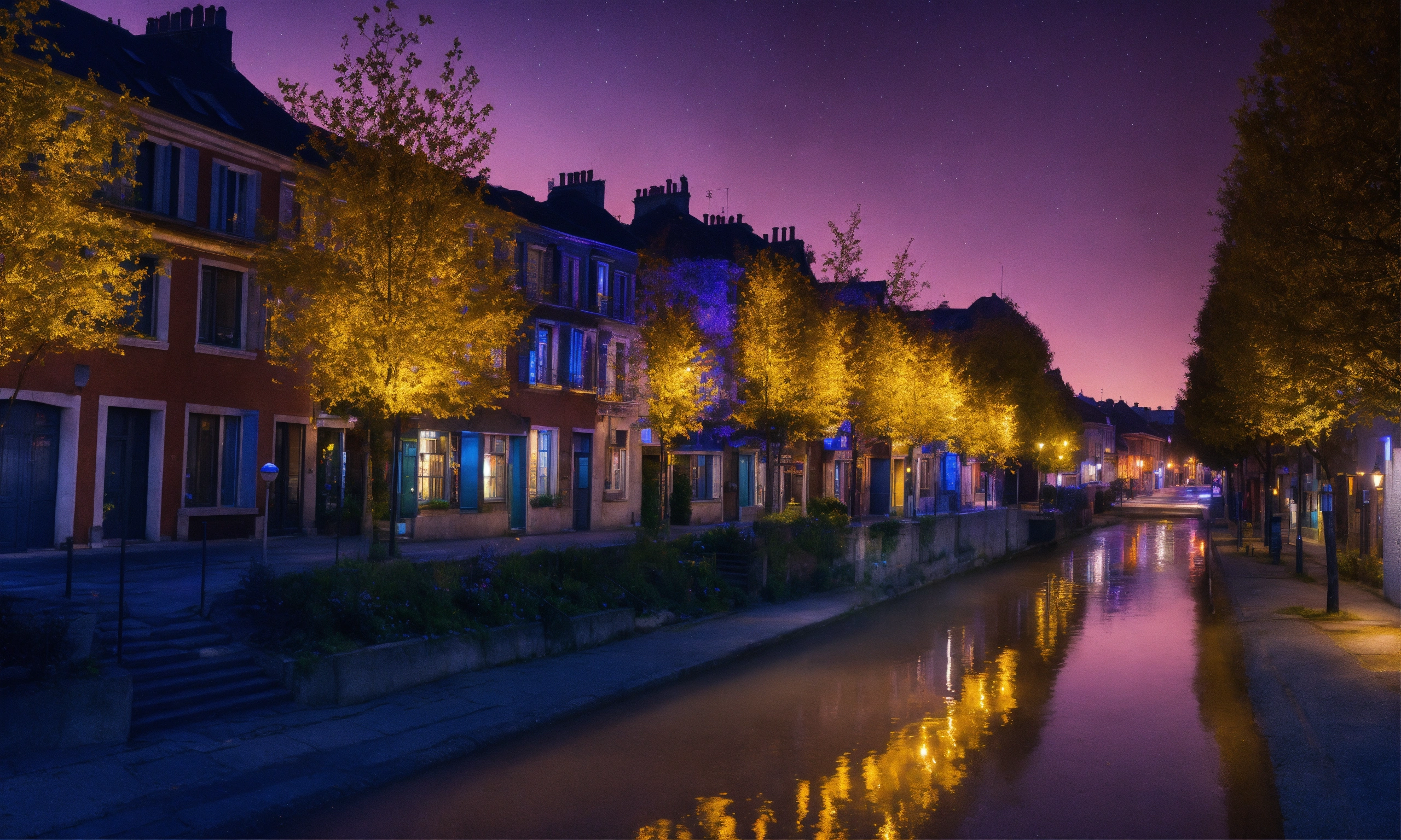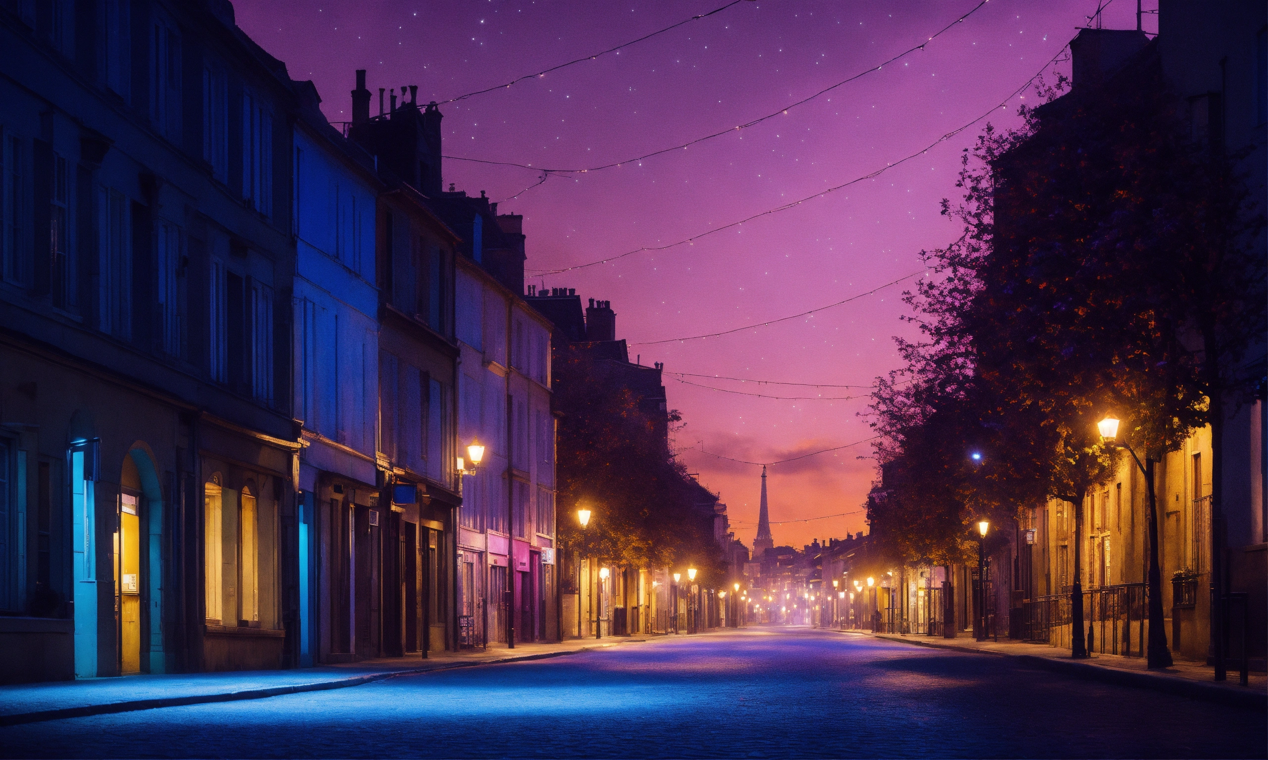 Un paysage urbain nocturne une ville illuminée par les lumières de la nuit, avec des gratte-ciels qui scintillent en bleu, violet et argent. les rues sont baignées d'une lueur orangée des lampadaires, créant une atmosphère mystérieuse. style anim design
