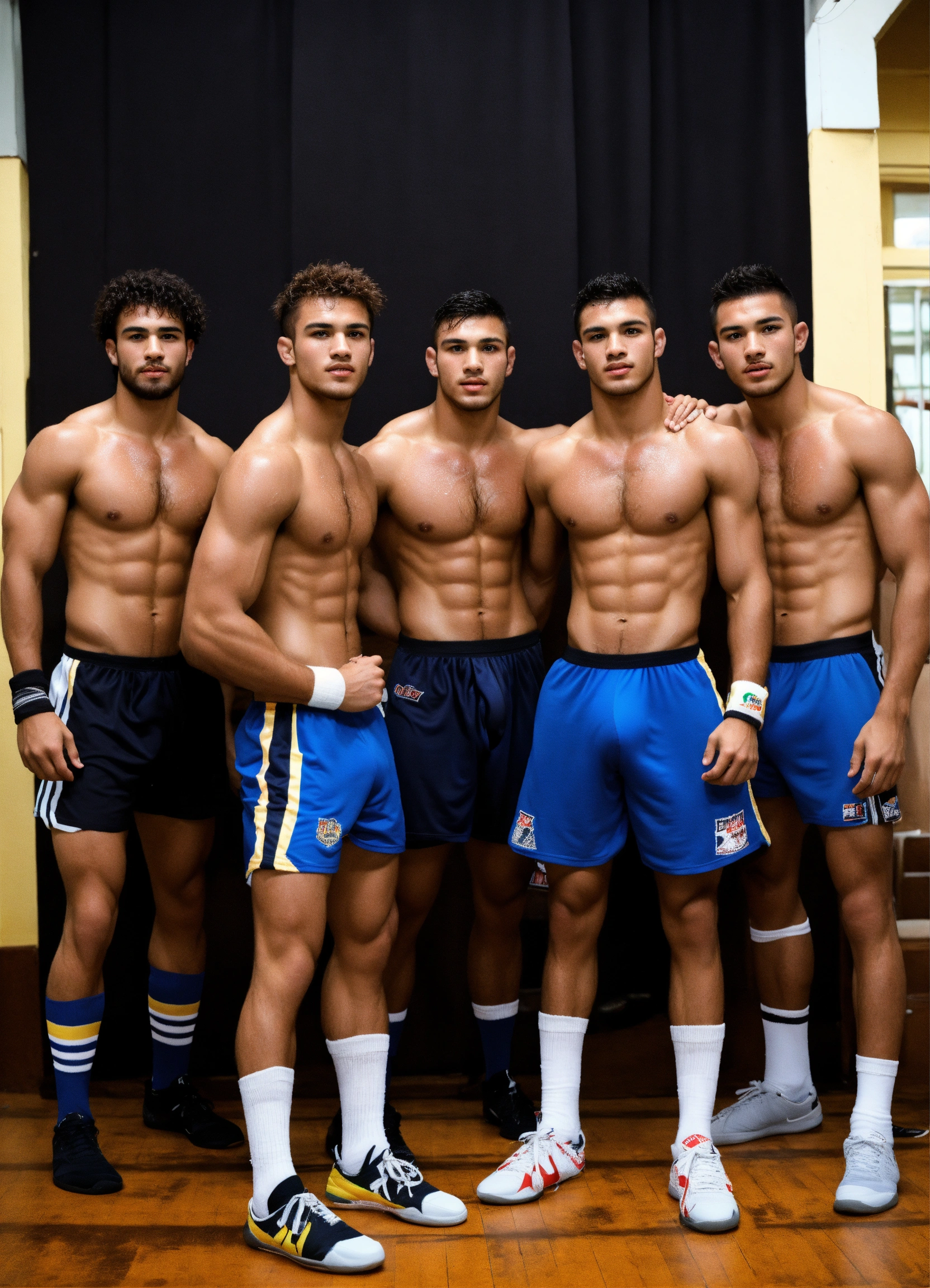 Group of skinny boxer wrestlers young brazilian guys tanned hairy sweaty sporty hunks studs in sporty sock and