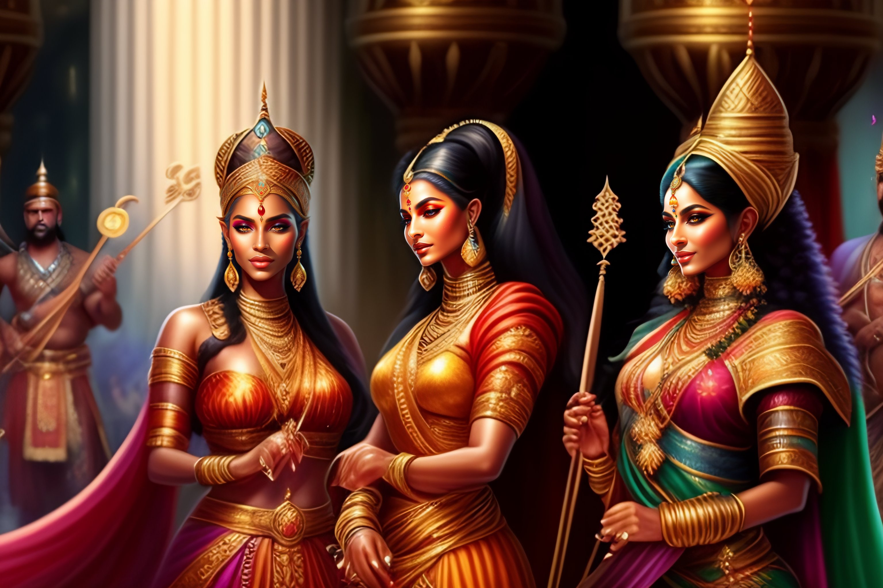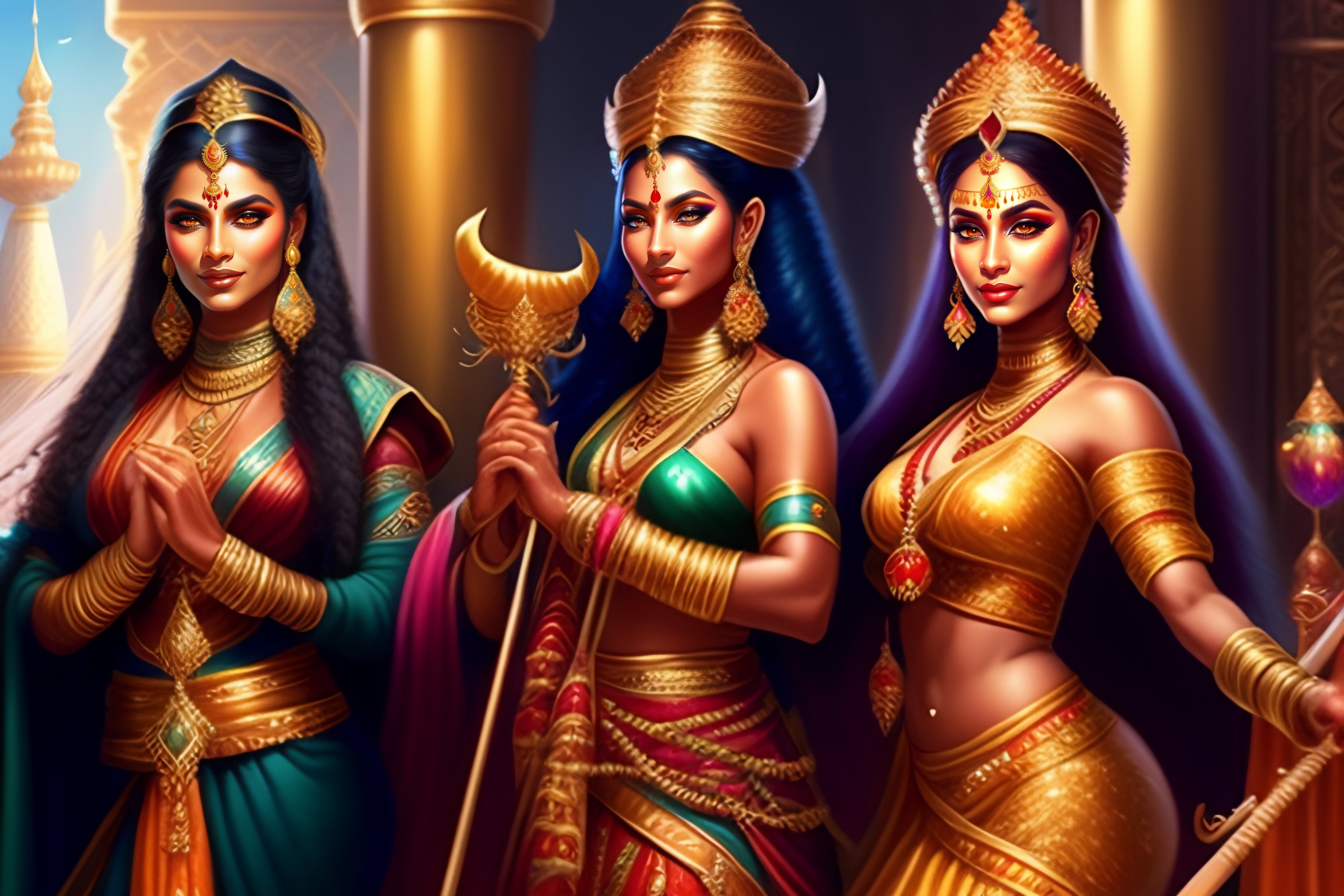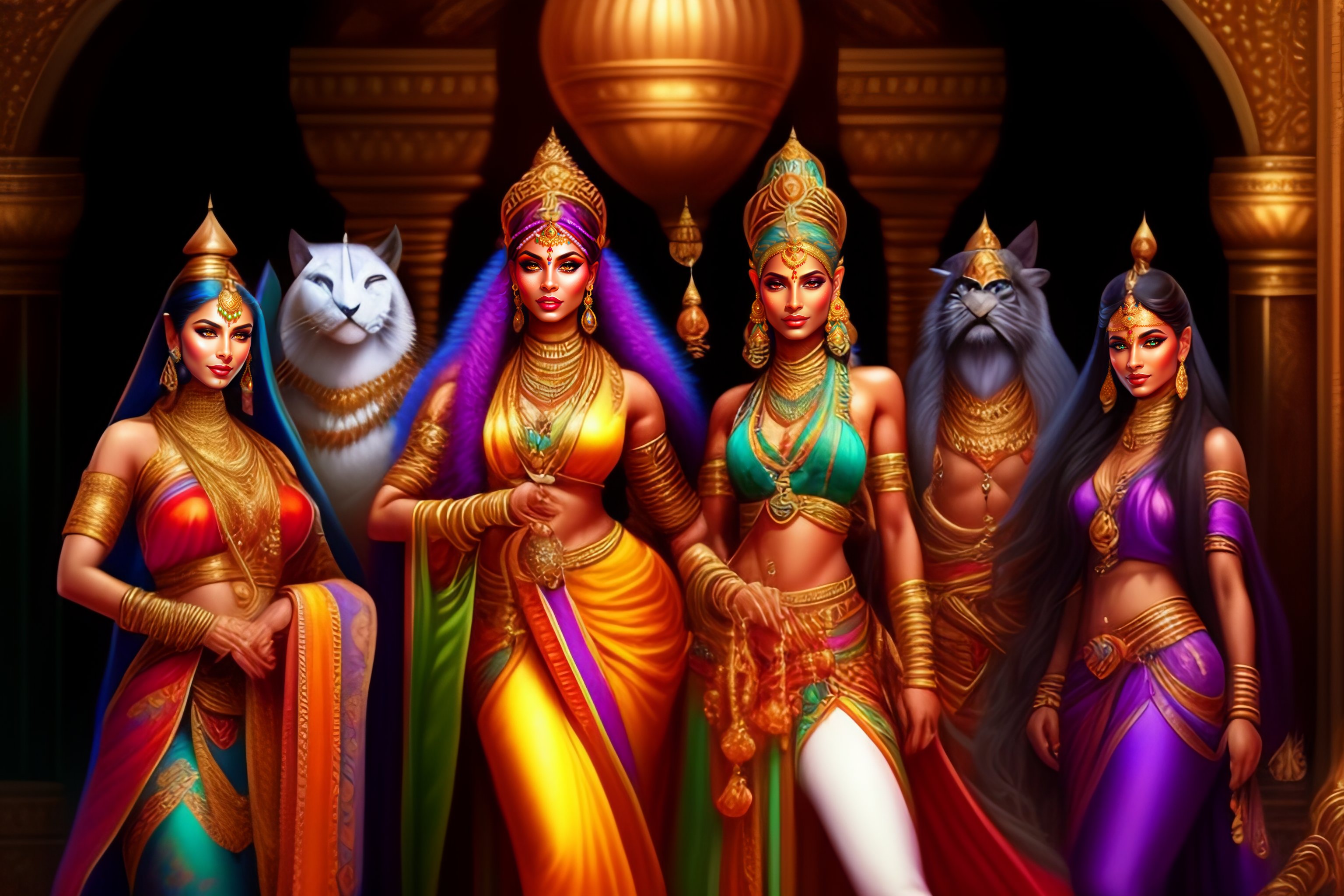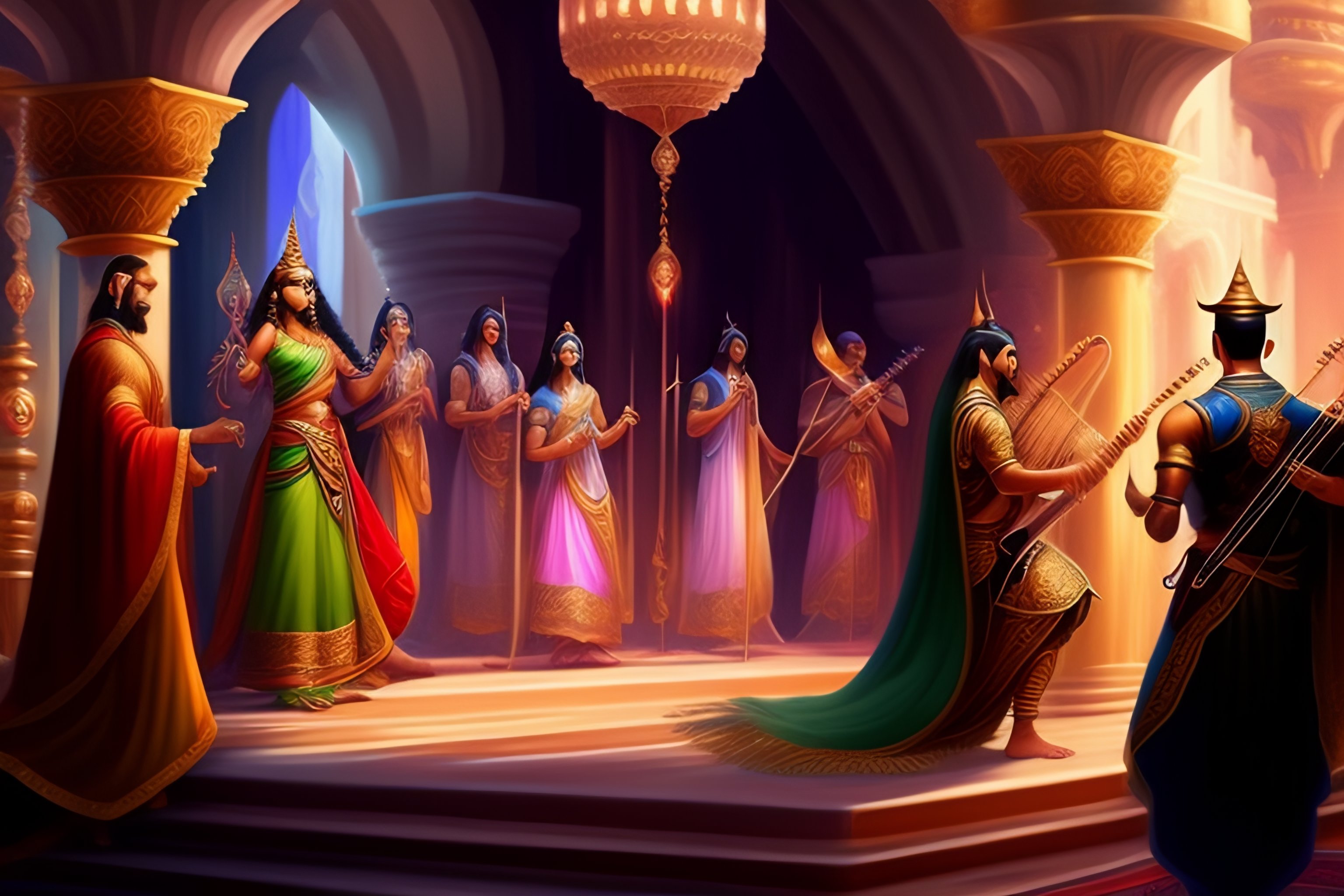 High detailed d&d characters of a beautiful apsaras and gandharvas musicians with elegant robes and music instruments dancing in a shiny fantasy palace surrounded by animals, hyperrealist illustration, fantasy cartoon for sinbad and aladdin, highly detailed and richly colored painting, artstation