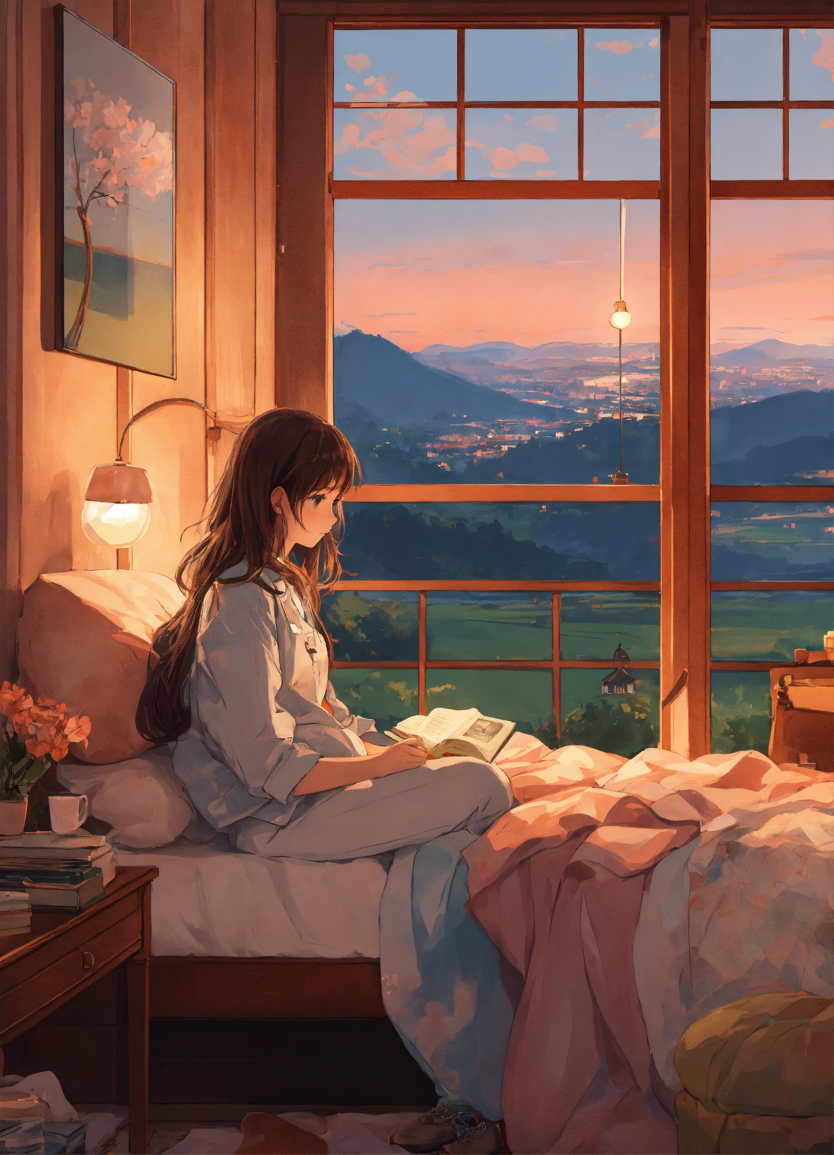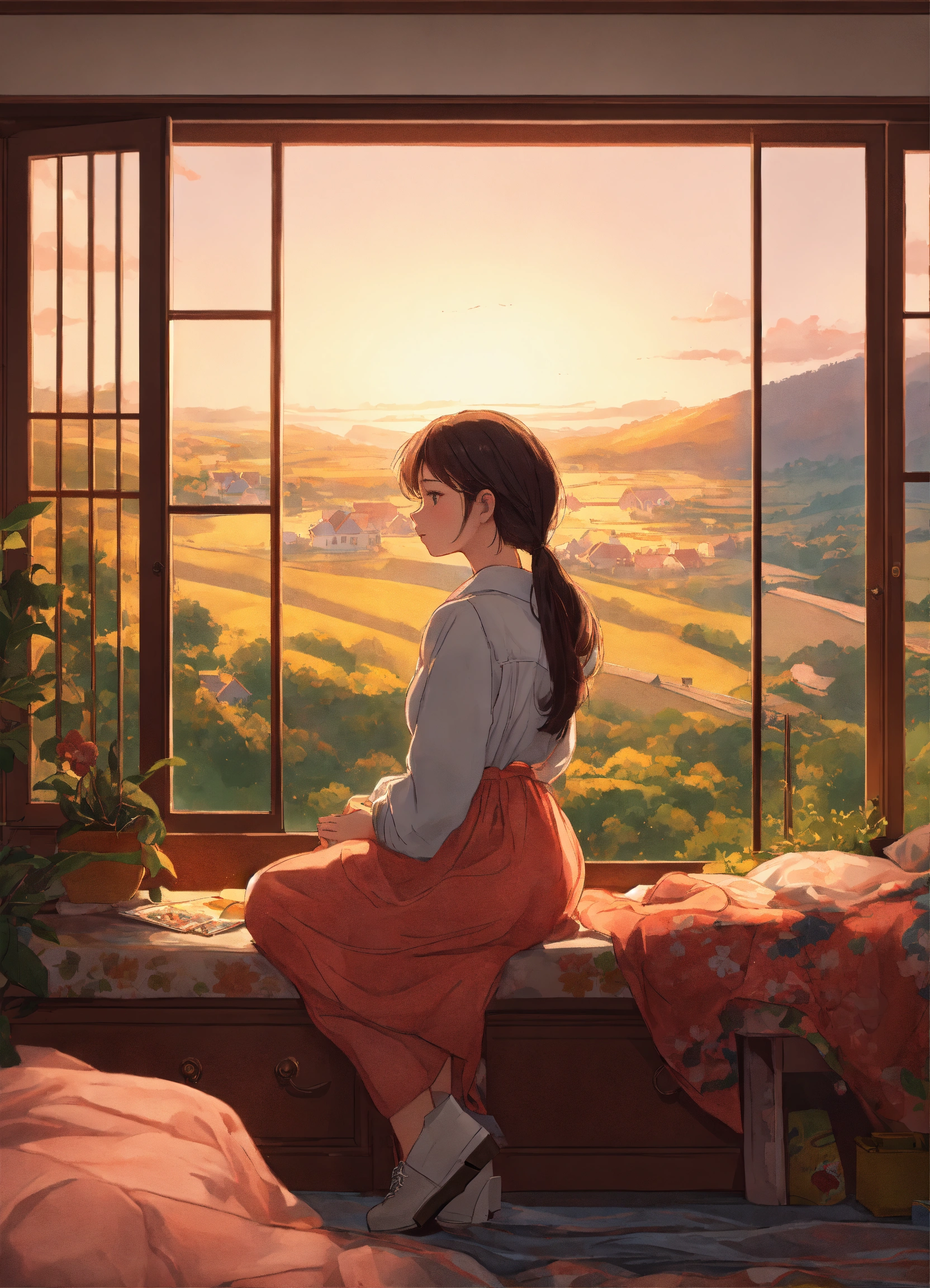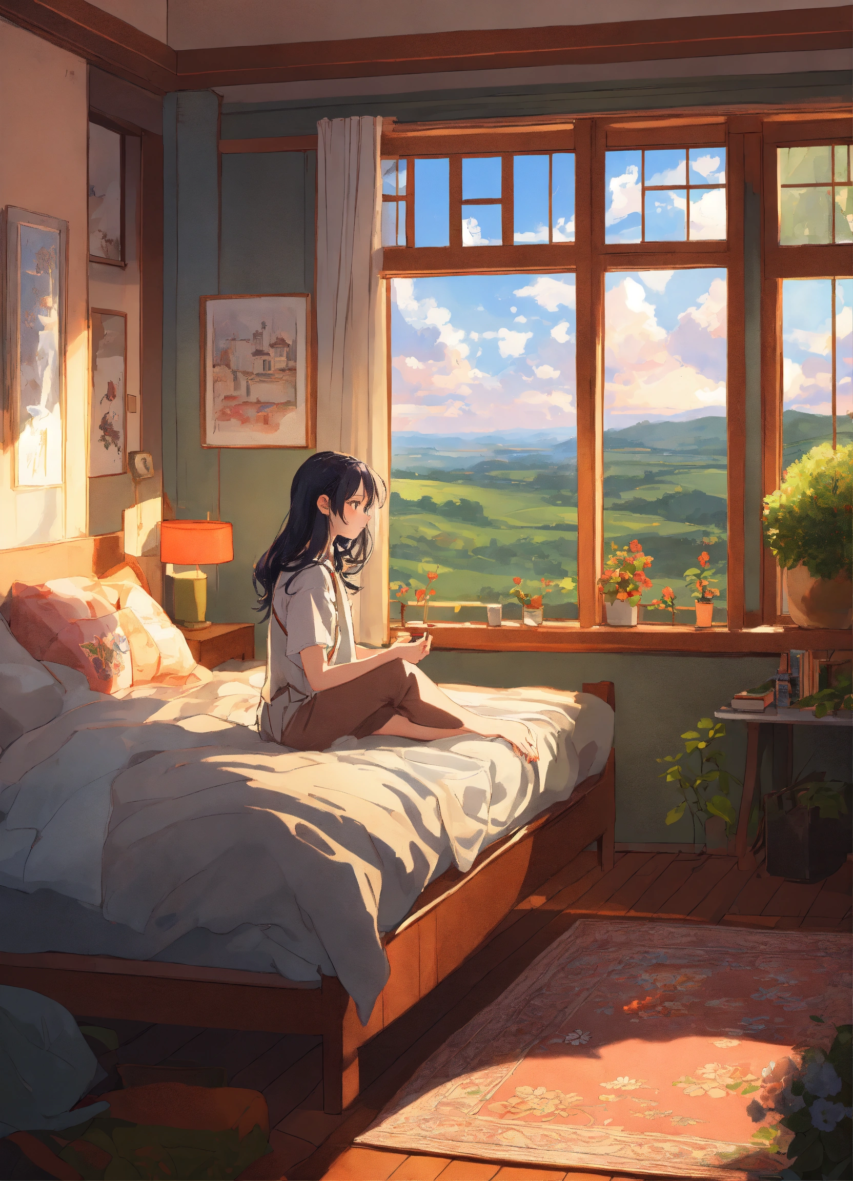 Create an intricately detailed anime-style illustration of a young woman in a lofi atmosphere, situated in her bedroom. the bedroom should feature a large window that opens up to a picturesque countryside landscape. the emphasis should be on producing a highly realistic and error-free depiction of the young woman. pay meticulous attention to capturing intricate details, facial expressions, clothing, and overall aesthetics, ensuring a true-to-life representation. the final artwork should evoke a serene, contemplative mood, with the young woman as the central focus of the composition