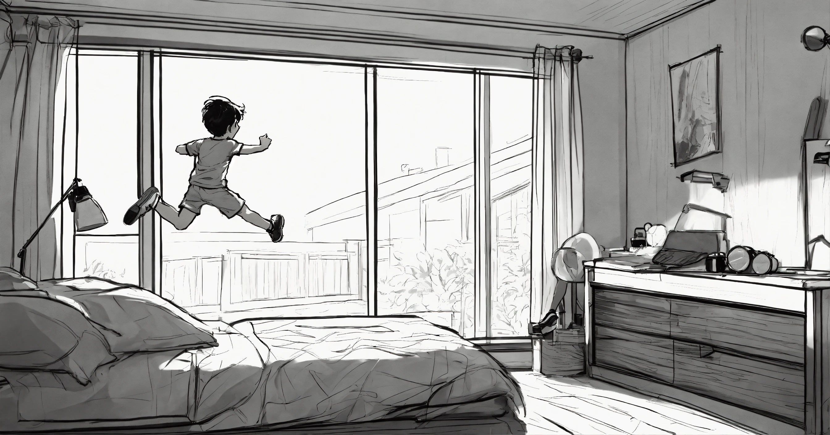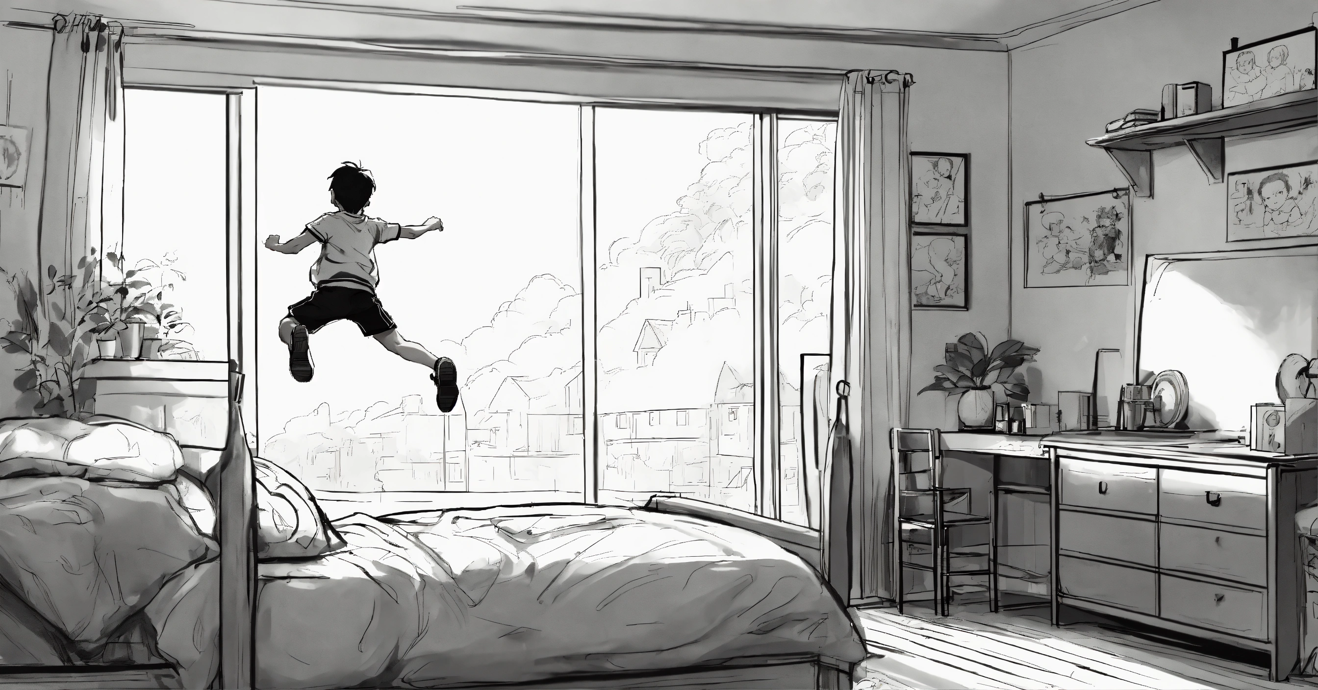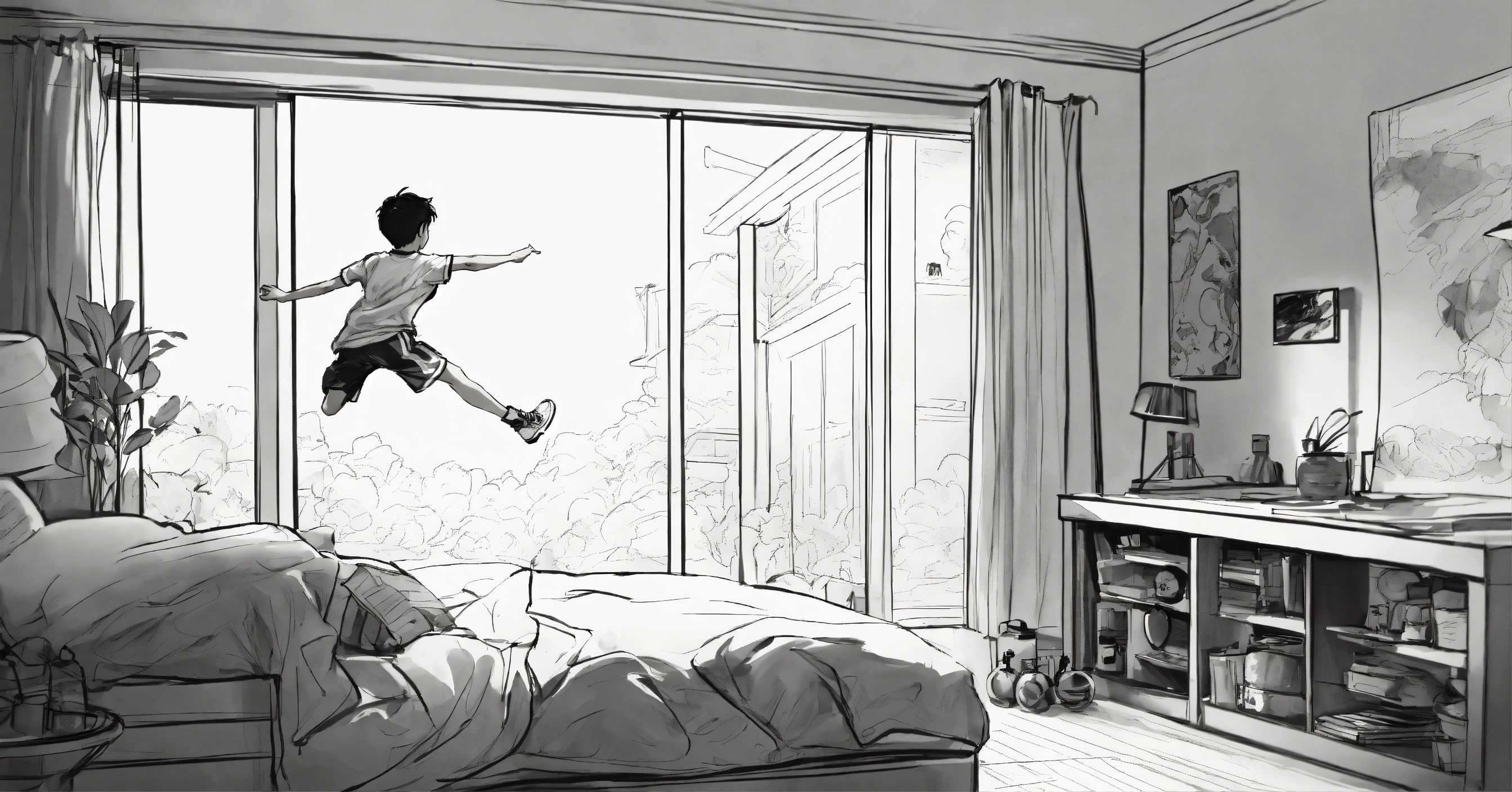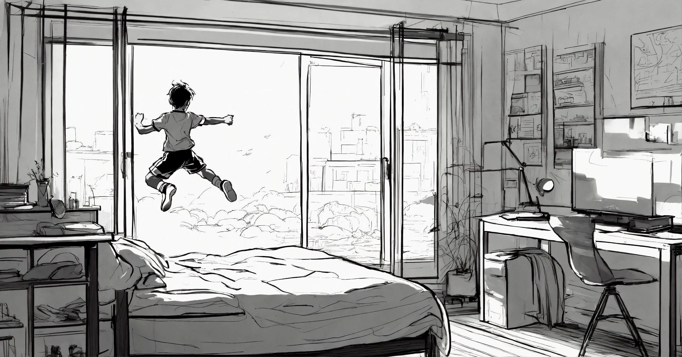 Sketch style, line art, a long shot to a boy in his bedroom, looking to the camera, healthy body shape and he playing sport and jumping and spread his arm