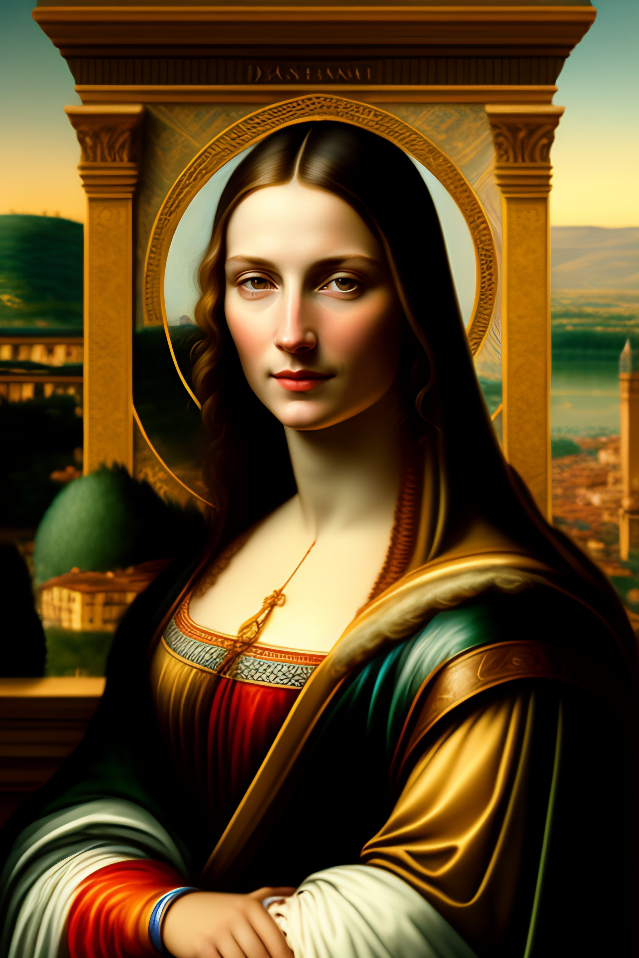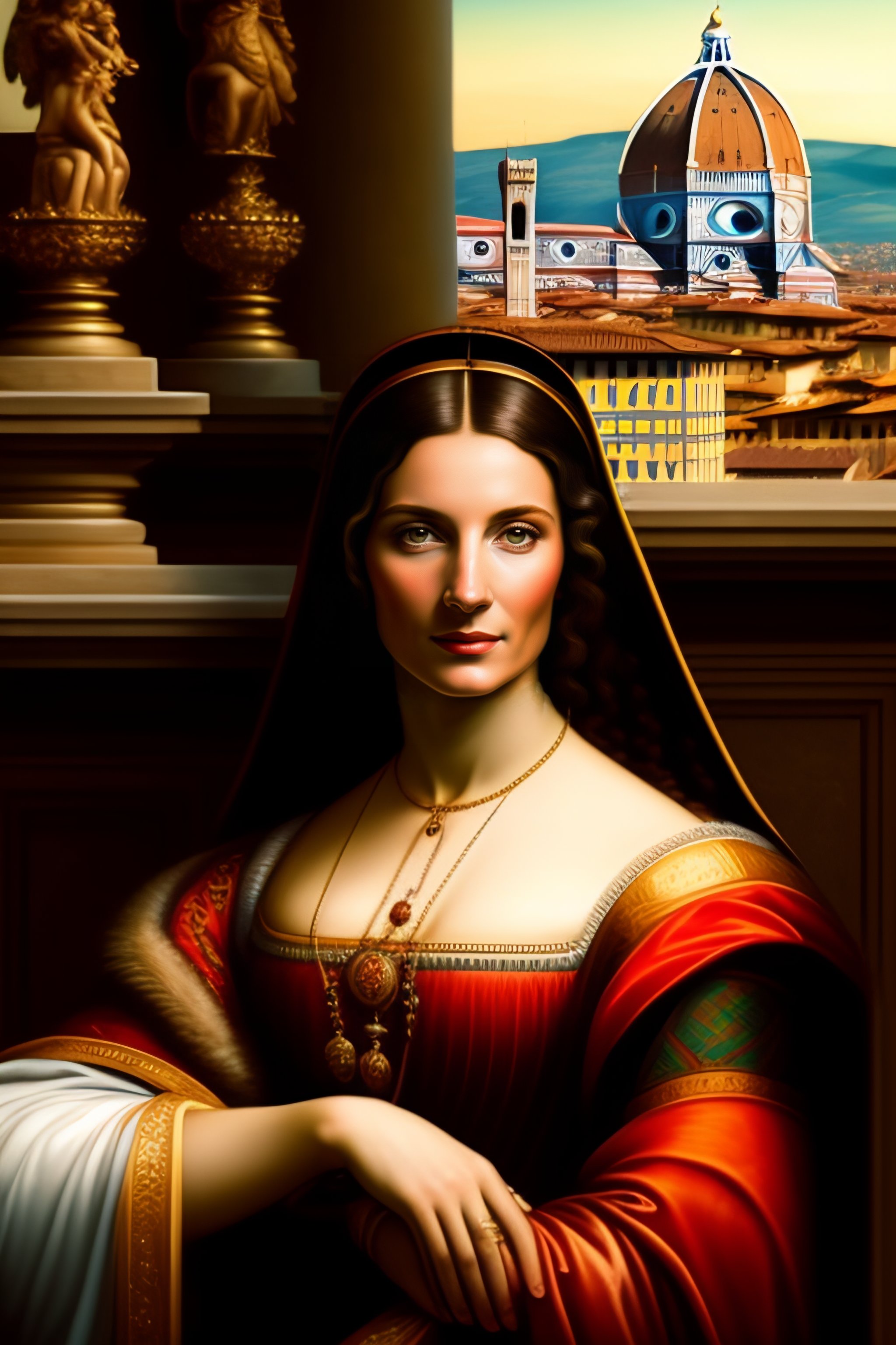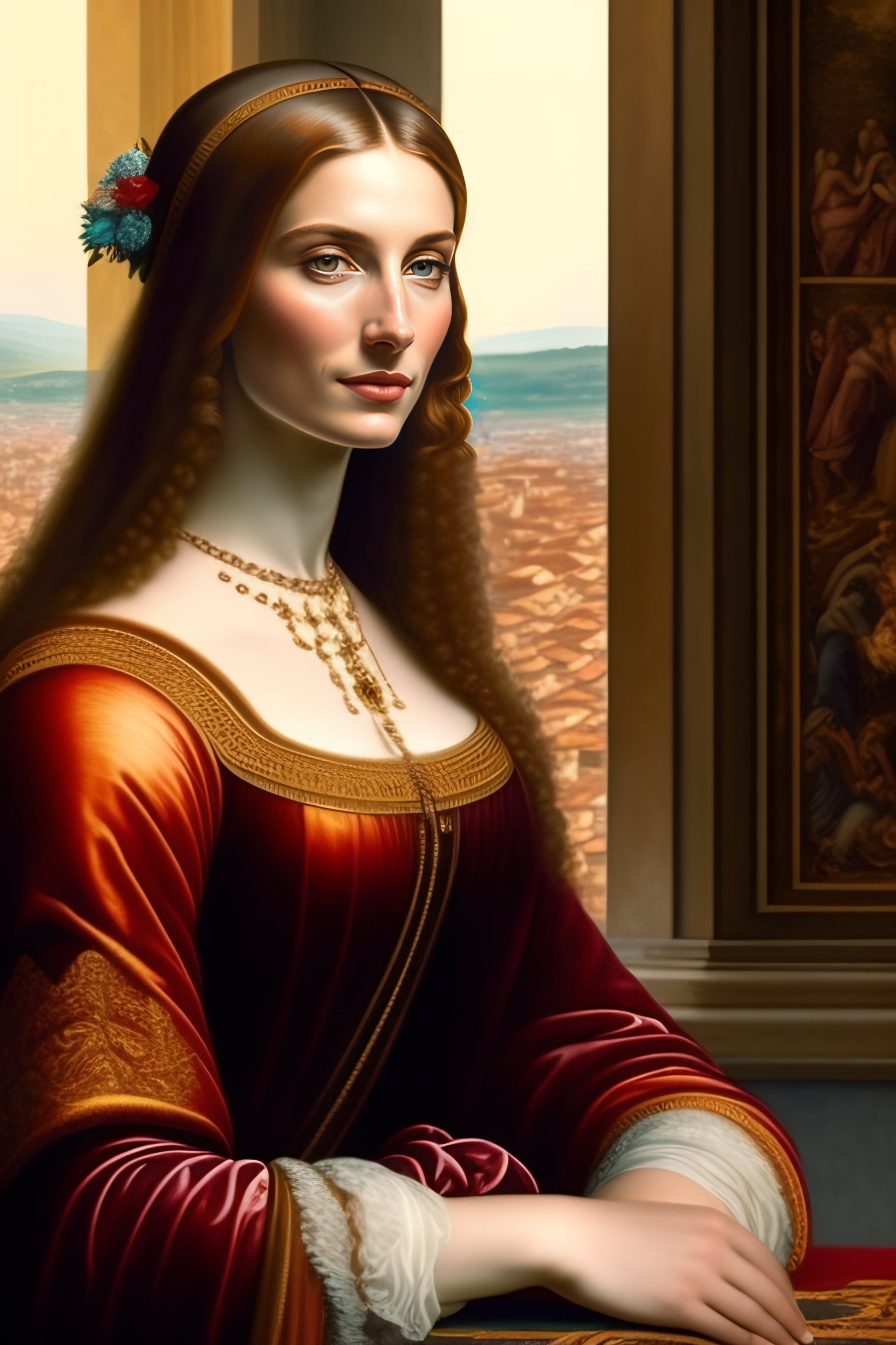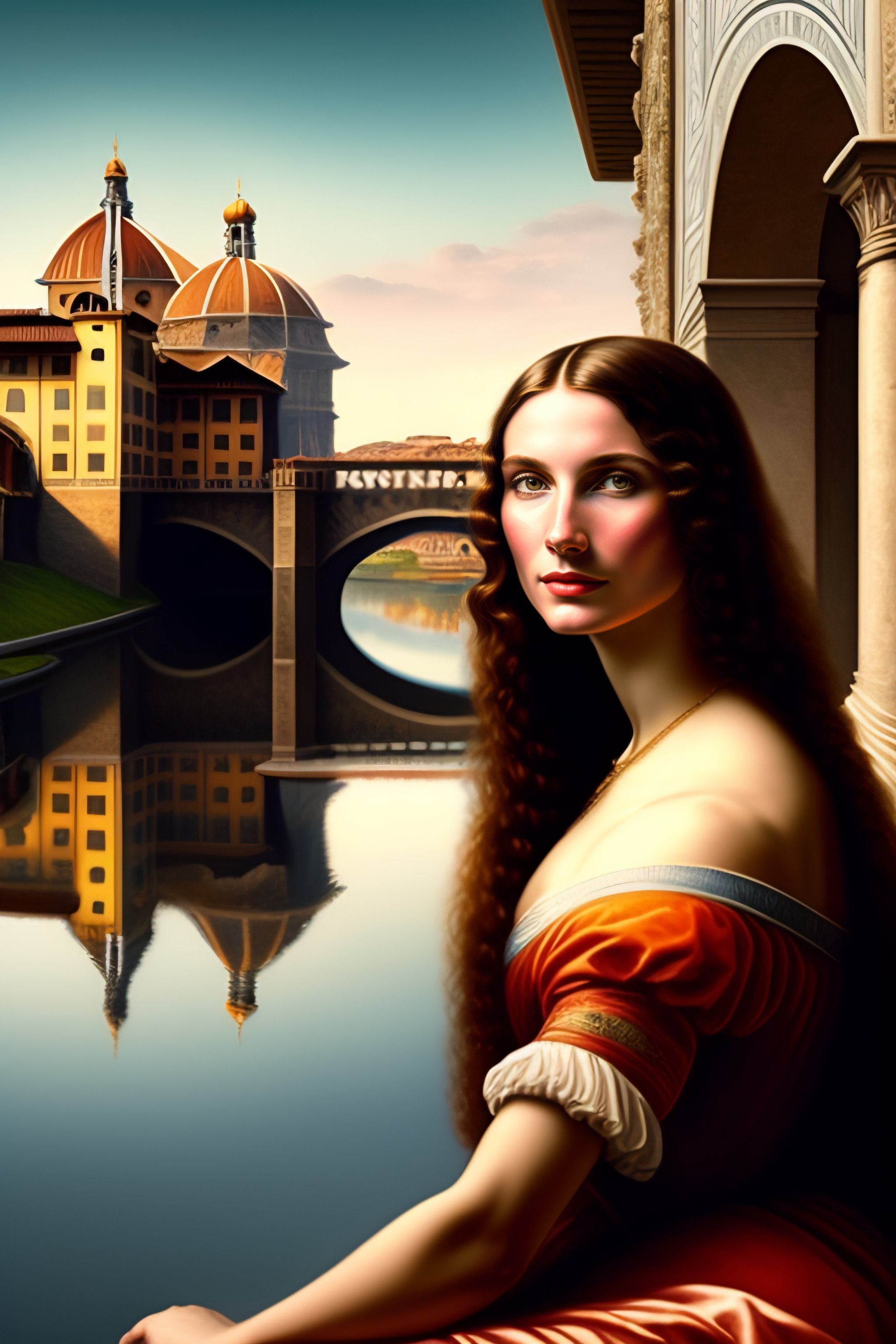 A renaissance painting. da vinci style, of a beautiful woman seated with city of florence in the background