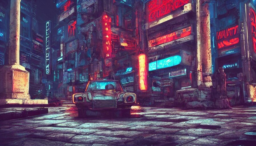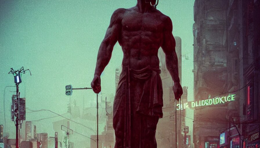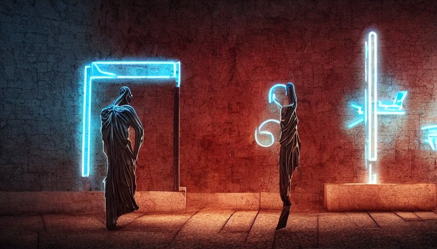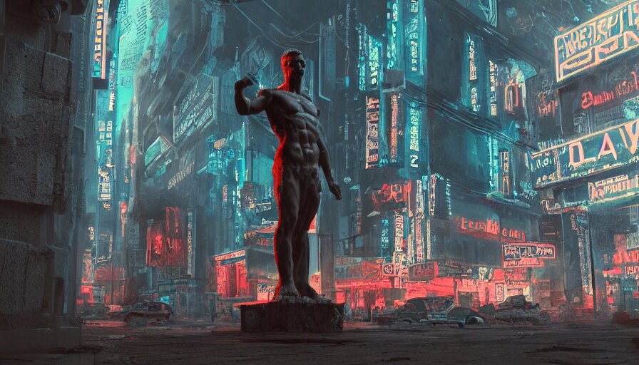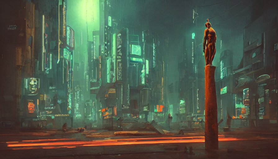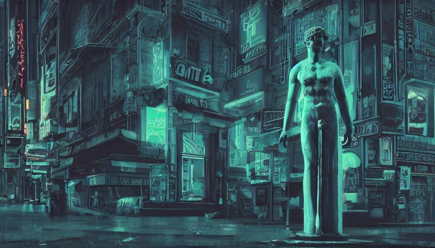 A small weathered ancient greek sculpture standing in a square, surrounding by of cyberpunk city, neon sign, bladerunner, digital illustration, artstation, cinematic composition