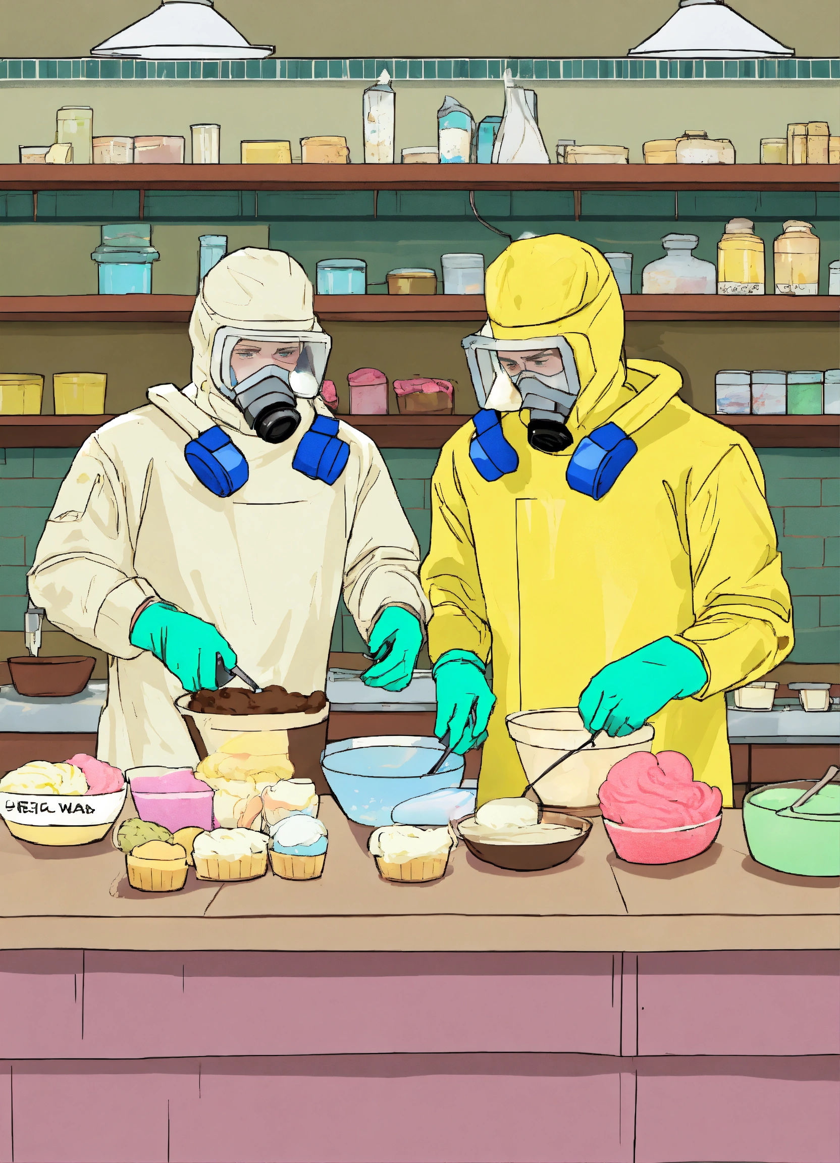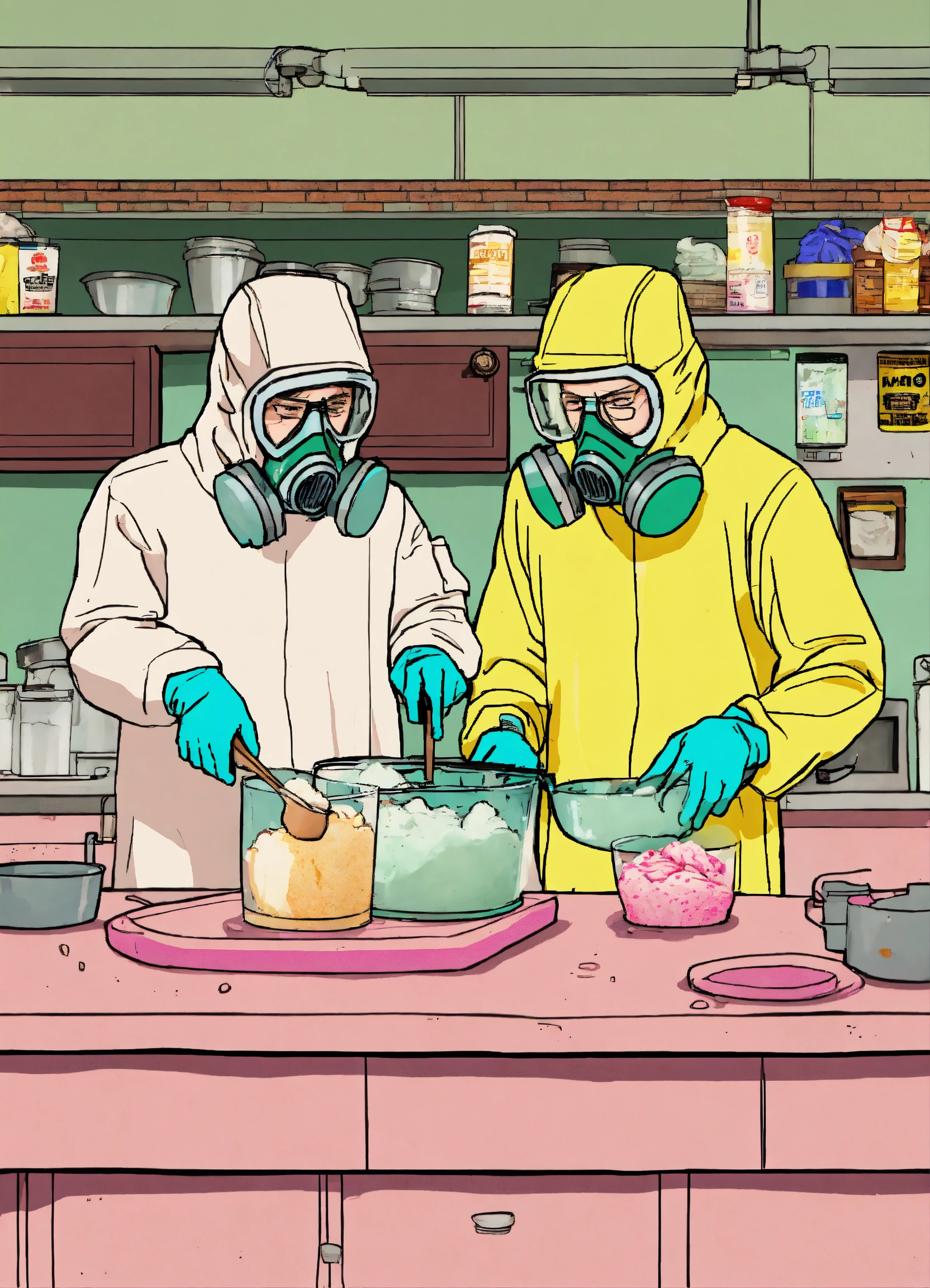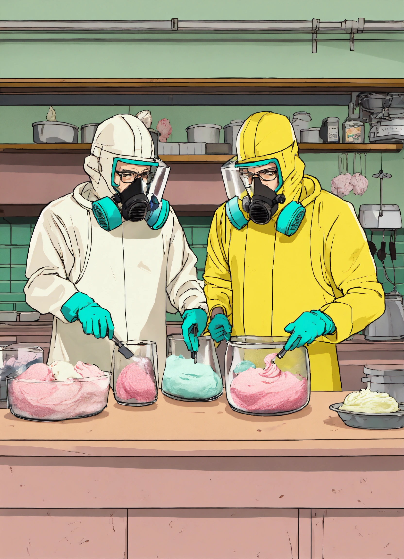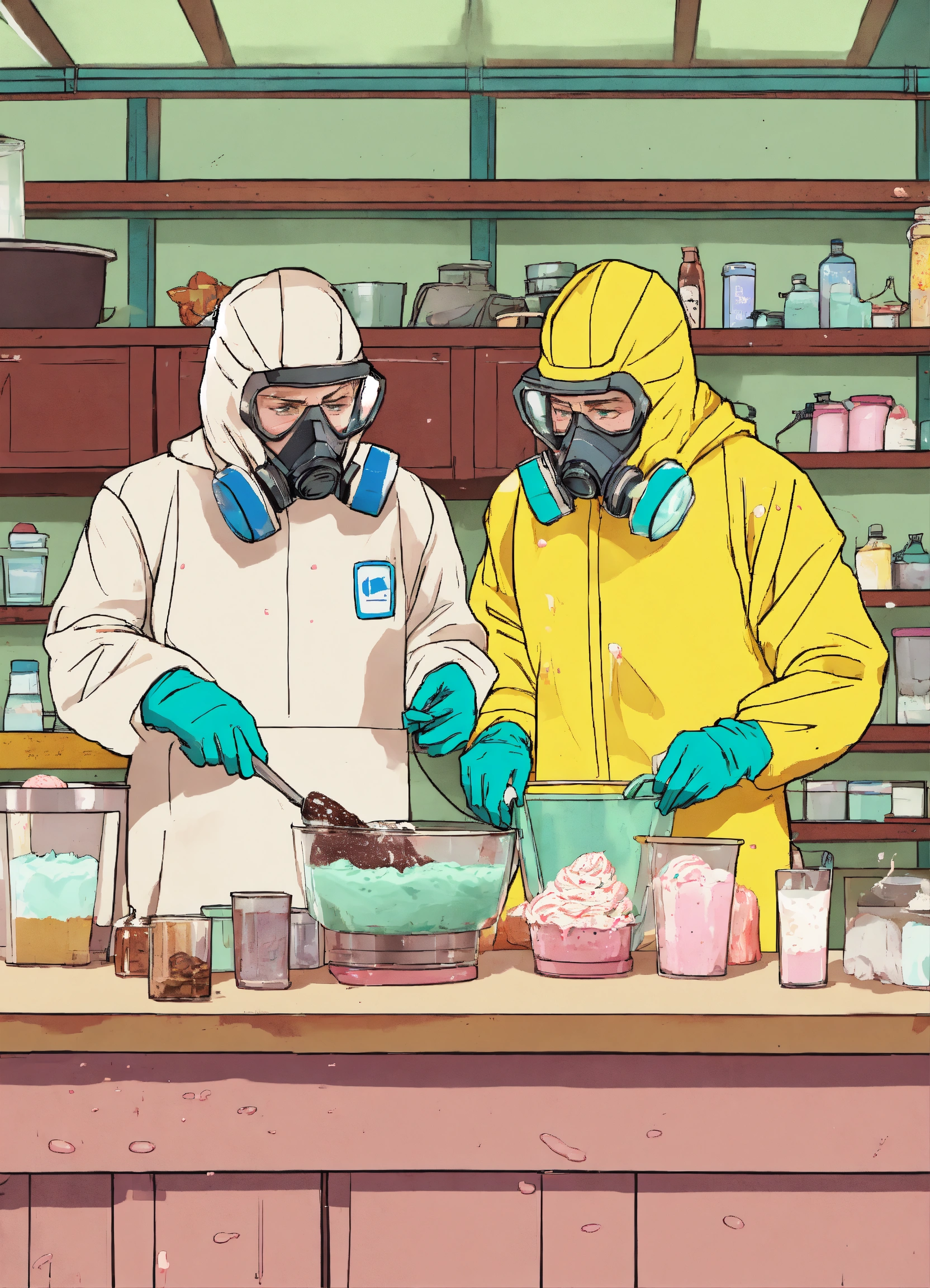 Jesse pinkman and walter white from breaking bad making ice cream, they're making ice cream and wearing hazmat suits, style animated