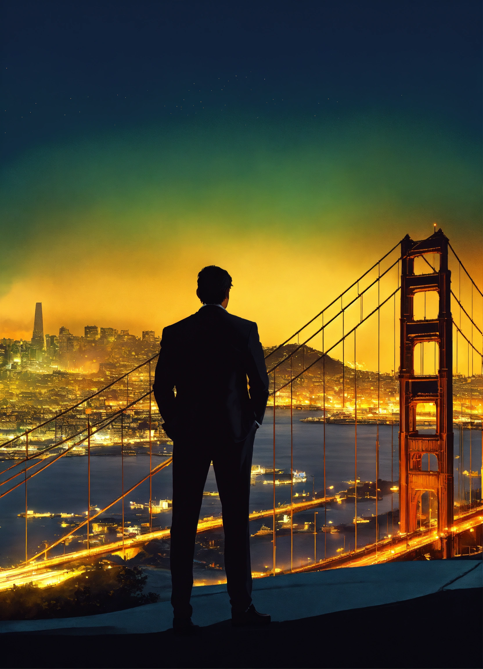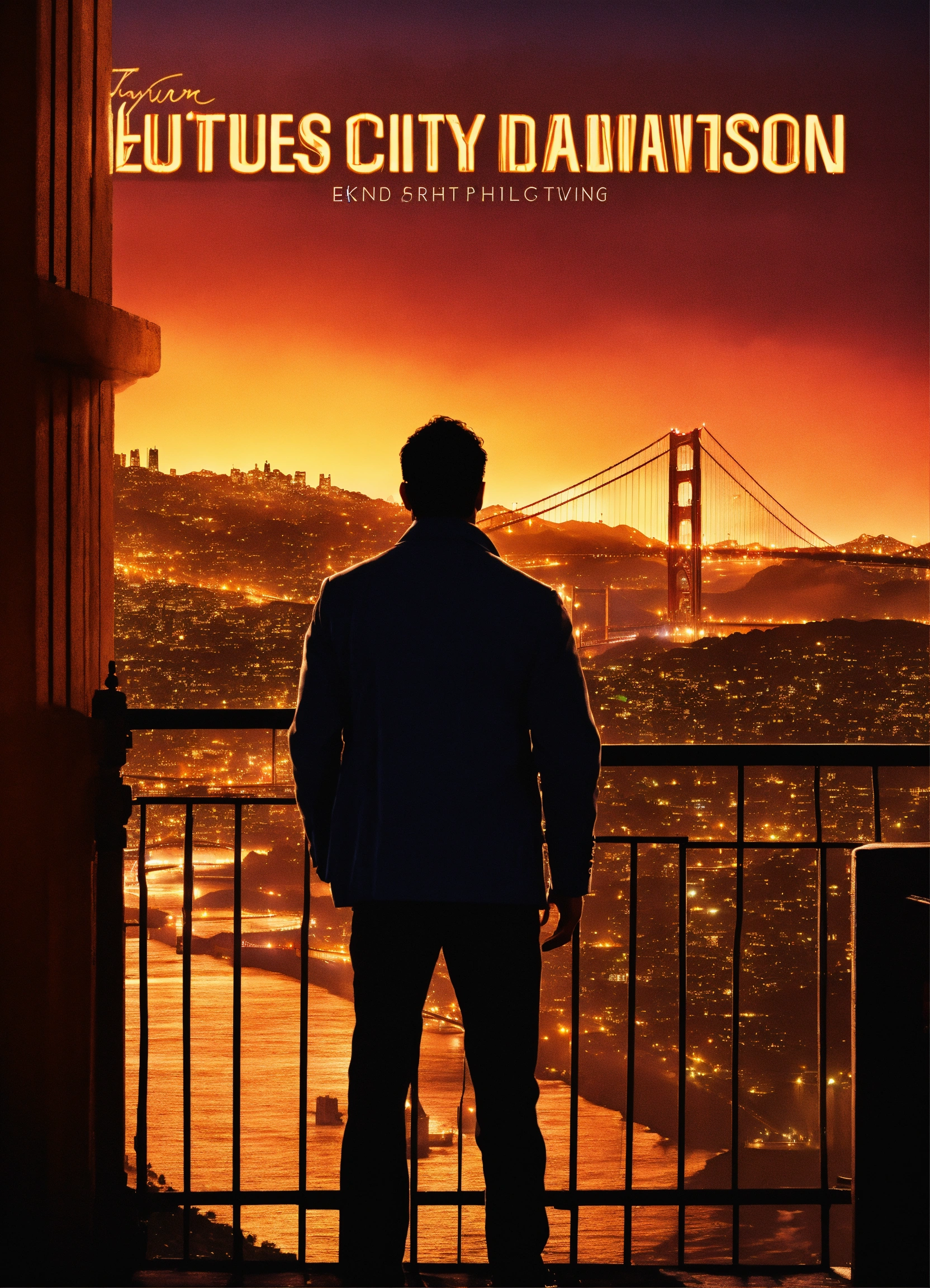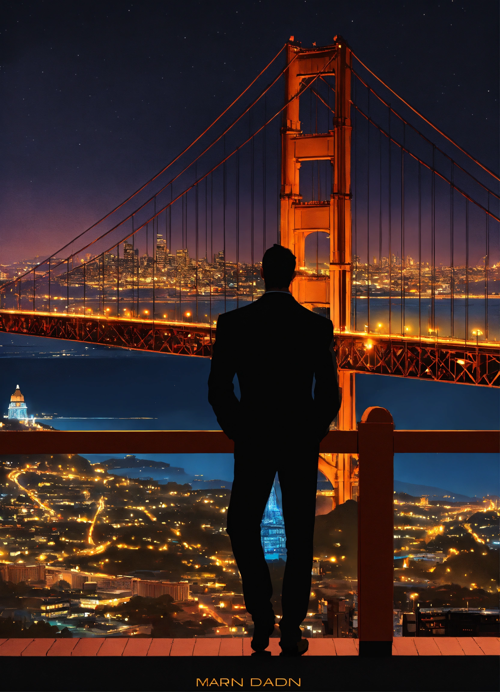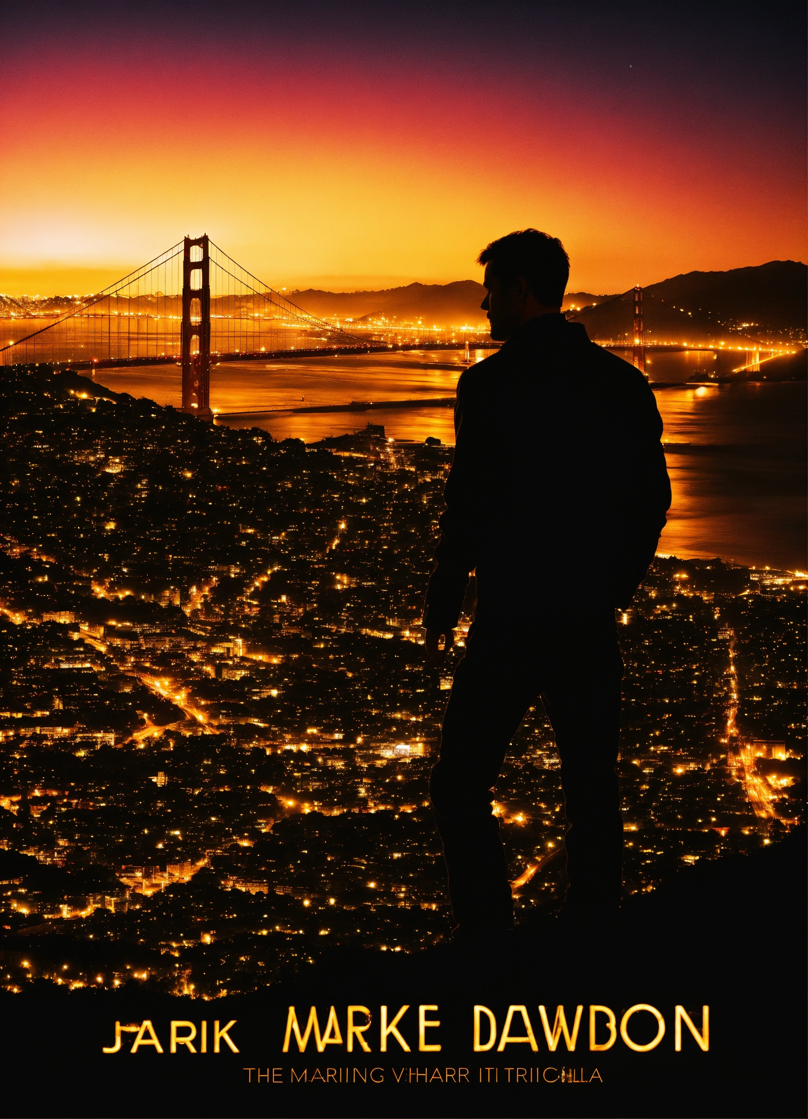 Create a captivating cover design that conveys the theme, city, nightlife, crime, and thriller silhouette of a man side view overlooking the city with golden gate bridge in the background, inspired by the book of mark dawson "the chameleon (charlie cooper thrillers book 2)", photoreal, photorealistic, with lighting and shadows effect, city lights at night, super detailed city, extremely detailed