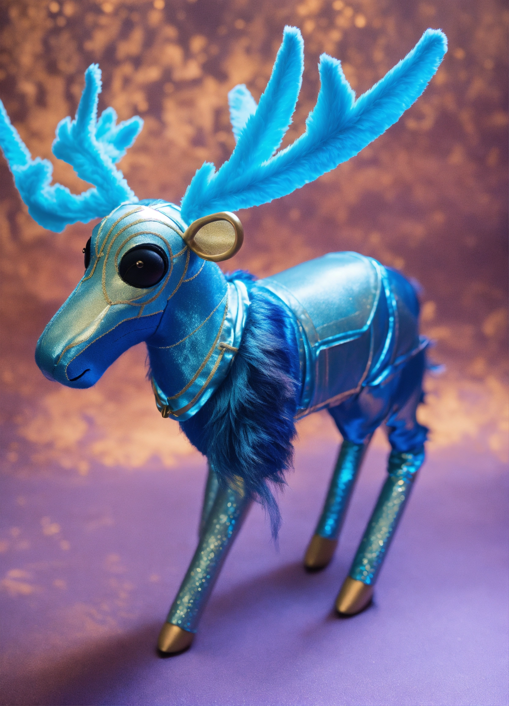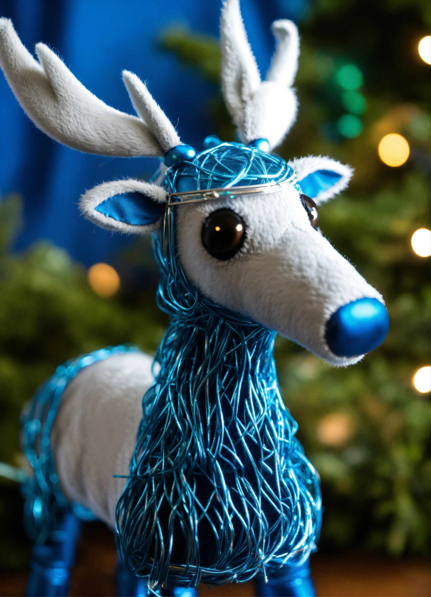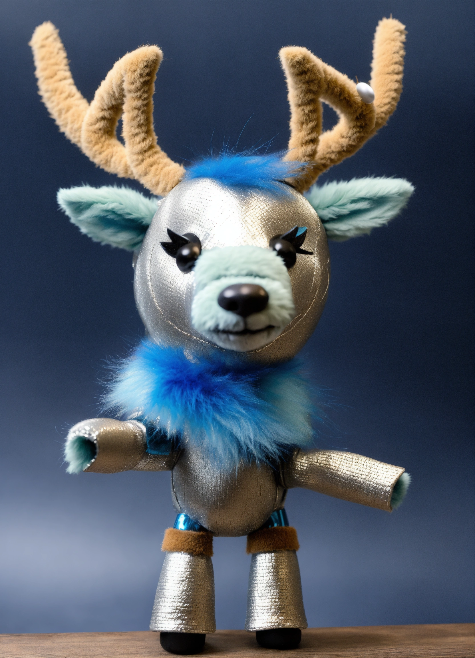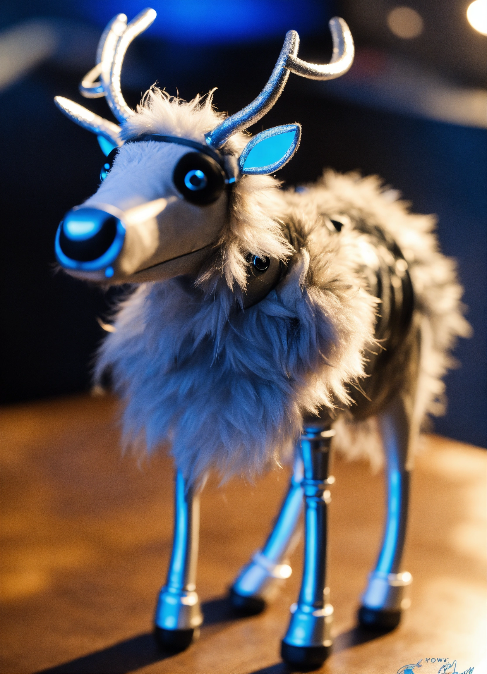 A reindeer puppet inspired by tron legacy movie, the fur is metallic silver with details in blue on the antlers and hoovews