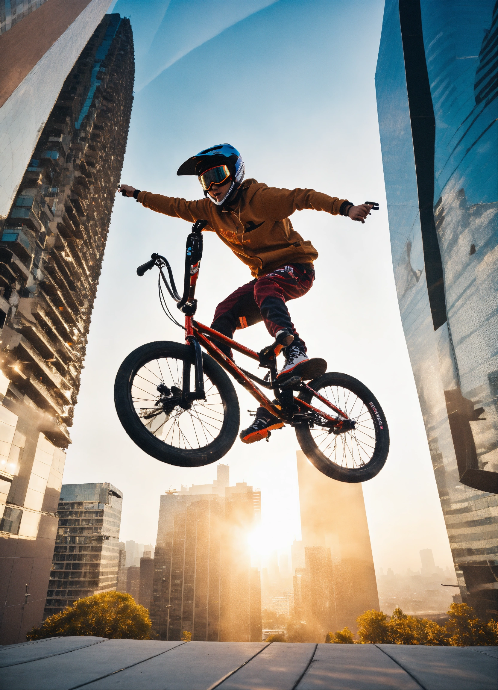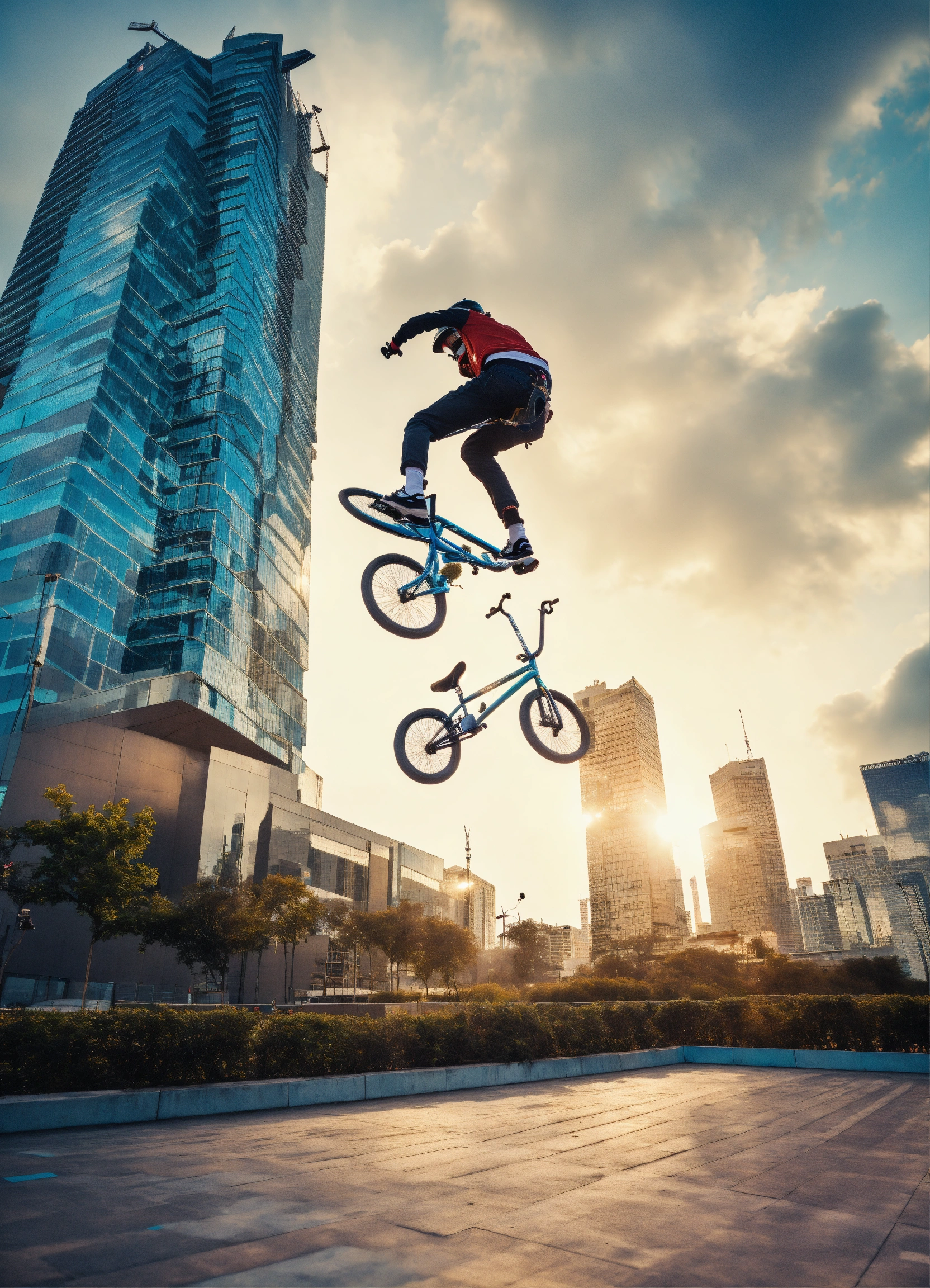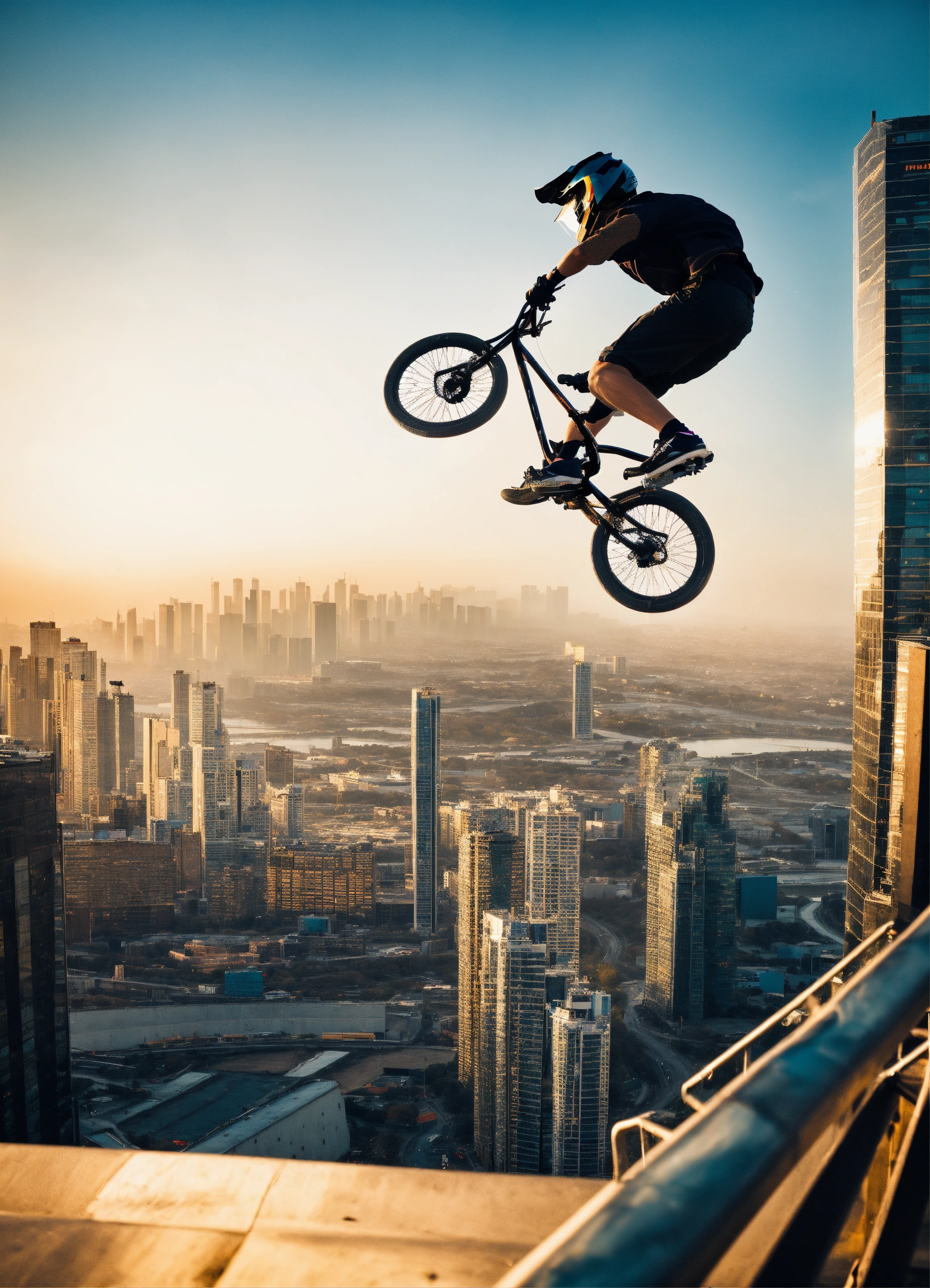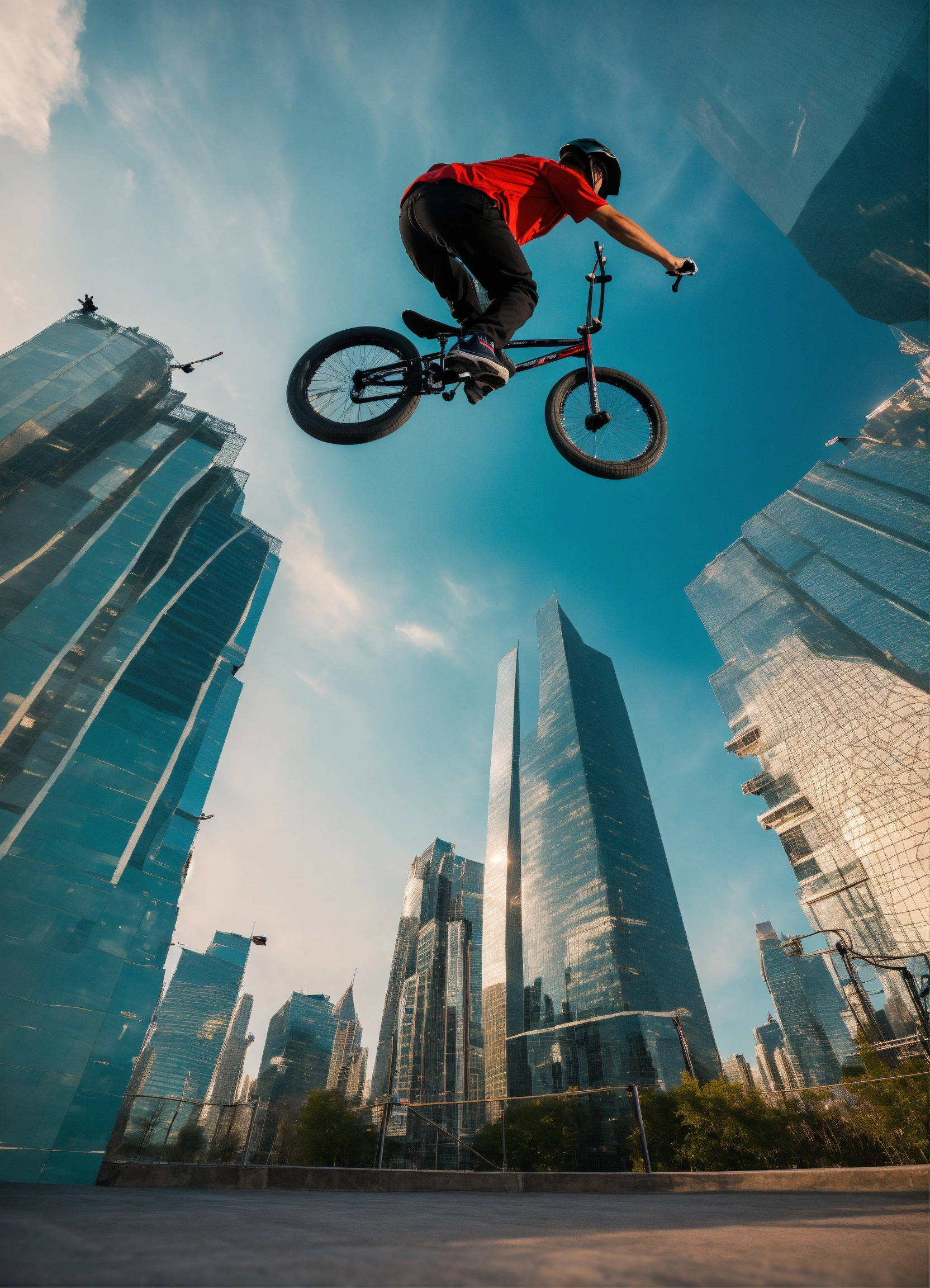 Bmx rider jumping over a skyscraper in a futuristic cityscape