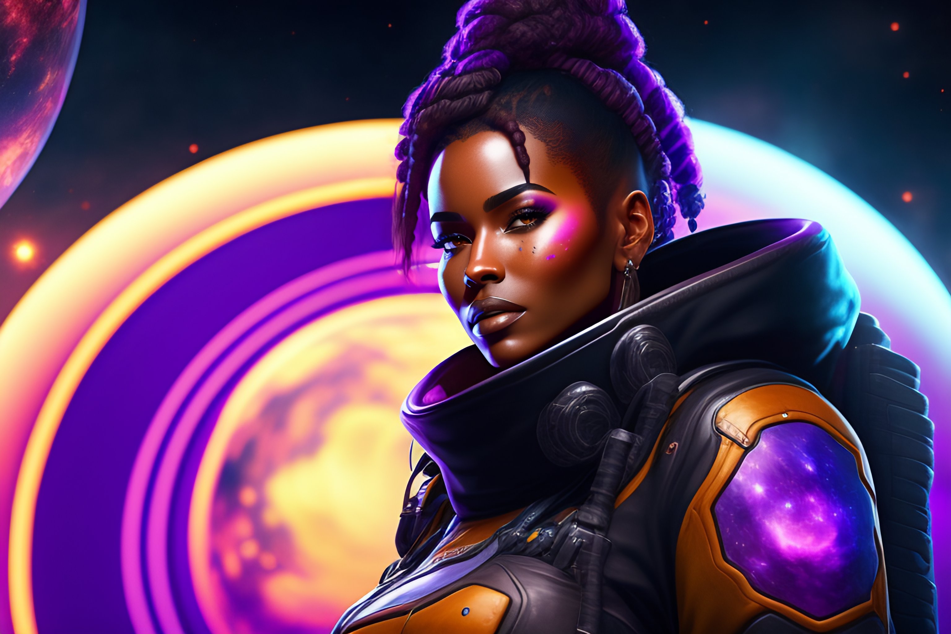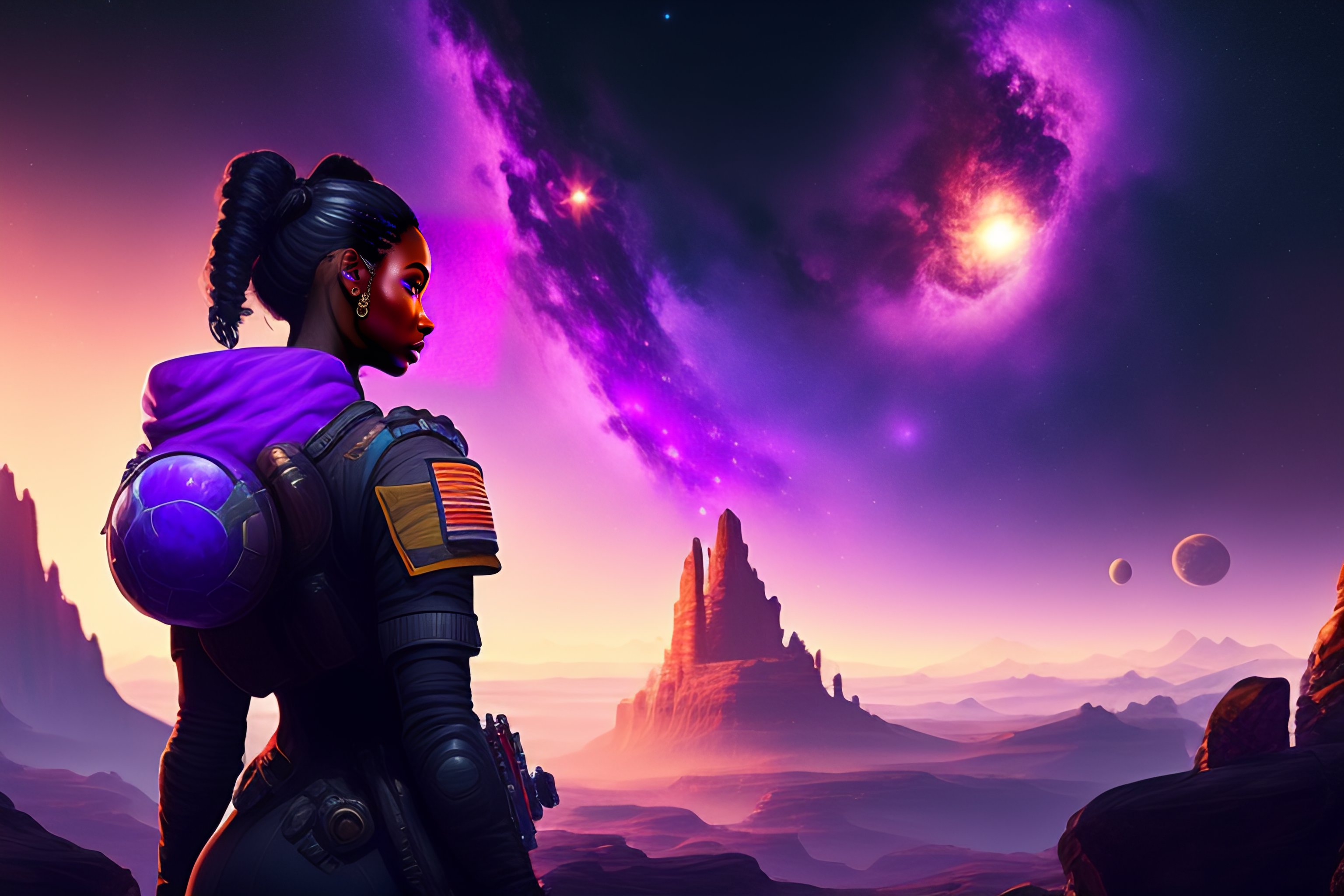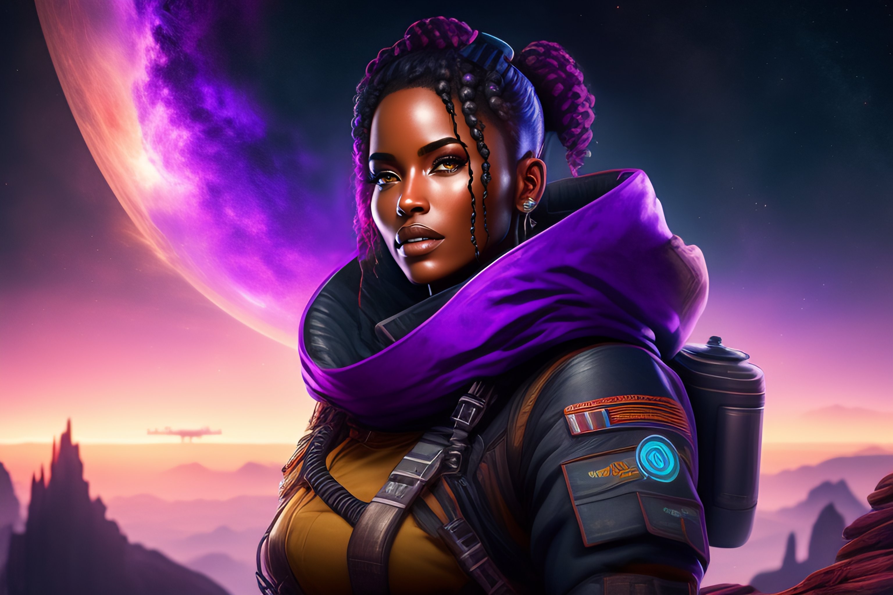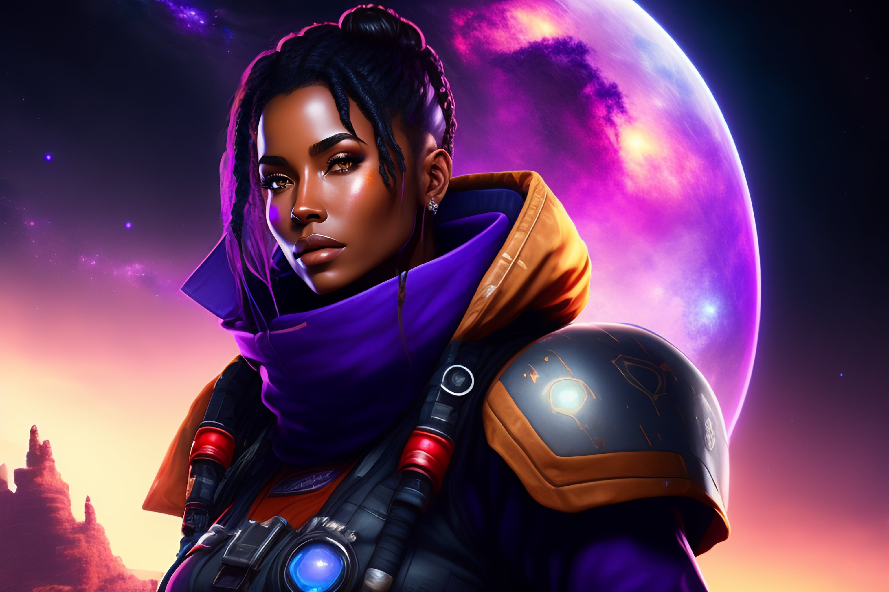 The character pathfinder from apex legends in high resolution, very detailed standing in front of a purple galaxy and planets in the backround