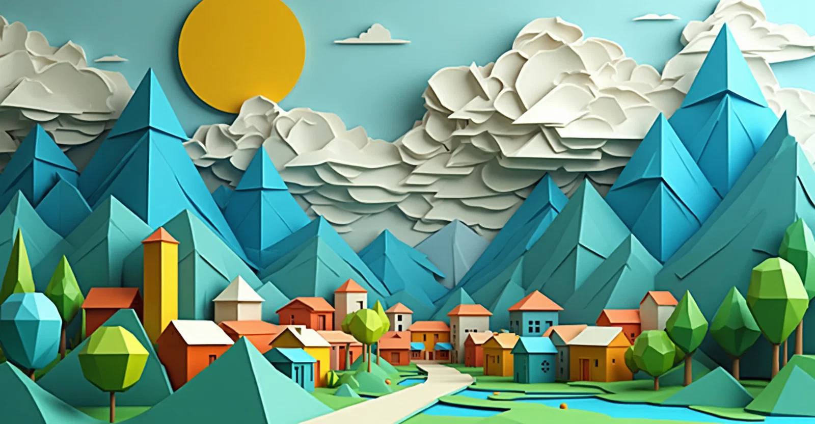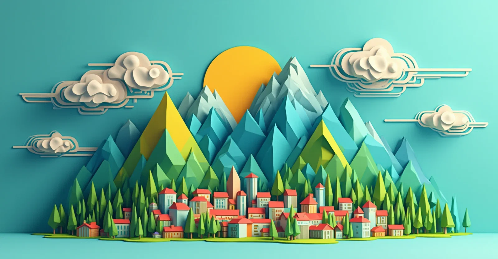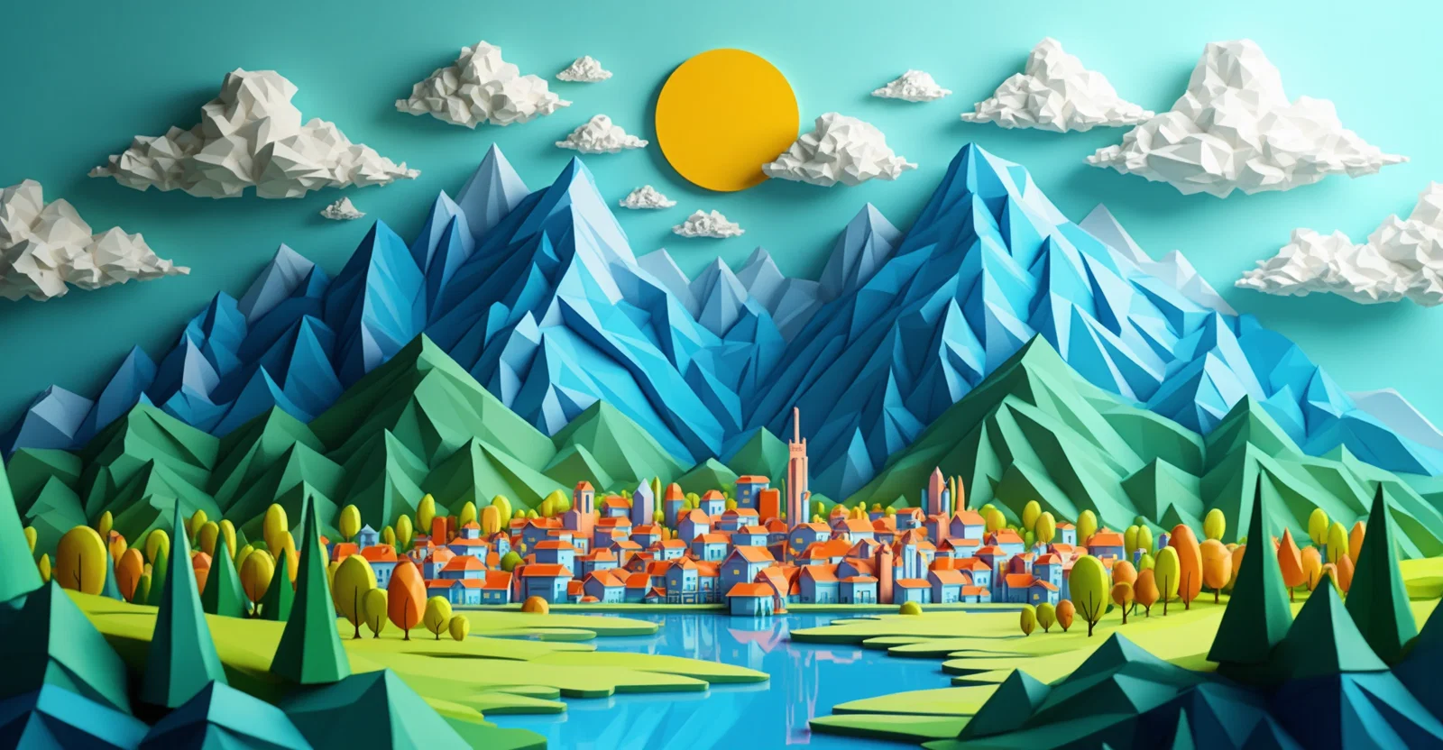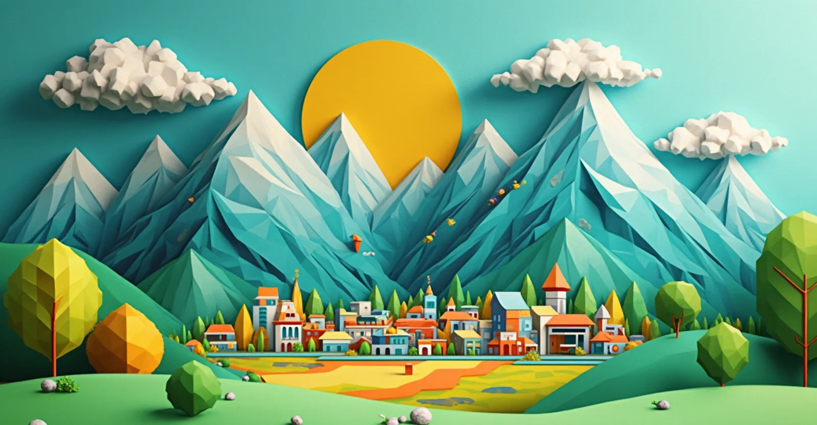 Landscape in 3d with a town in mountains, trees, sun, clouds that are built with geometric figures such as triangles, squares, rectangles, trapezoids and circles. very colorful. minimalist