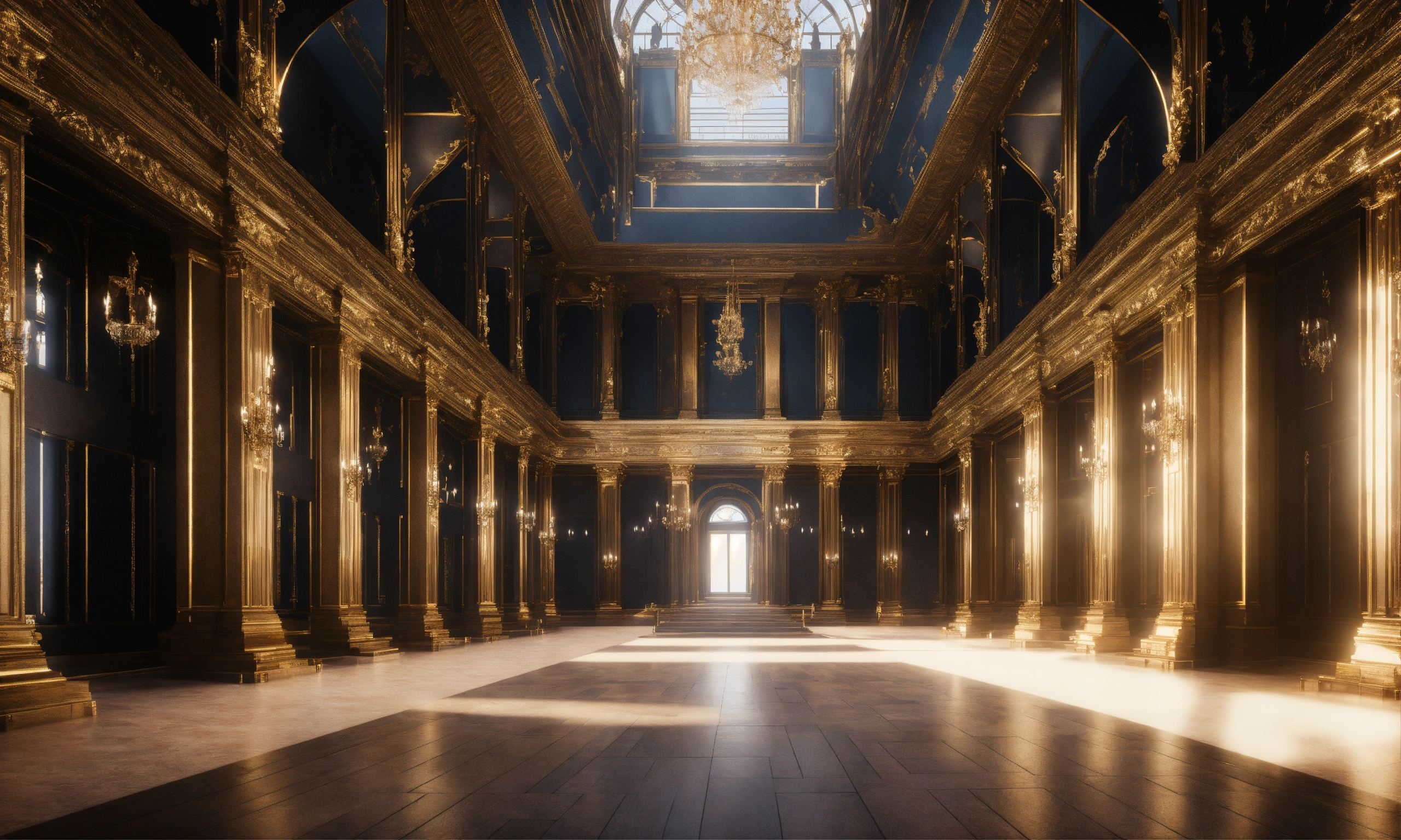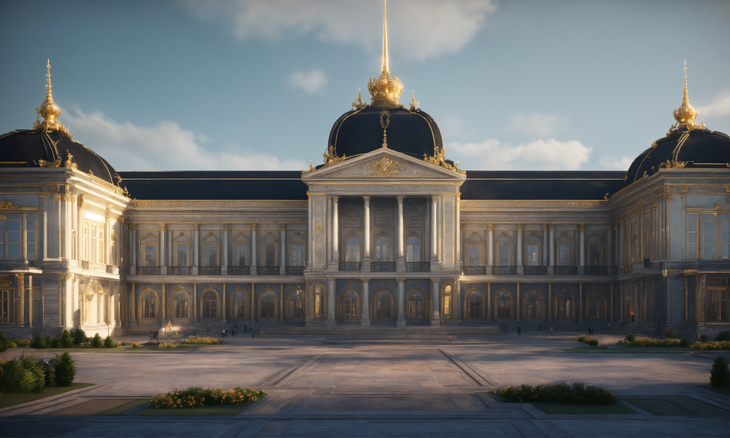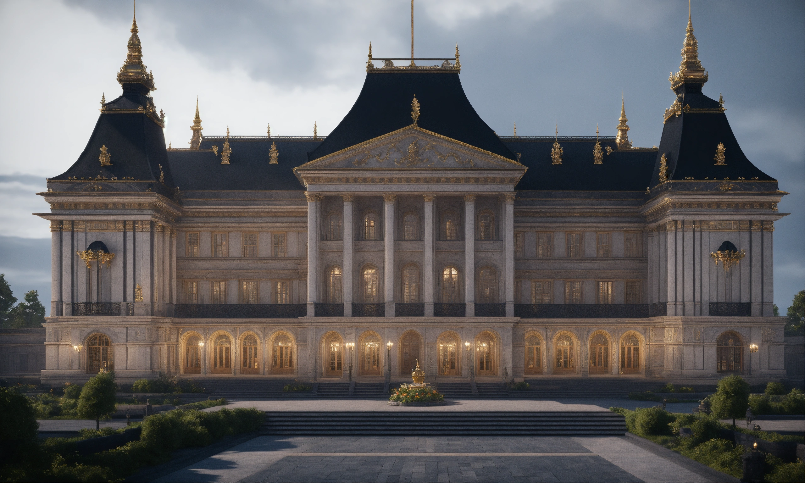 Full image of a massive royal palace with a black roof, built in the american midwest, swedish architecture, highly detailed, symmetrical, unreal engine, 8d