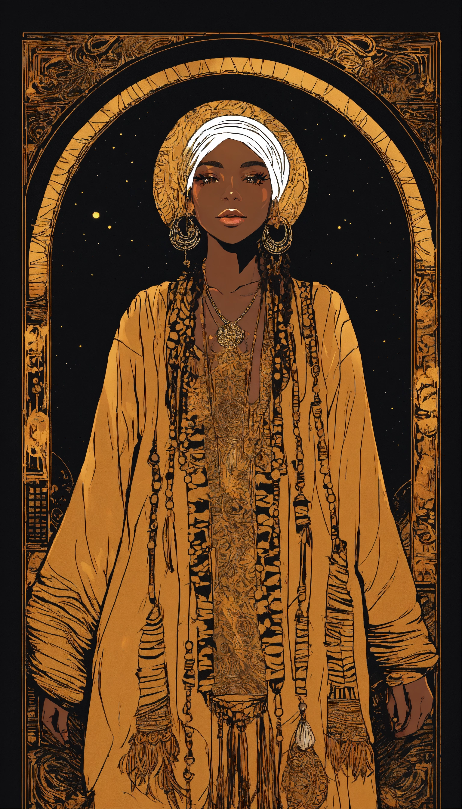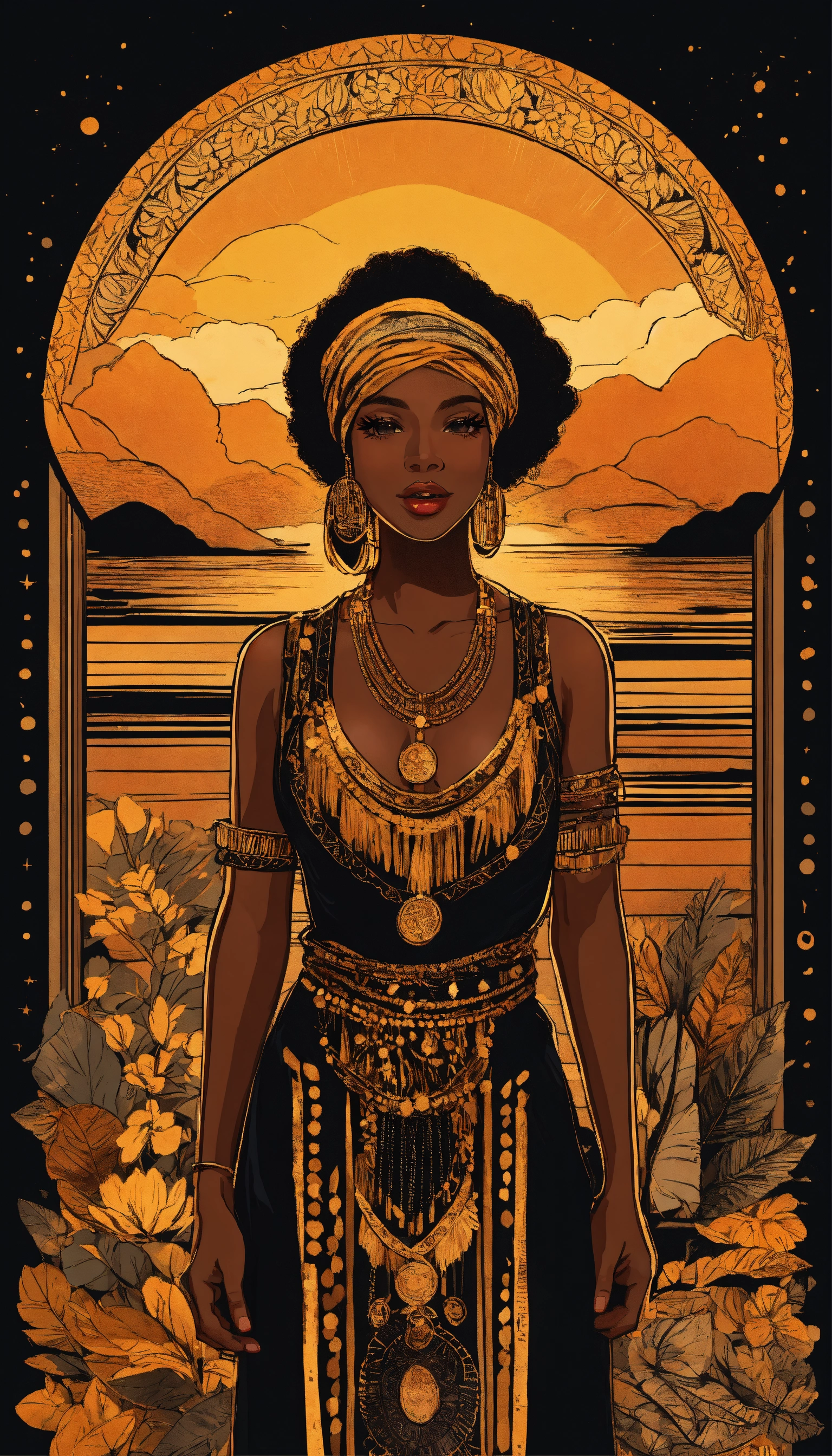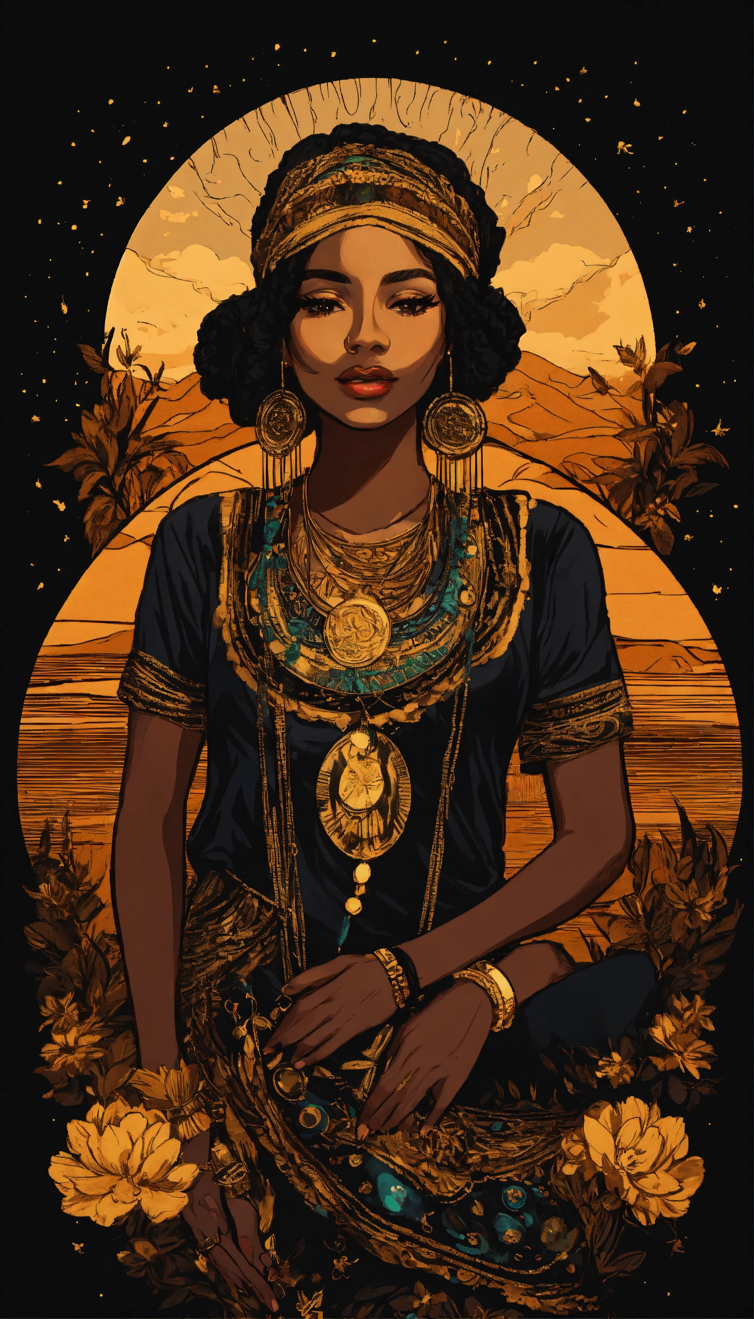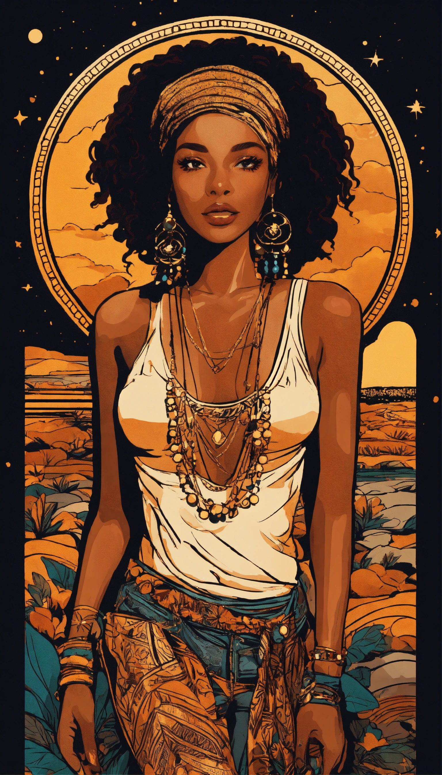 Boho chic wanderer black woman, bohemianinspired clothing and accessories, free-spirited and artistic, golden hour lighting — t-shirt design graphic, vector, contour, black background.