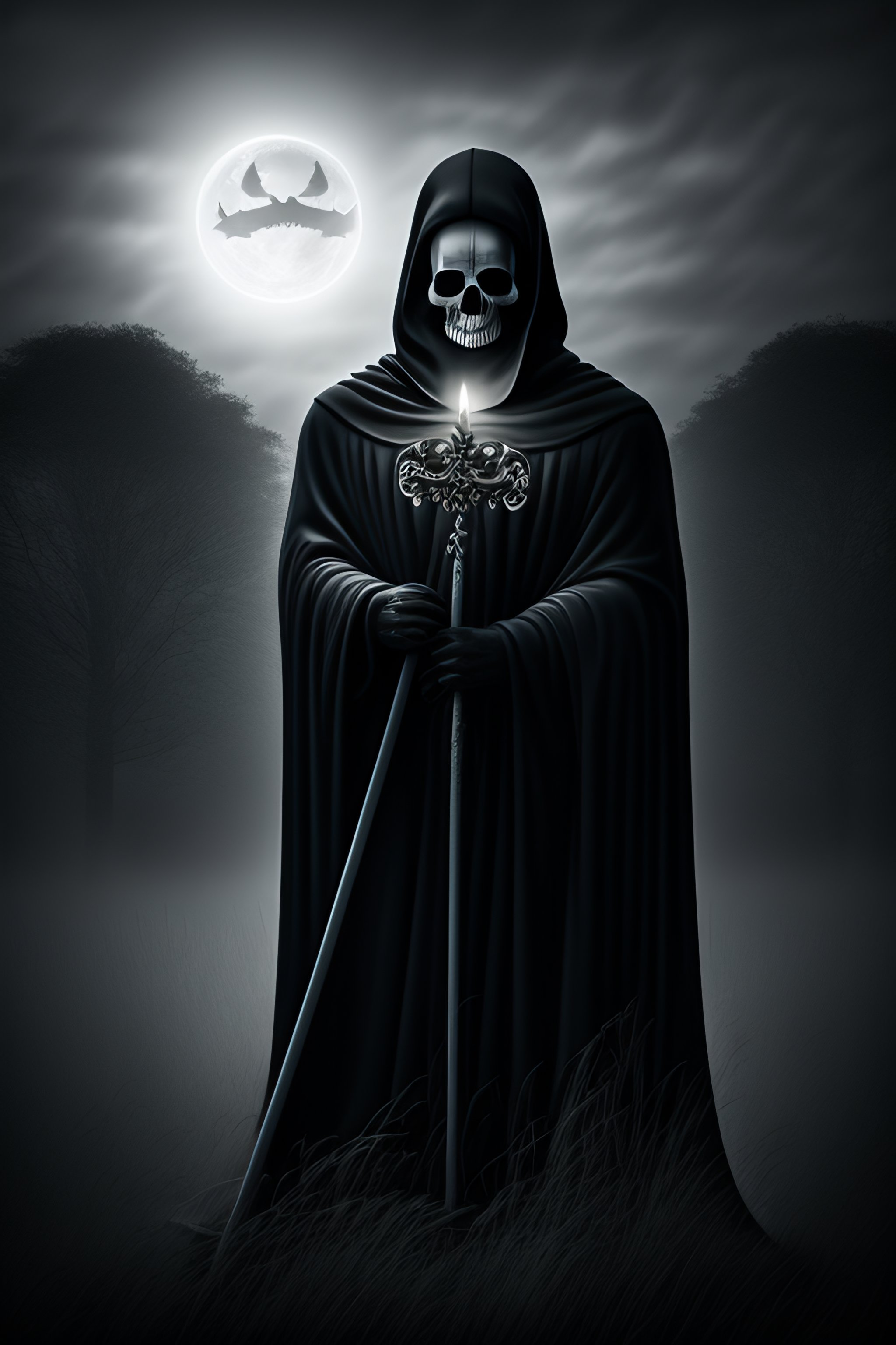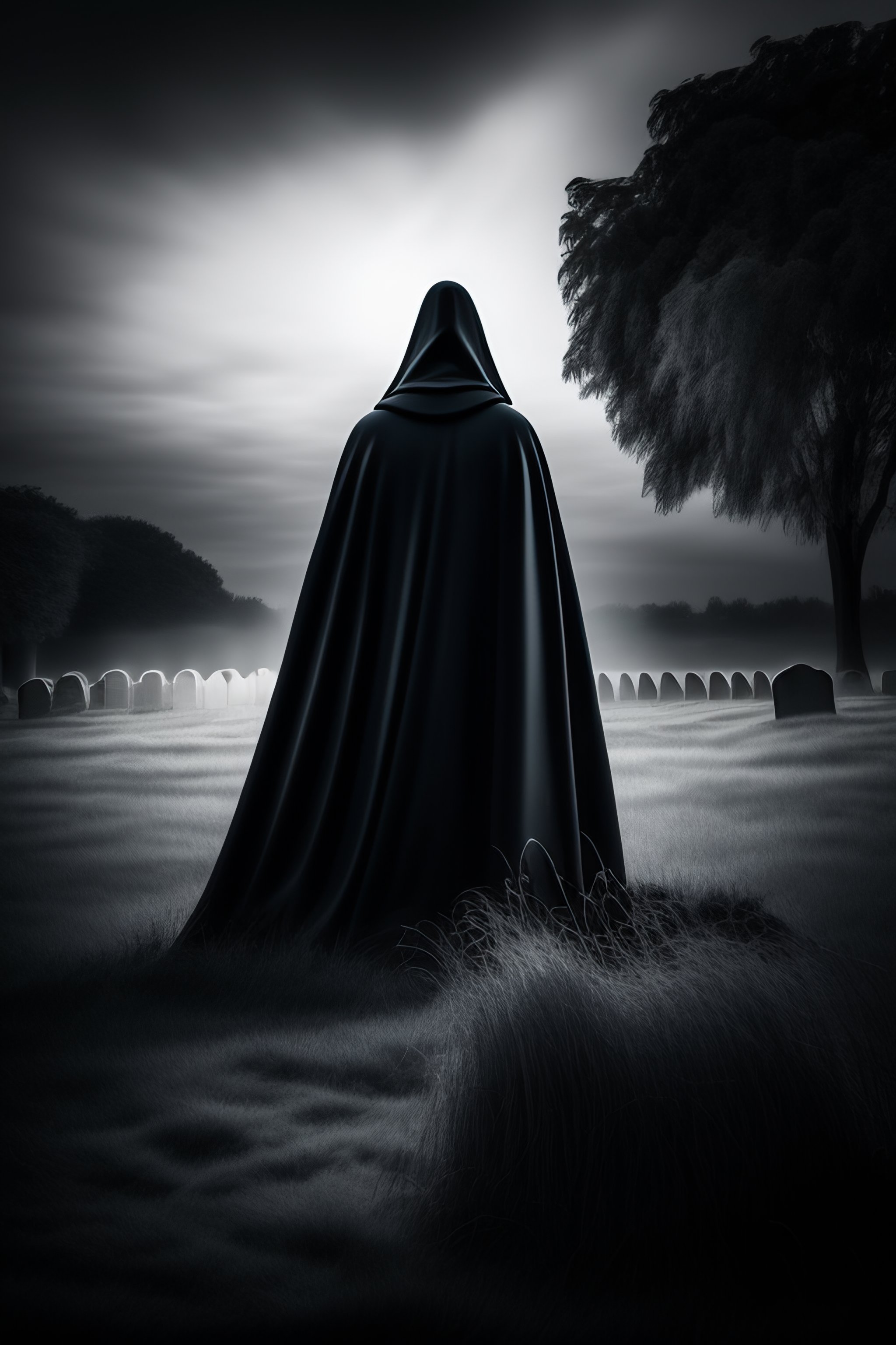 Black and white portrait of the grim reaper in a graveyard, dark and scary night, realistic, detailed, horror, spooky, terror