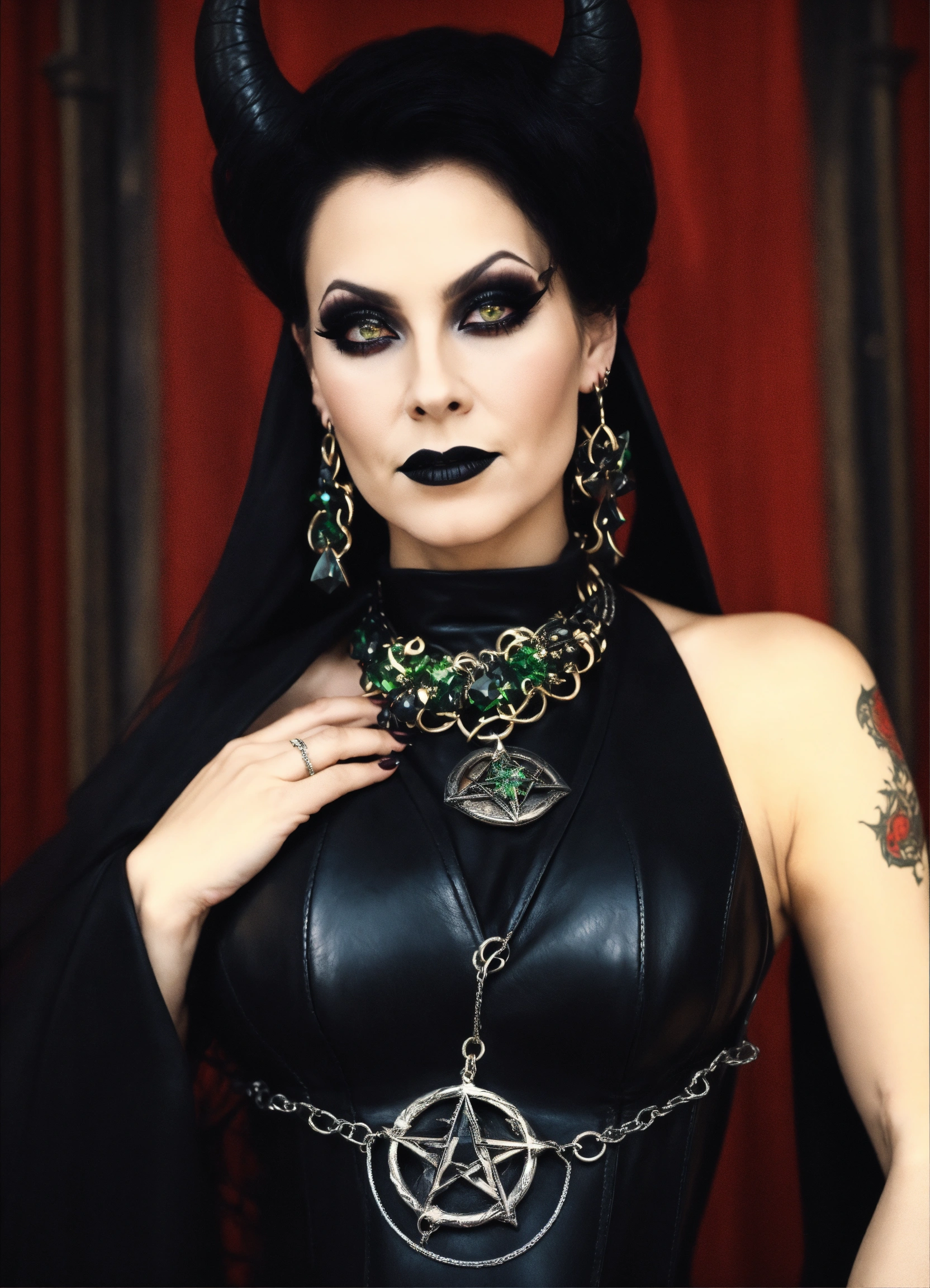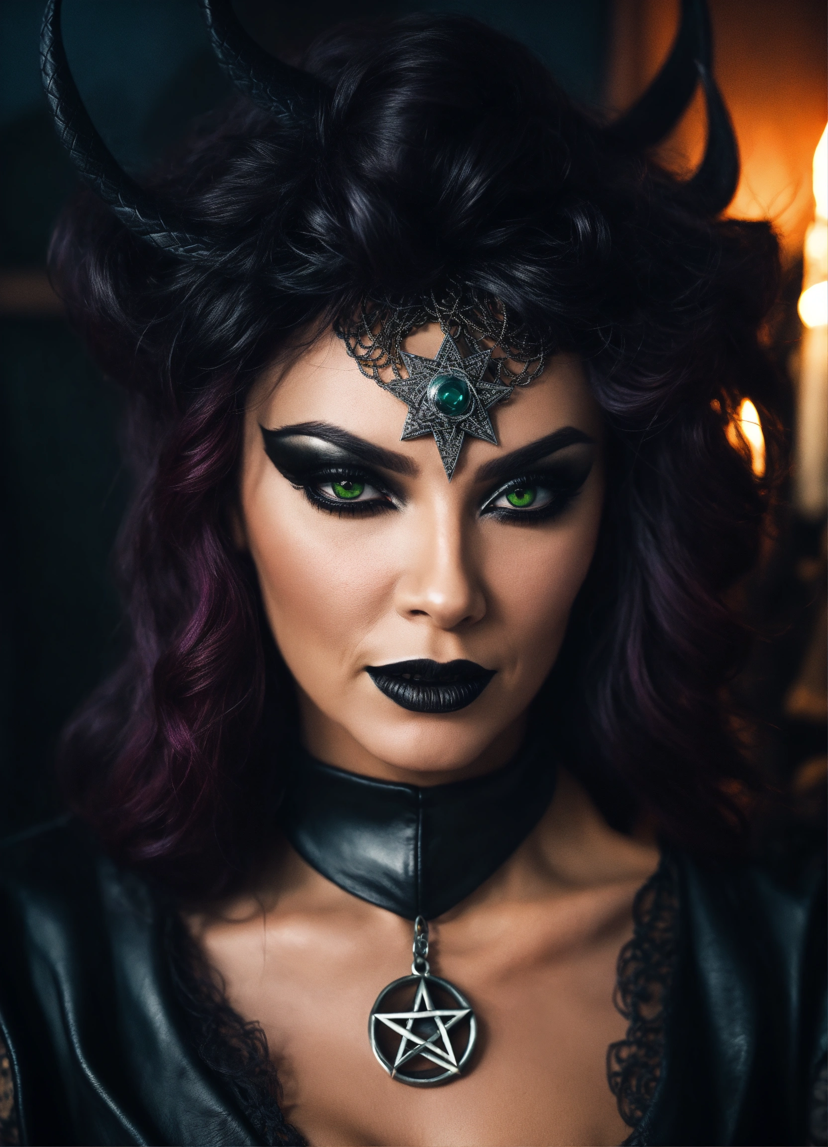 Beautiful extremely evil wicked satanic goth black witch mesmerizing you wearing black leather, evil diabolical wicked extremely powerful hypnotizing endora ursula medusa eyes, 5-point pentagram necklace on her neckline, dark sorceress who rules the universe all realms & all dimensions