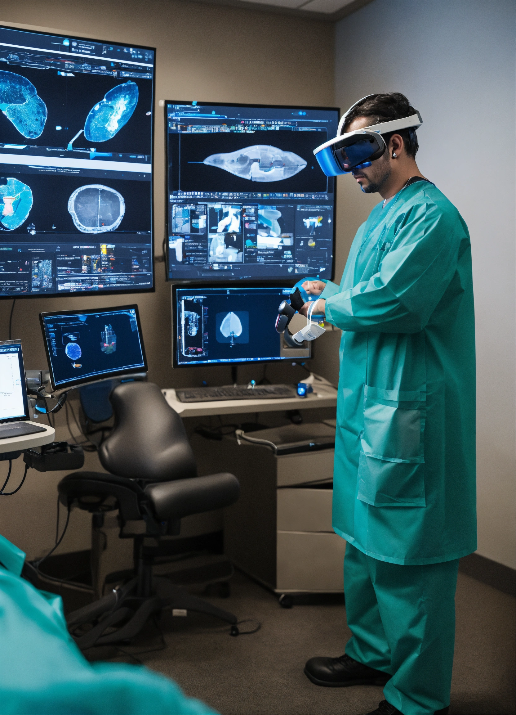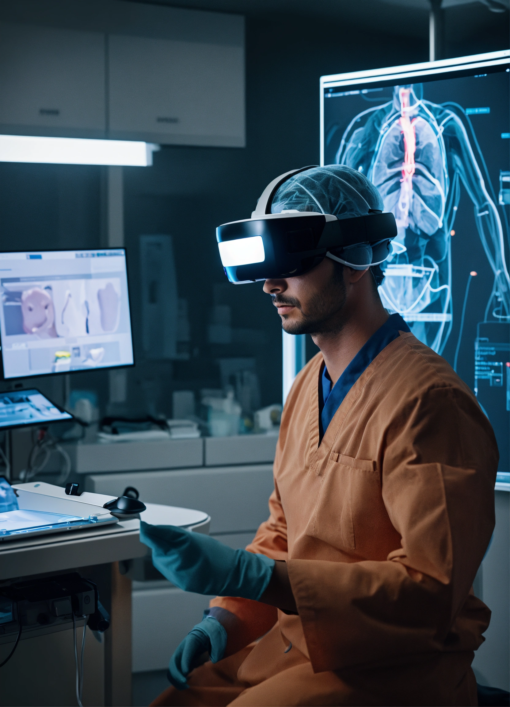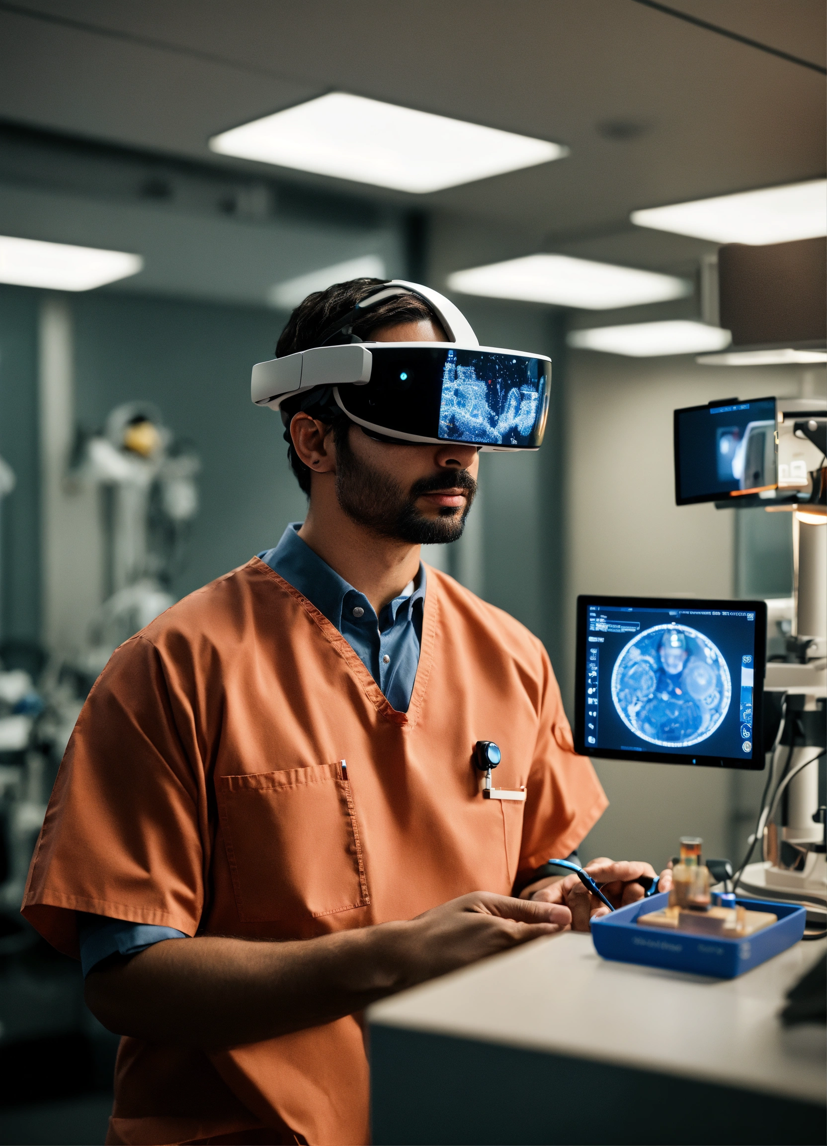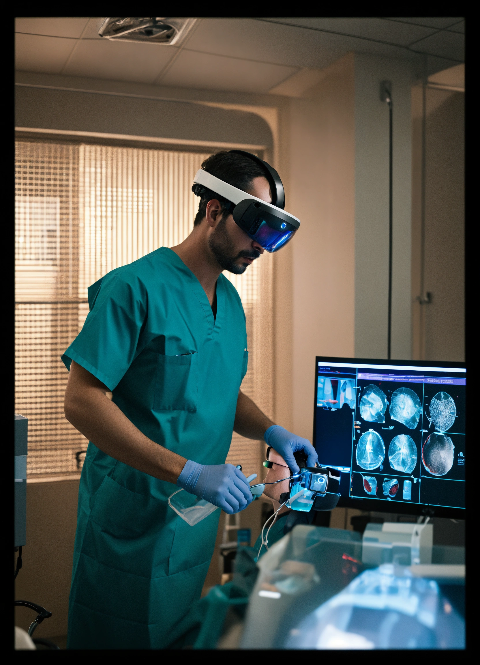 A surgeon examines a patient in his office using a hololens headset, he sees a lot of augmented reality data around him