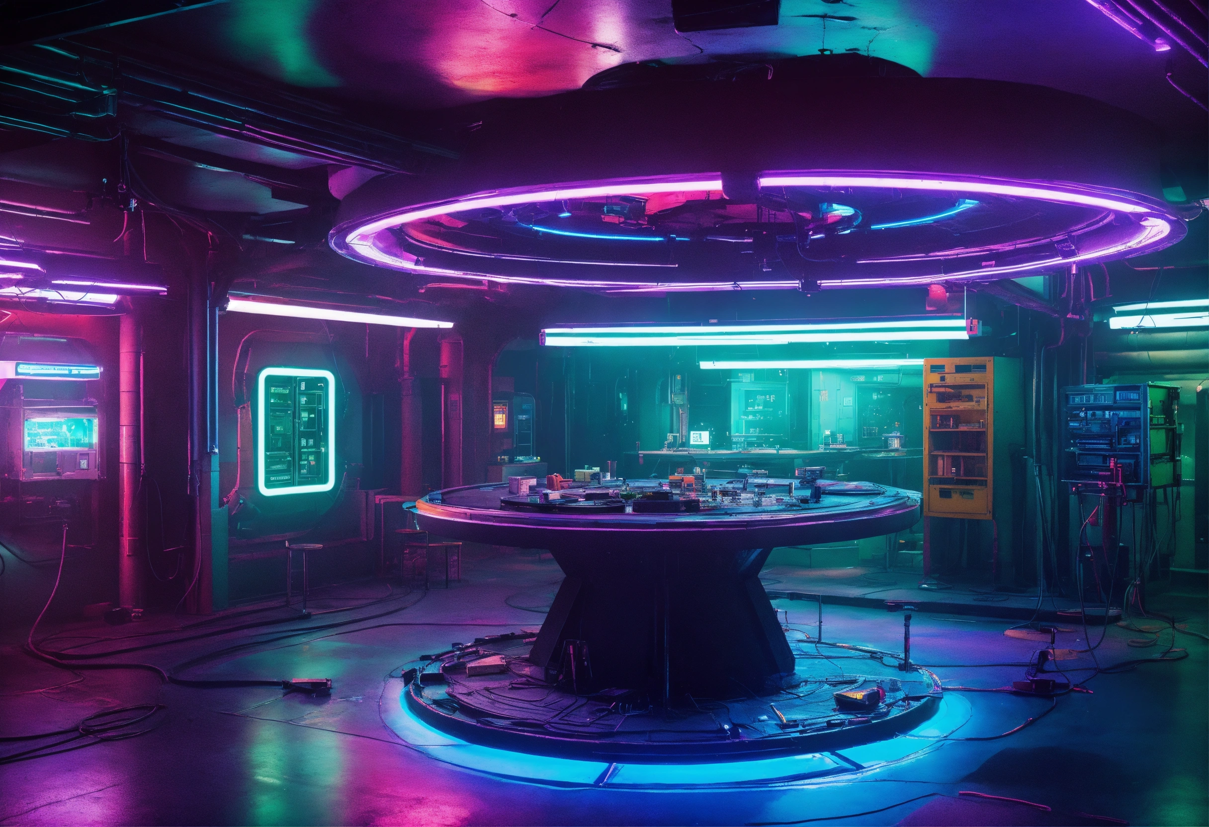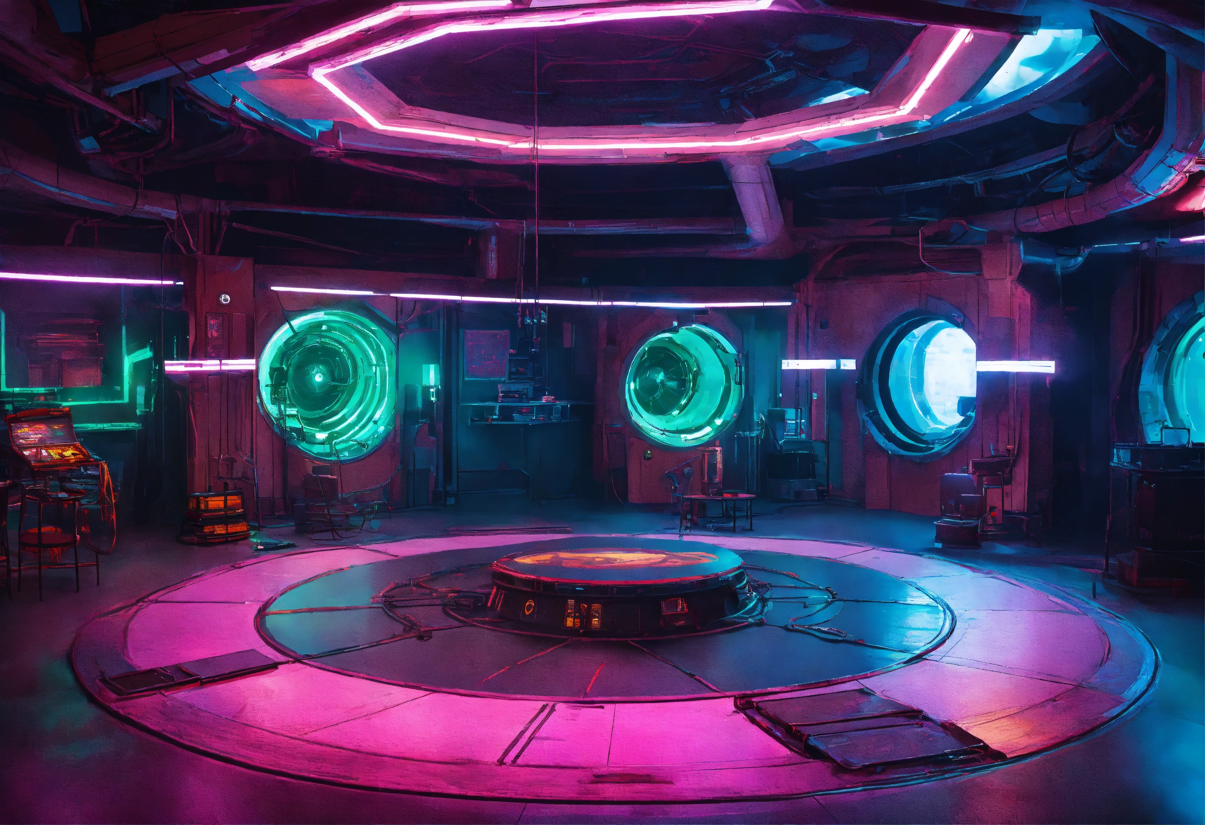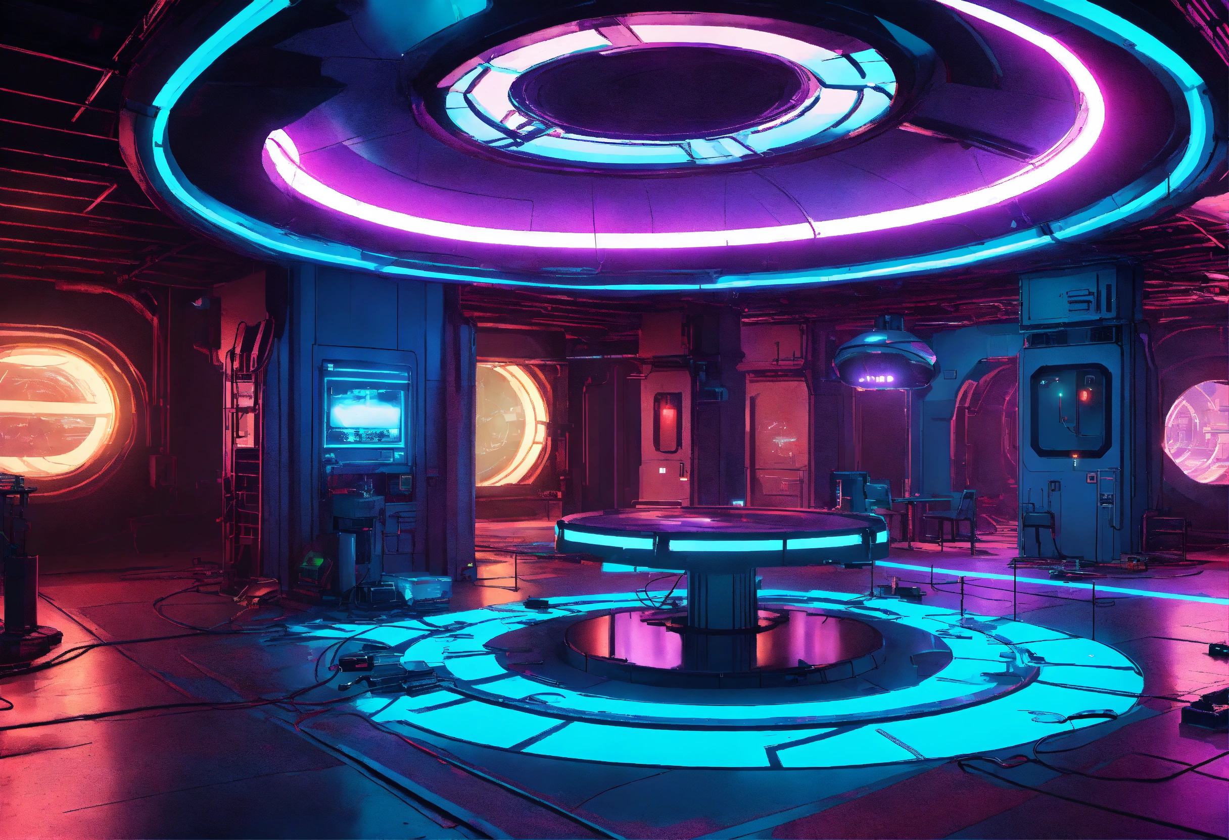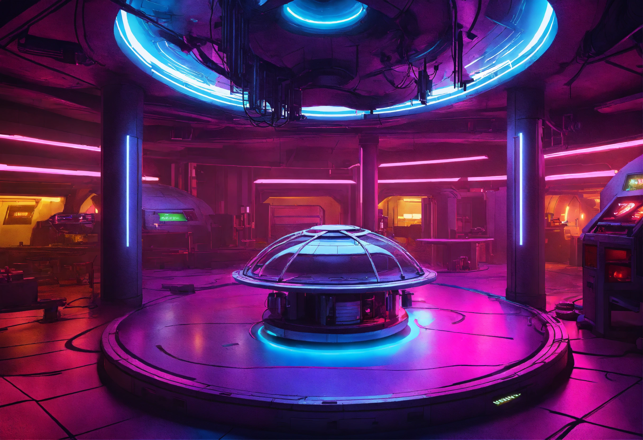 Underground sci-fi base with cool colors and neon lighting, large central round floor depression with overhead lights, tables along the walls were tech is being repaired