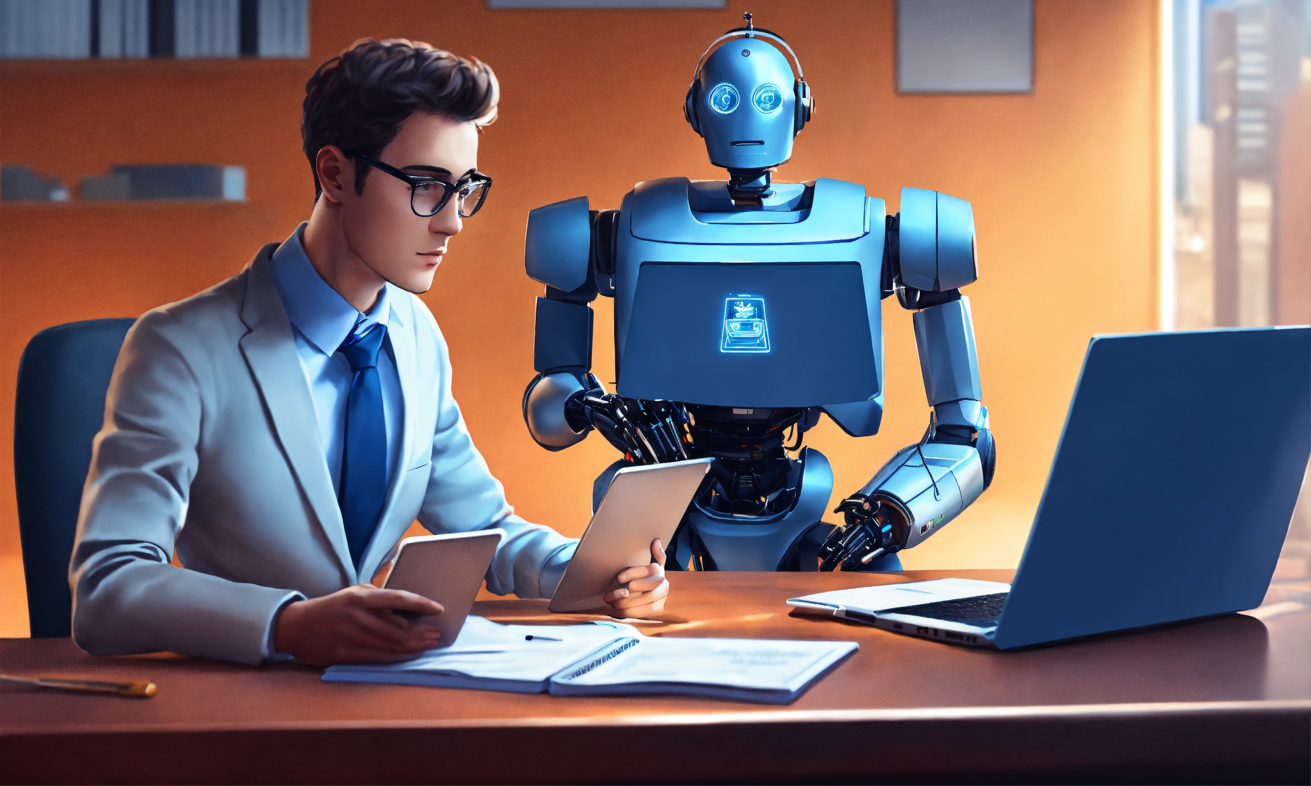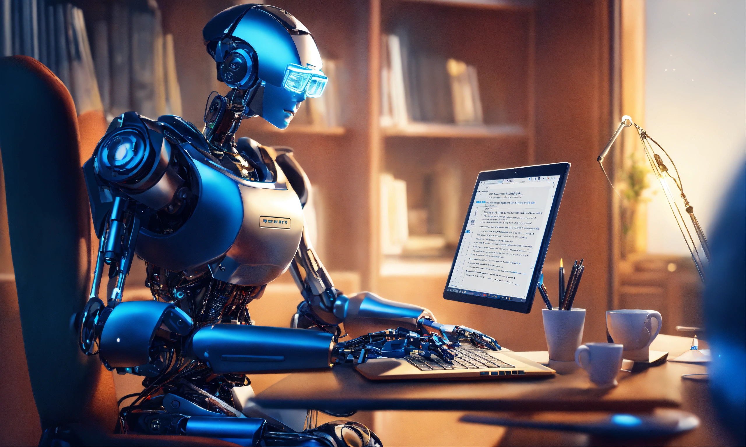 A perfectly rendered illustration of a legal blogger in the law firm, the blogger is typing on a laptop and the screen shows a virtual robot assistant helping the blogger write a blog post