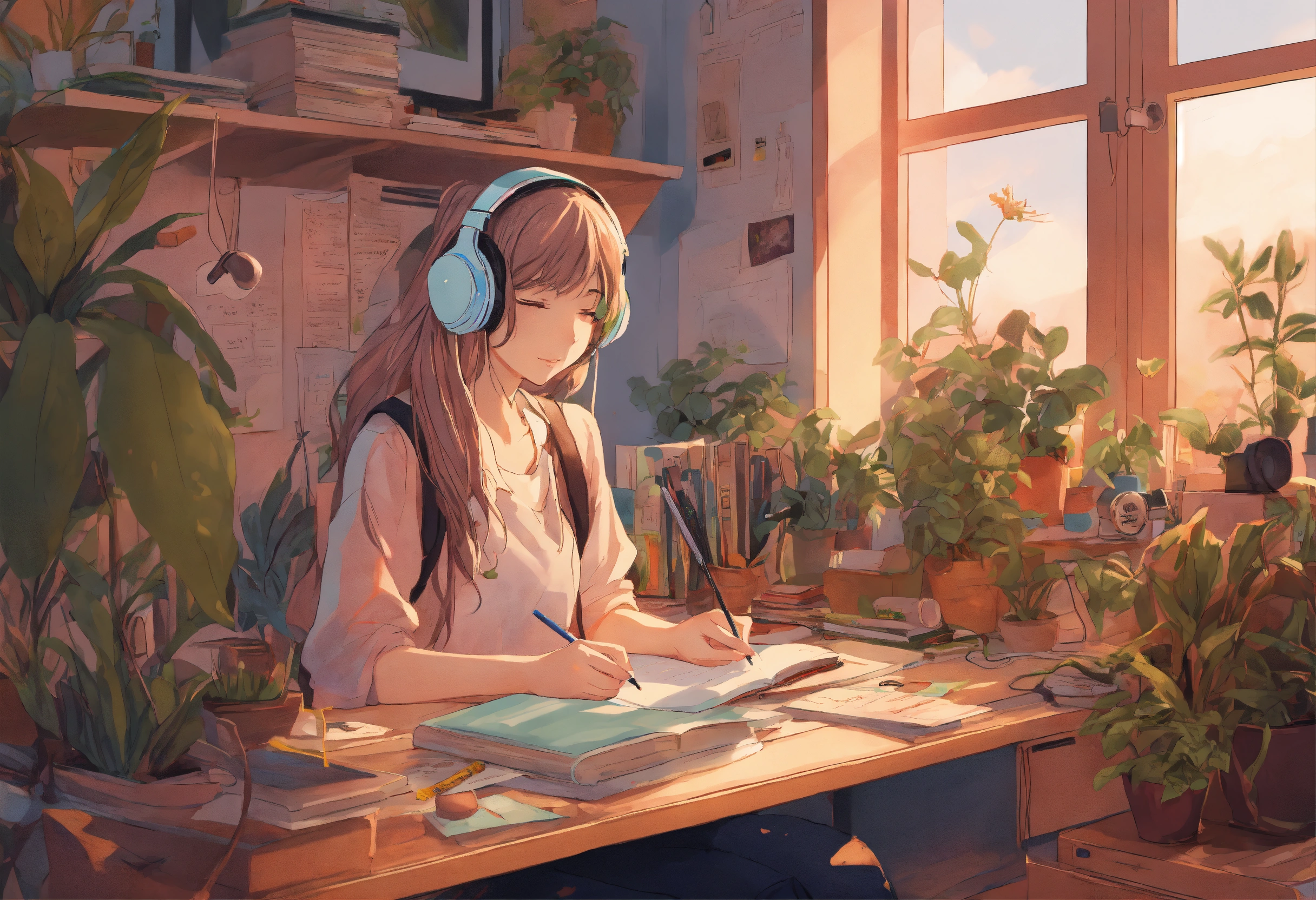 Anime girl at, her desk in the college dorm doing homework with headphones on pastel colors highly detailed, lots of plants and messy room