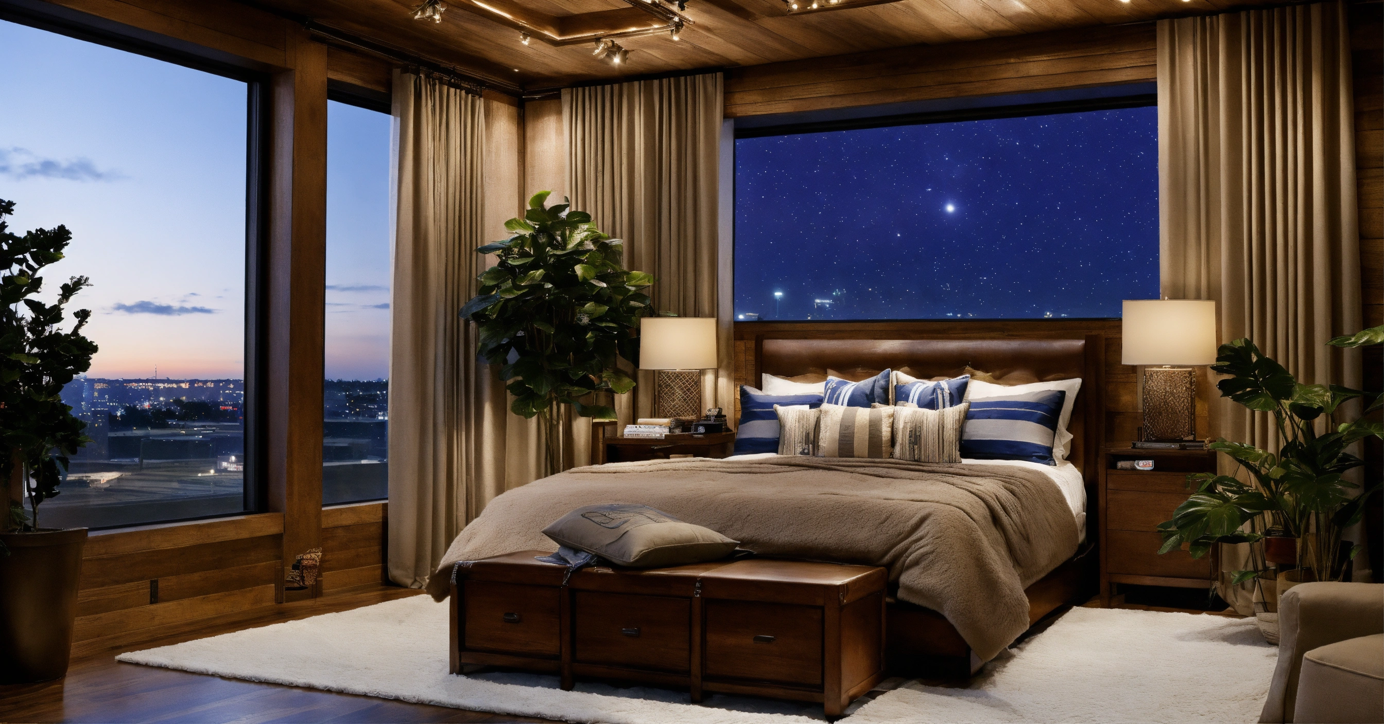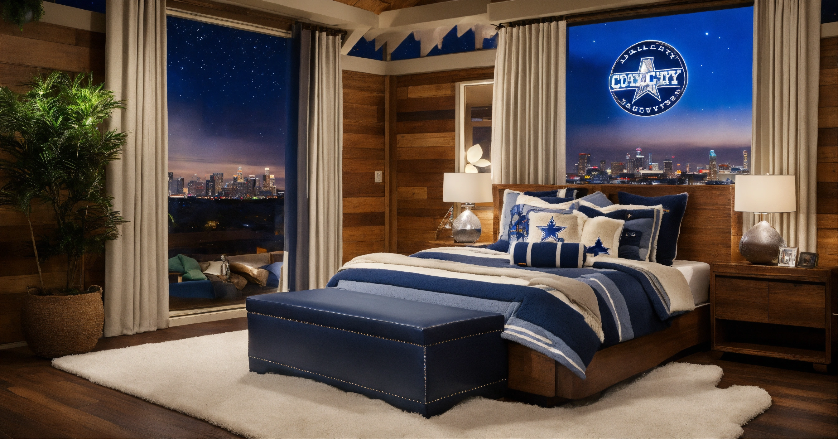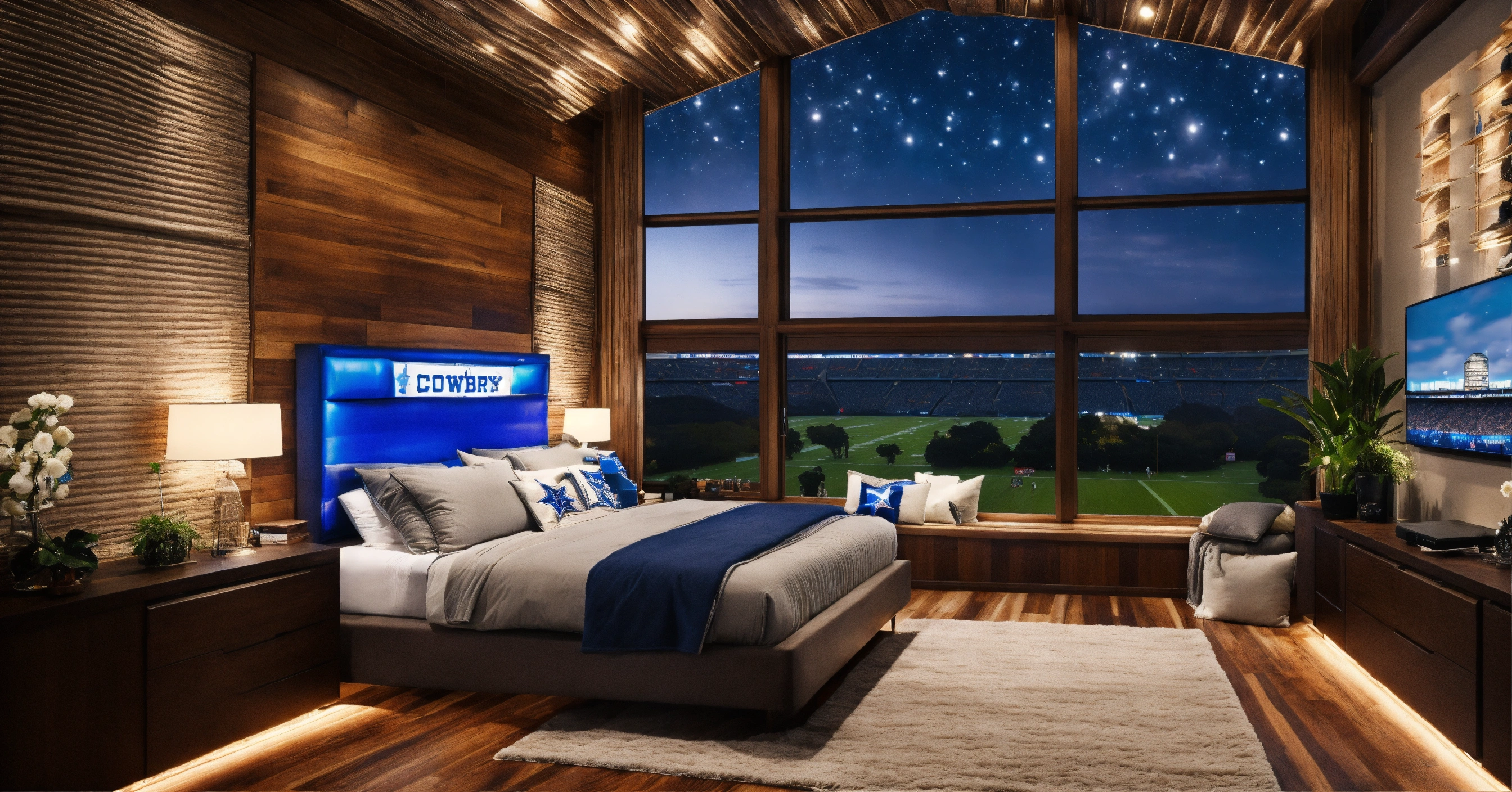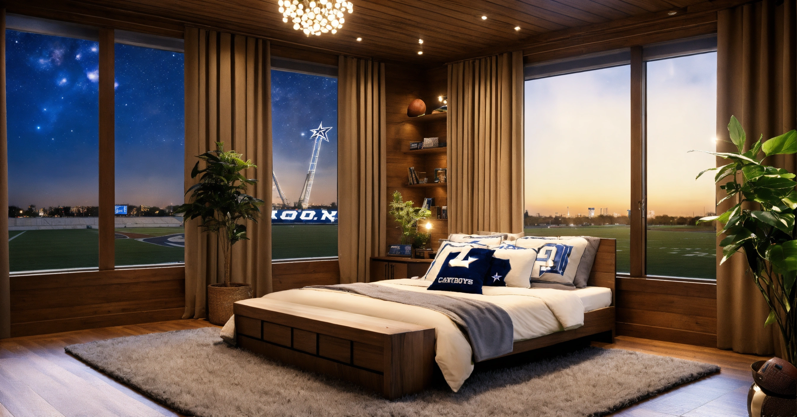 Dallas cowboy football bedroom, dallas cowboys football, wood floors, wood walls, night time big window, fluffy rug, star ceiling sky, big fluffy comfy pillows, plants, stadium windows