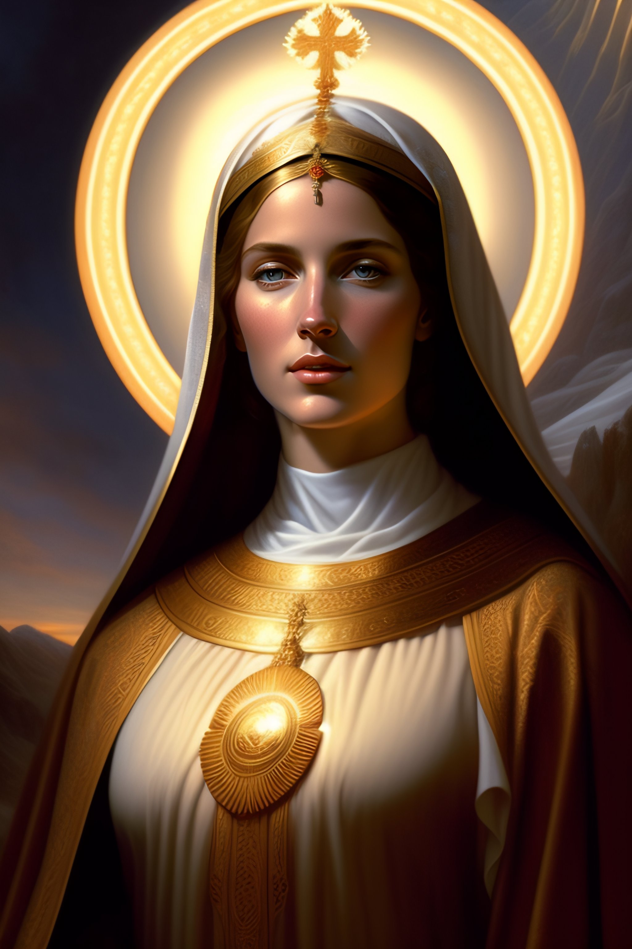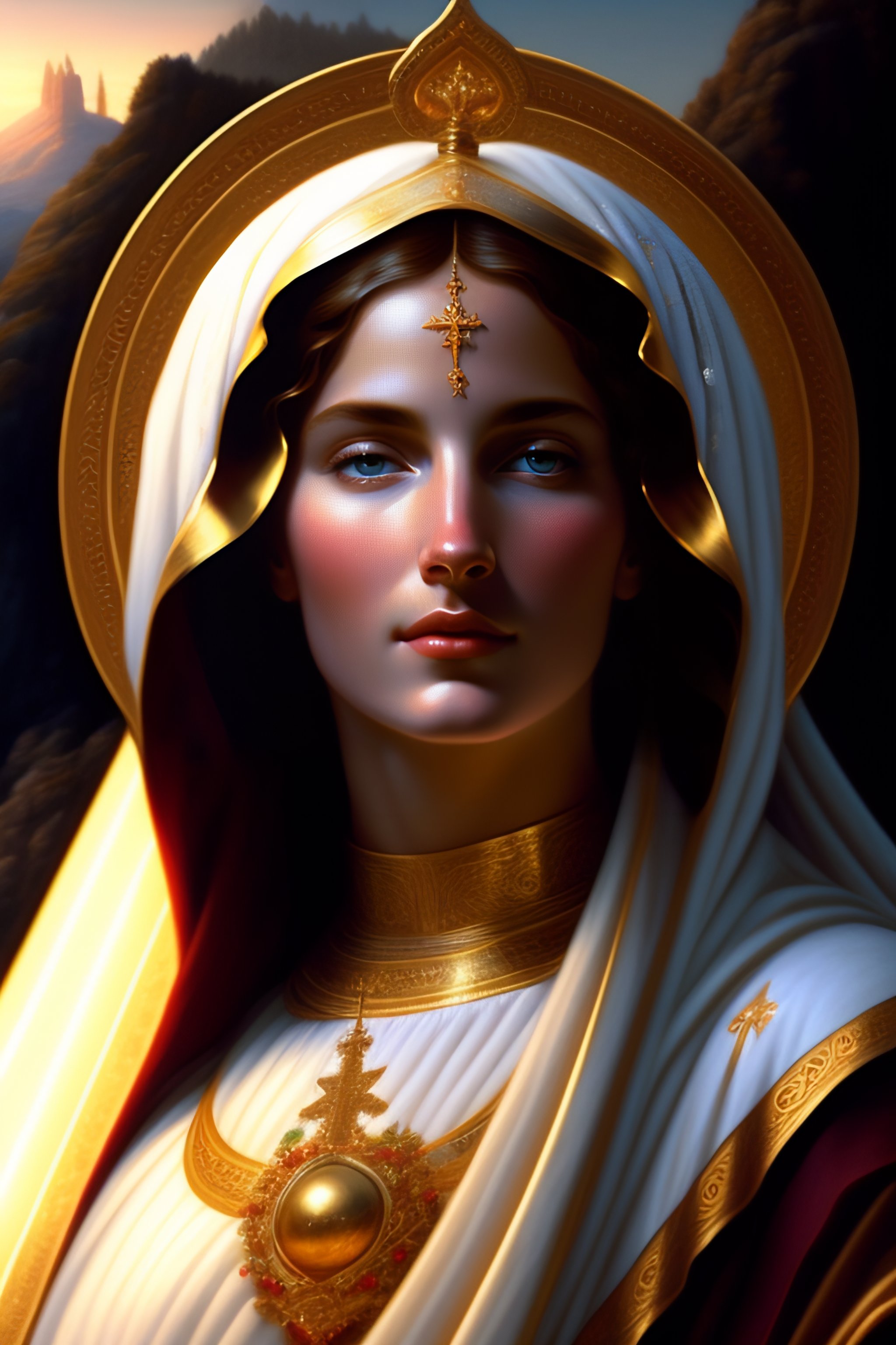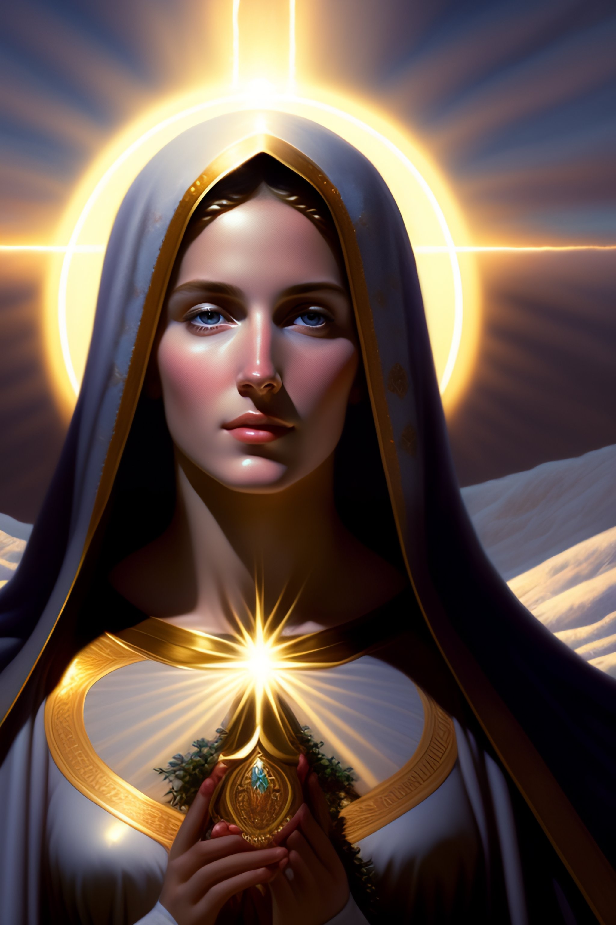 Virgin mary mother of jesus full body with beautiful robe and halo and rays of light coming out of her head on mountain, landscape, intricate, elegant, highly detailed, digital painting, arts station, concept art, soft, sharp focus, illustration, artwork by artgerm and greg rutkowski and tomas scholes and william - adolphe bouguereau