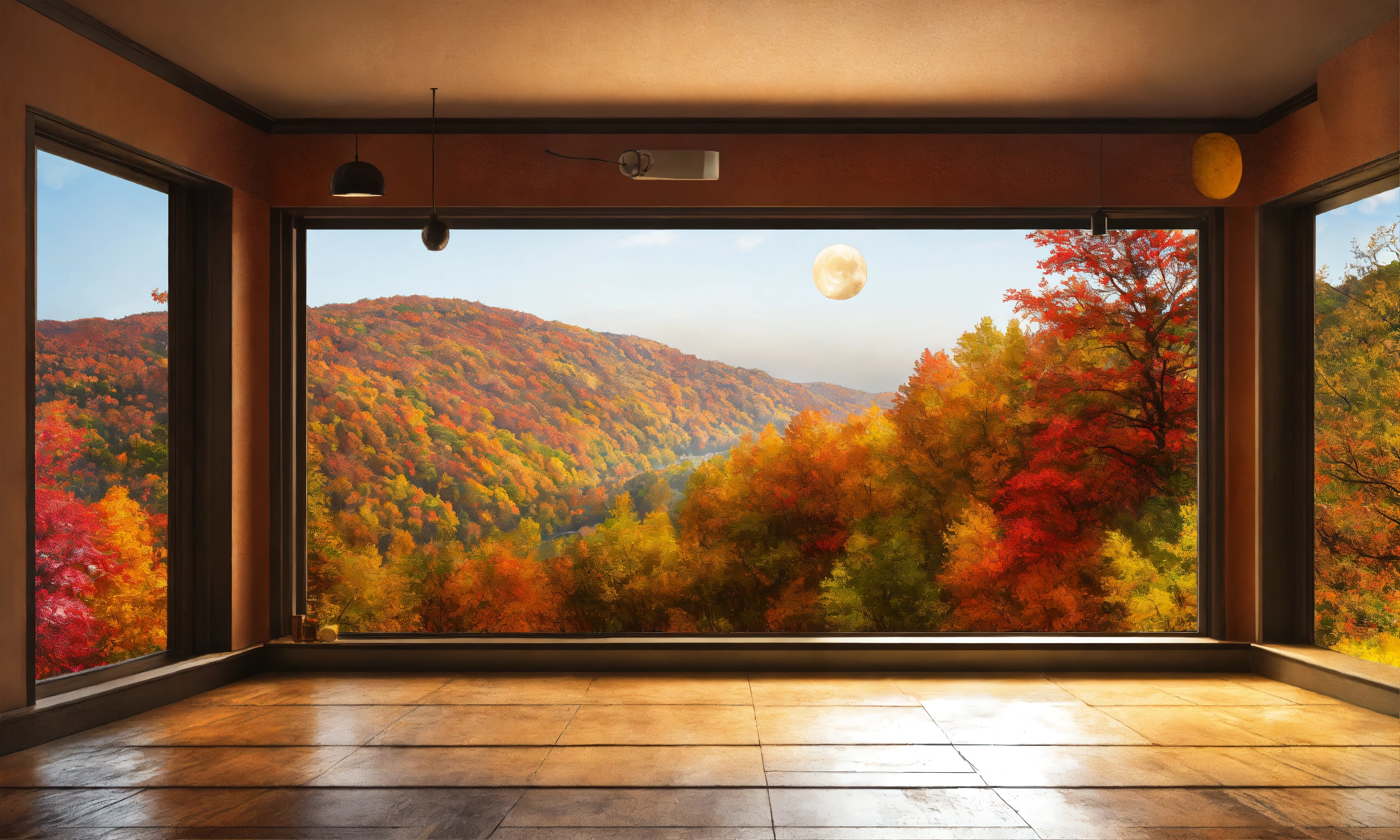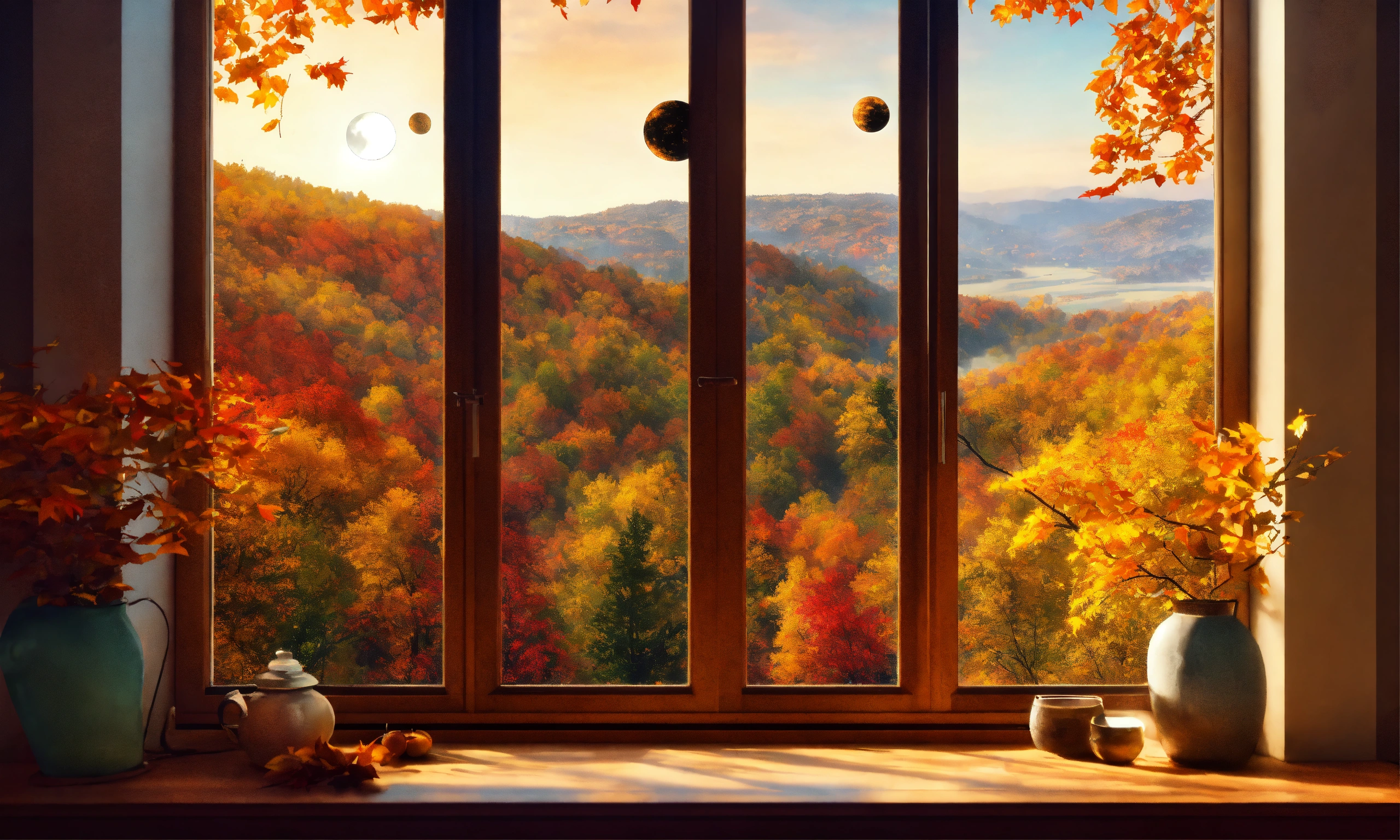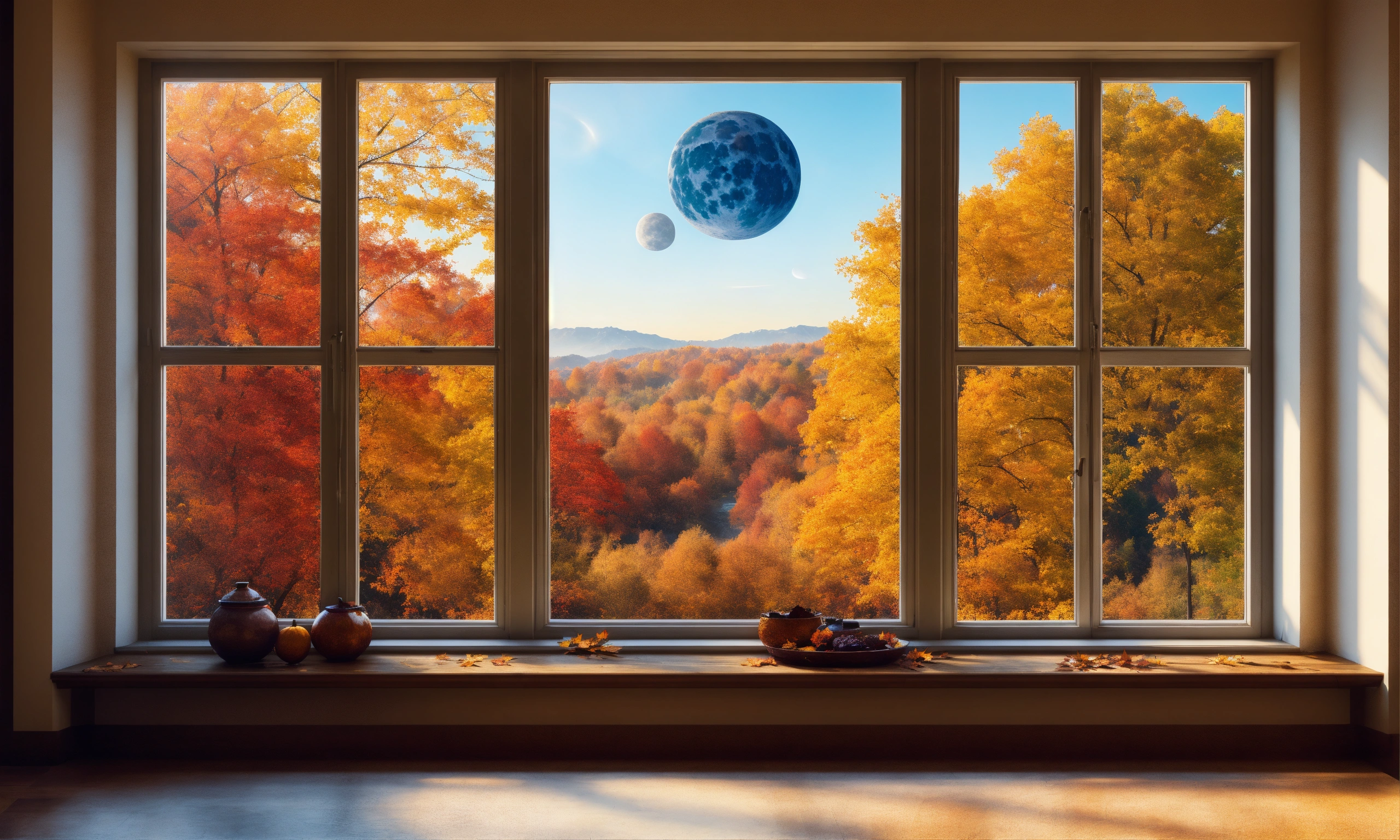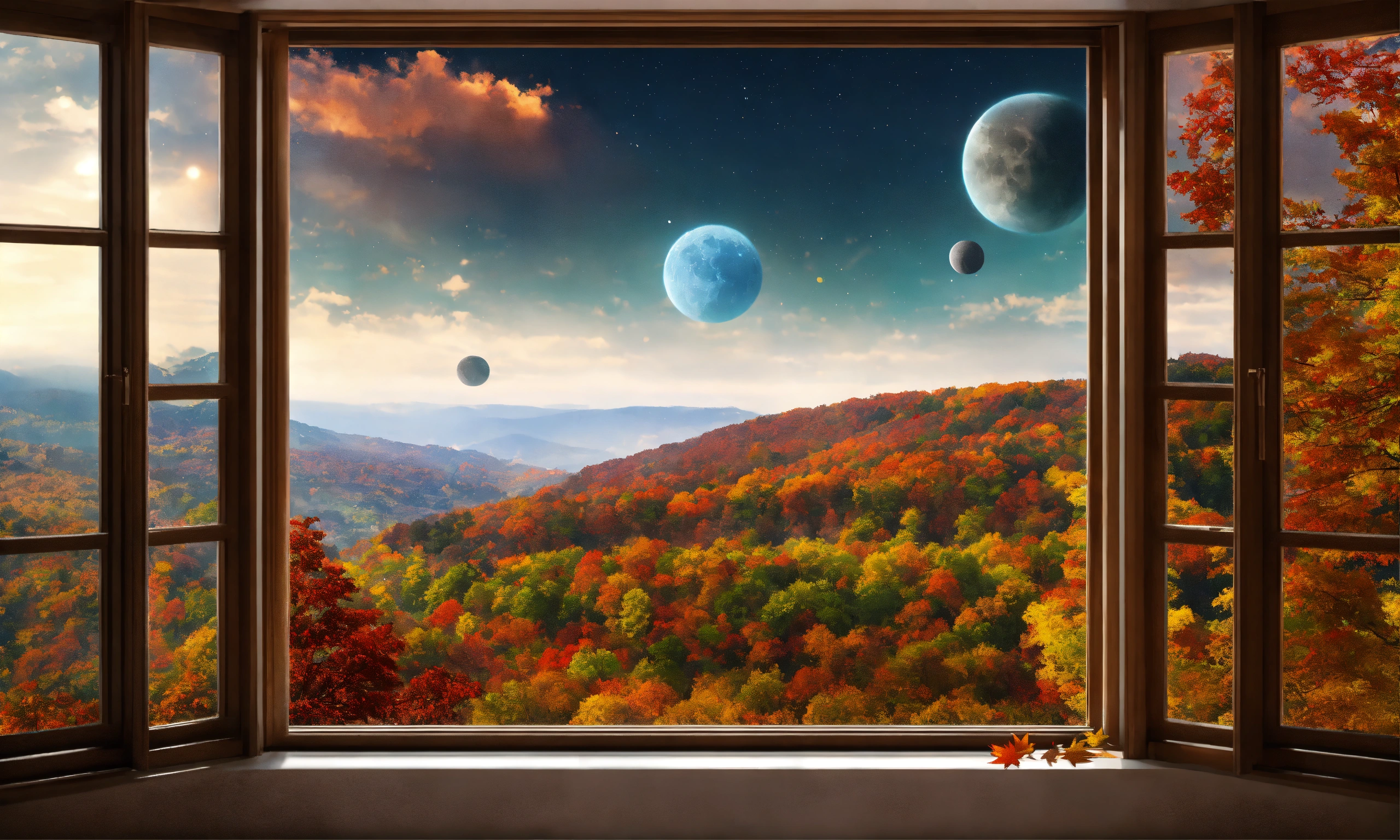 Interior window overlooking a valley filled with autumnal trees with colored leaves planet with two moons realistic photo quality