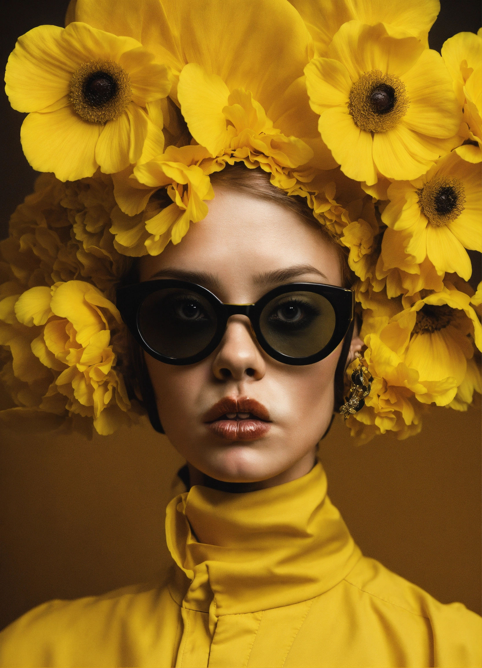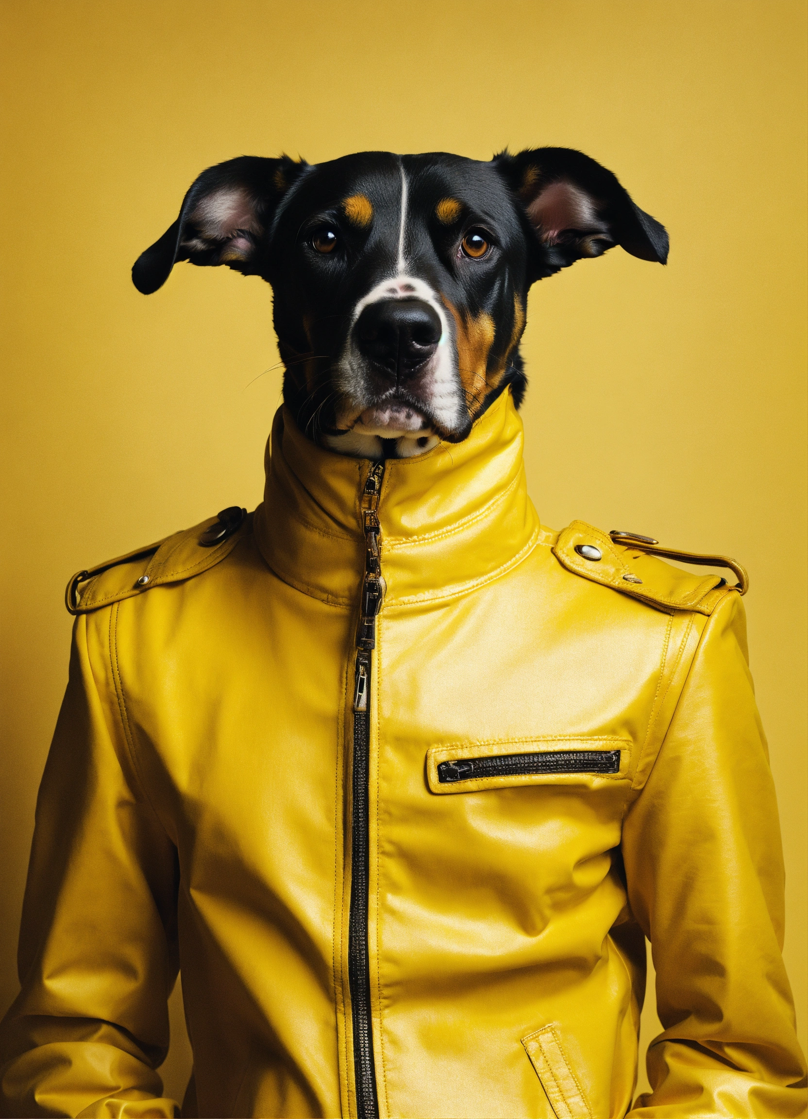 Dog face in human, avant-garde, simplyrgp, photo shoot spread, dressed in all yellow and black, vintage style, harpers bizarre, cover, headshot, hyper realistic