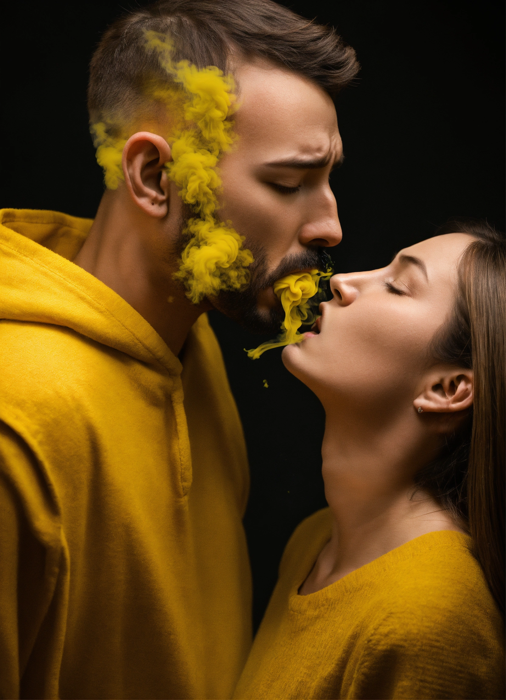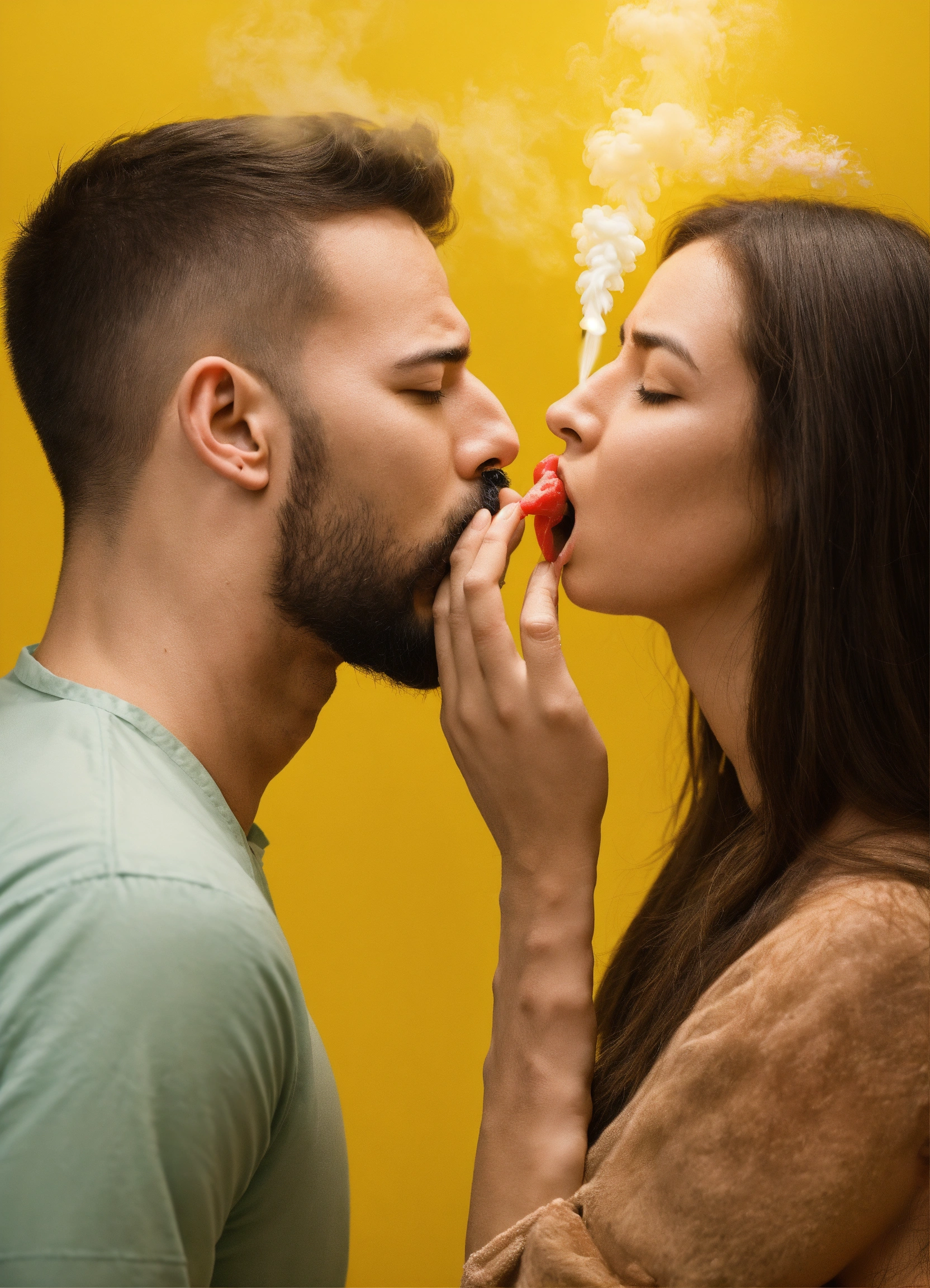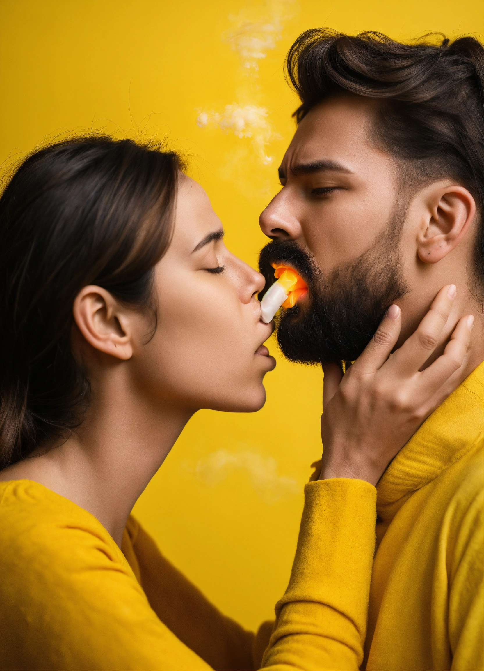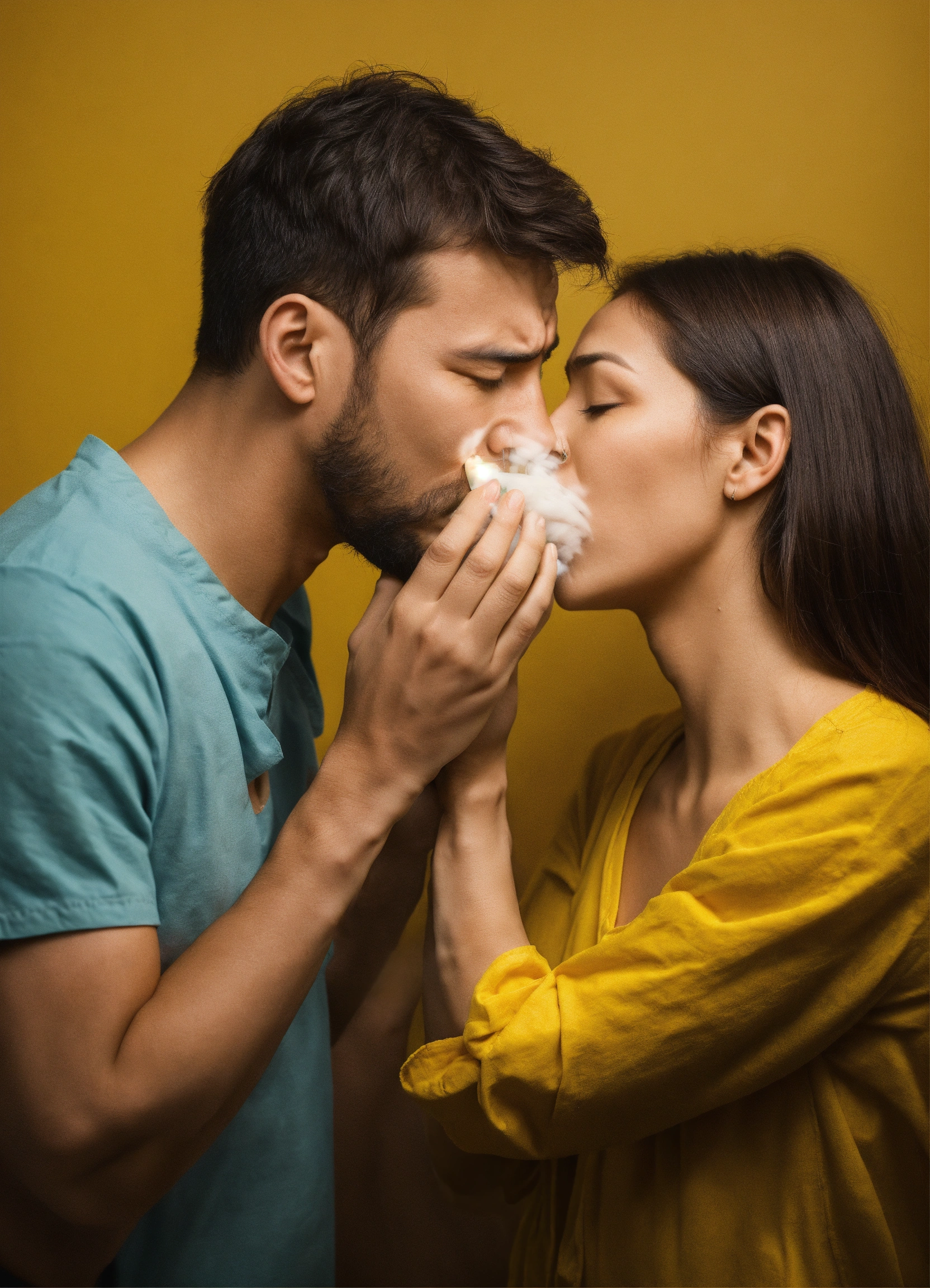 A realistic photo of a man exhaling yellow foul vapor from his mouth, and a woman covering her nose with her hands against the foul odor and looking questioningly. medical theme of bad breath odor.