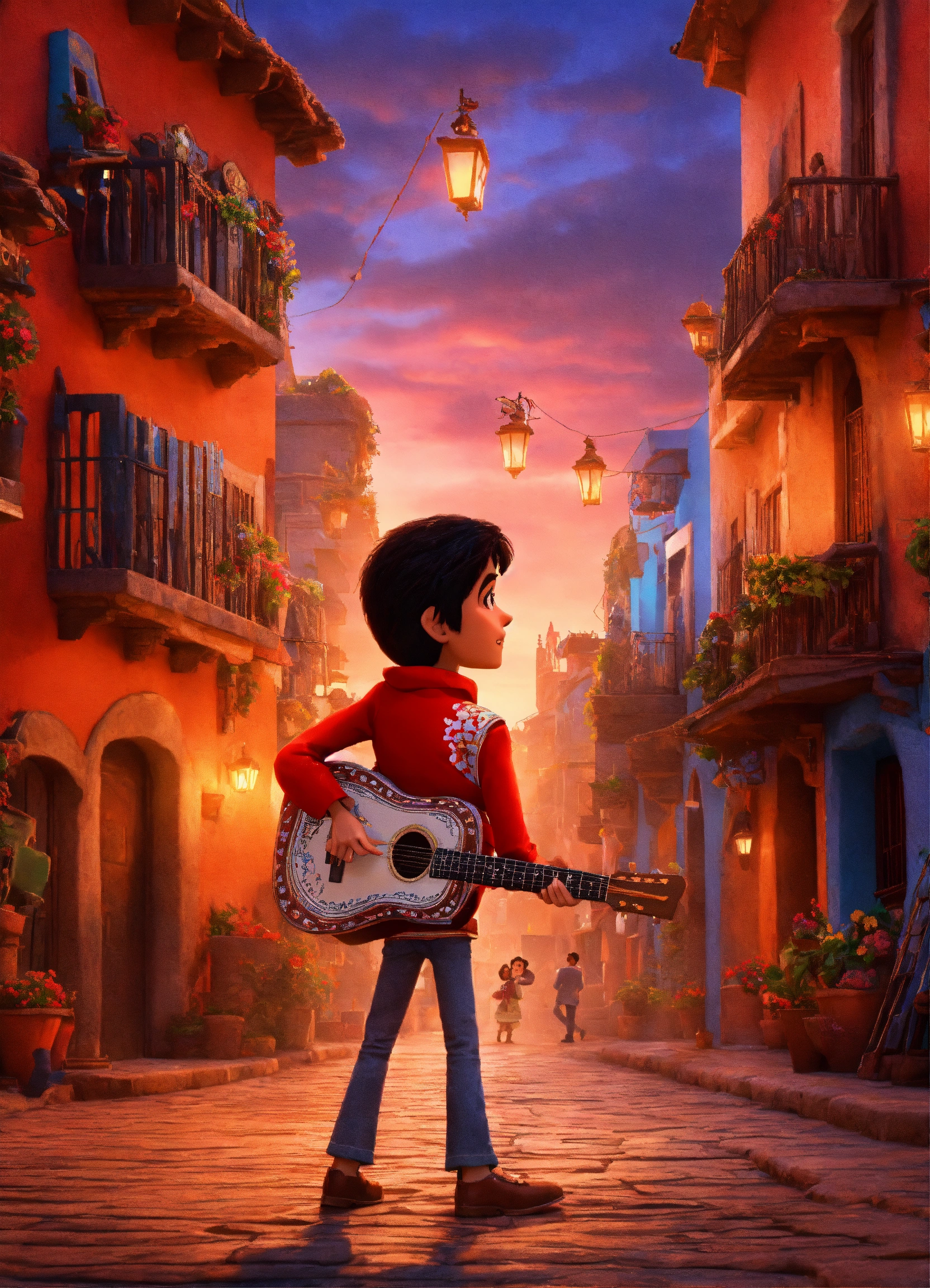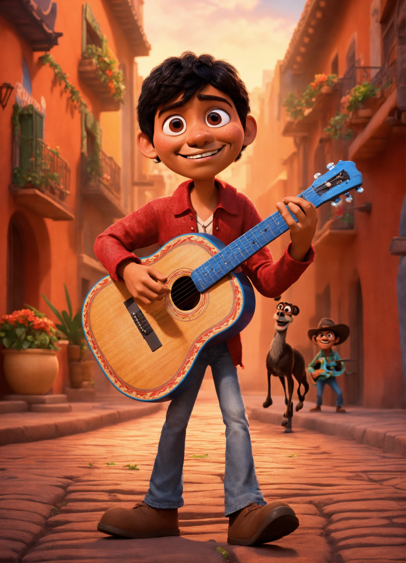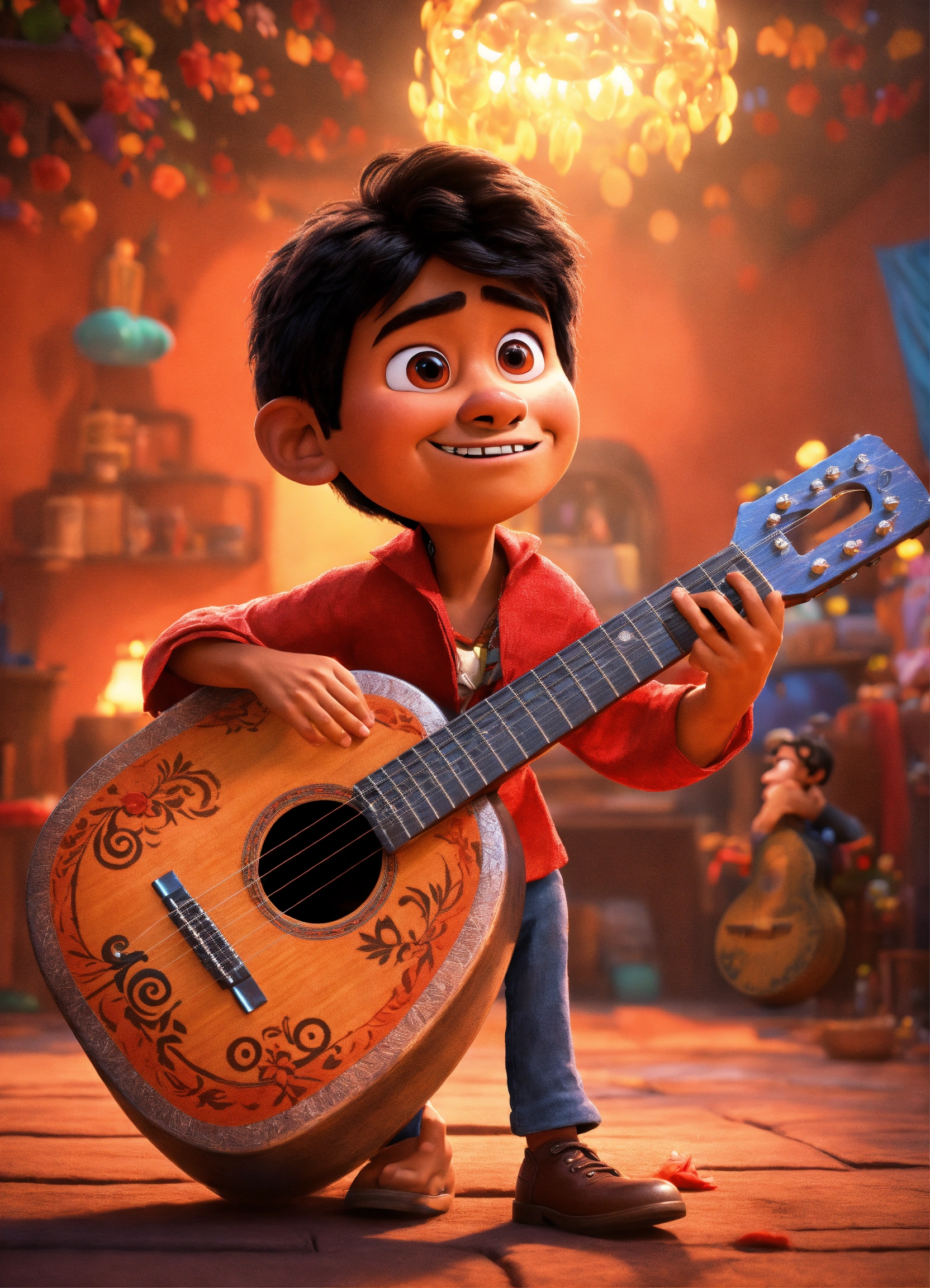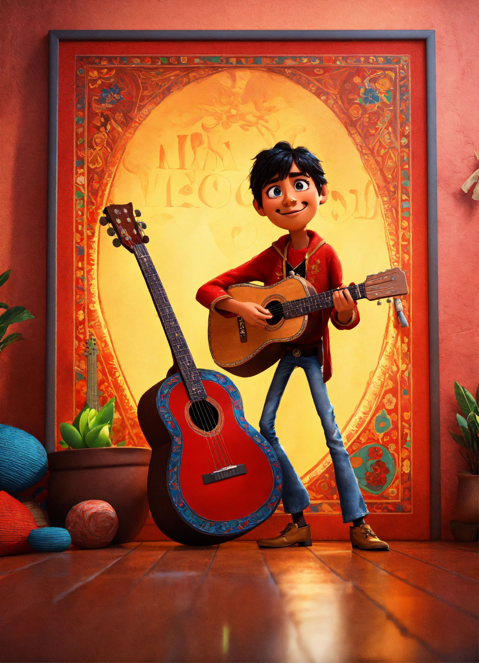 Make disney pixar poster ambience like coco movie, the character is a man, the man wearing red cloth, the men is holding a guitar, the man has brown skin and black hair, the poster has an old mexican background style, 3d animation