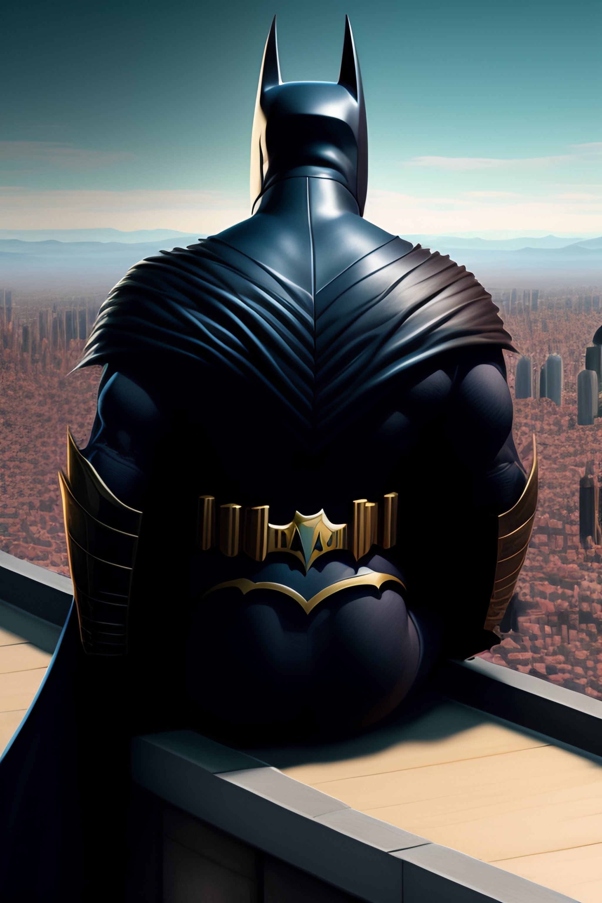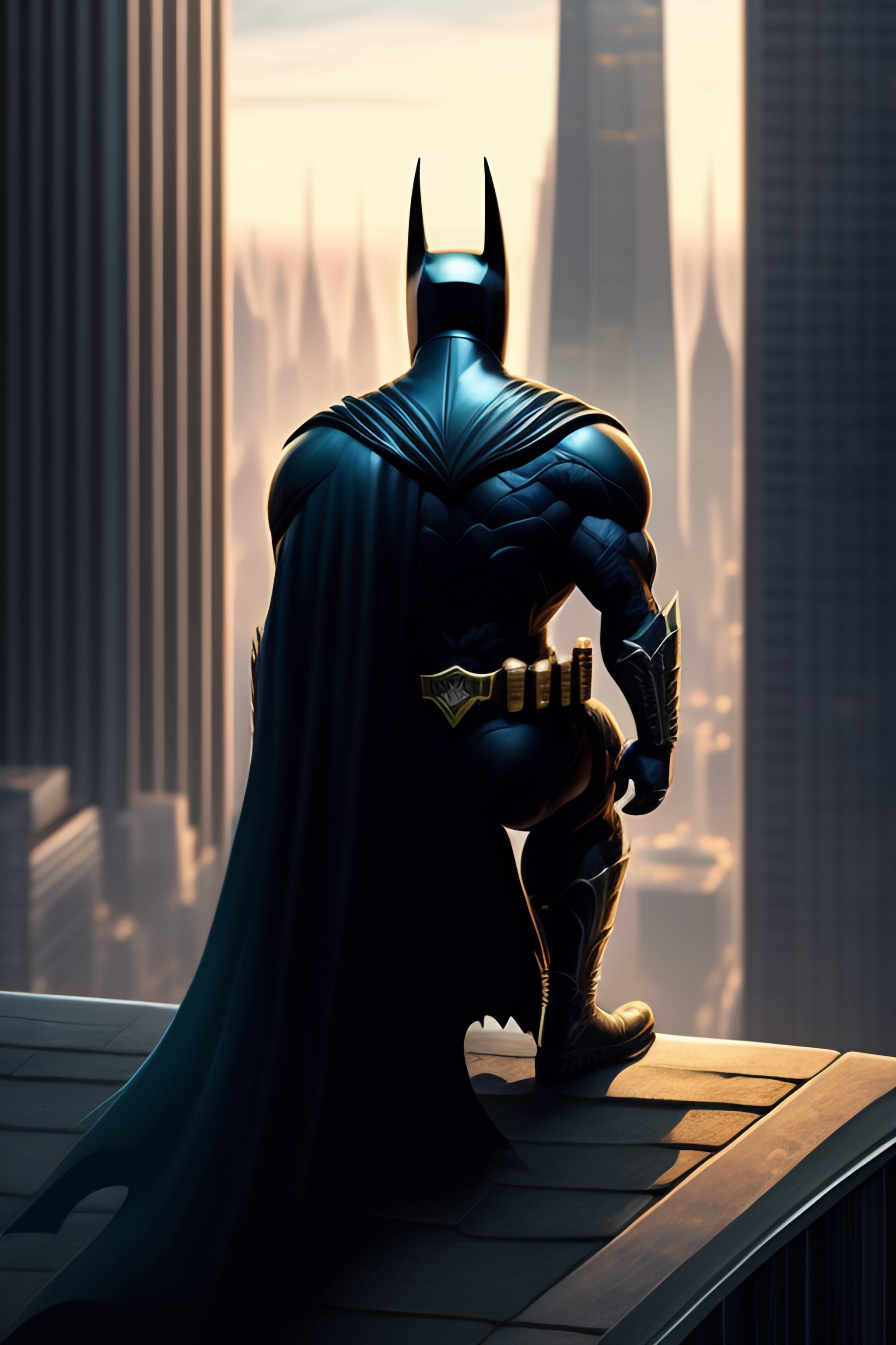 Batman sitting on a roof looking down at a city below