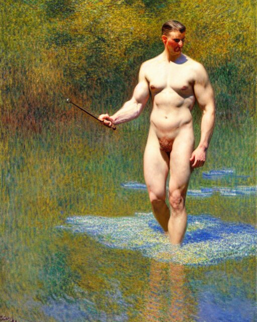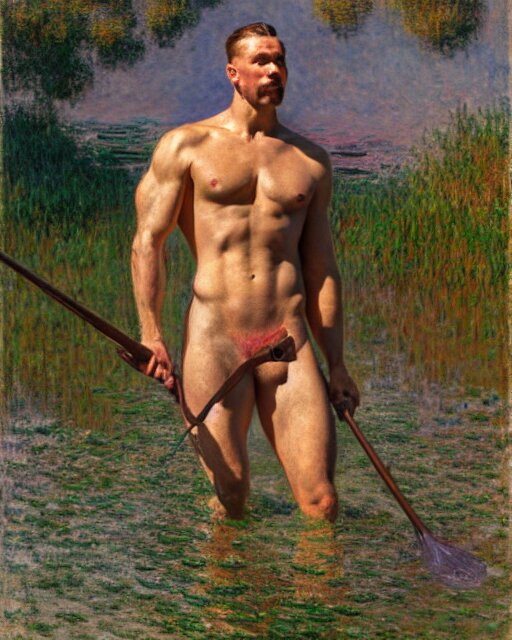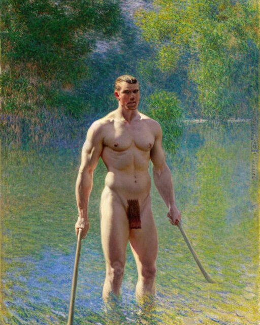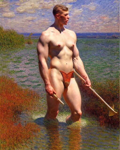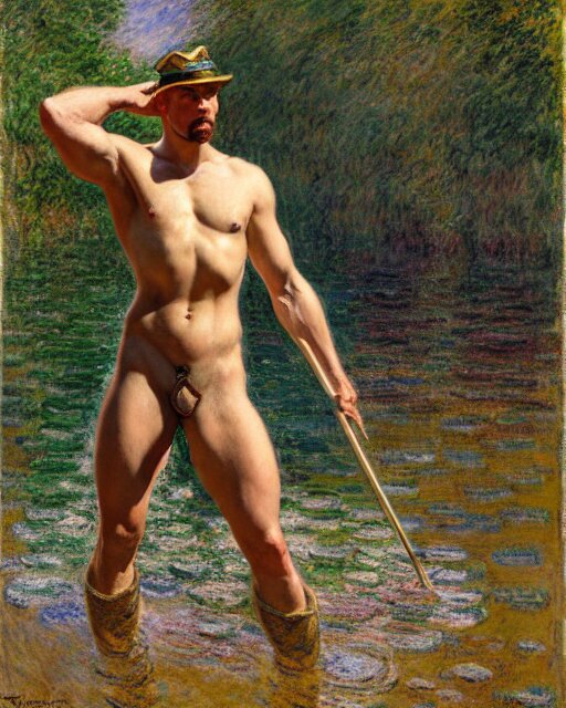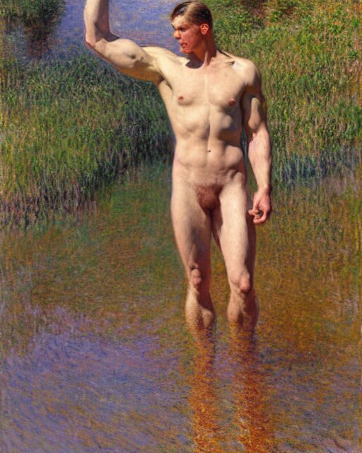 Muscular soldier wading through a river, sunlight shining on his skin, reflective water, painting by tom of finland, gaston bussiere, craig mullins, j. c. leyendecker, claude monet