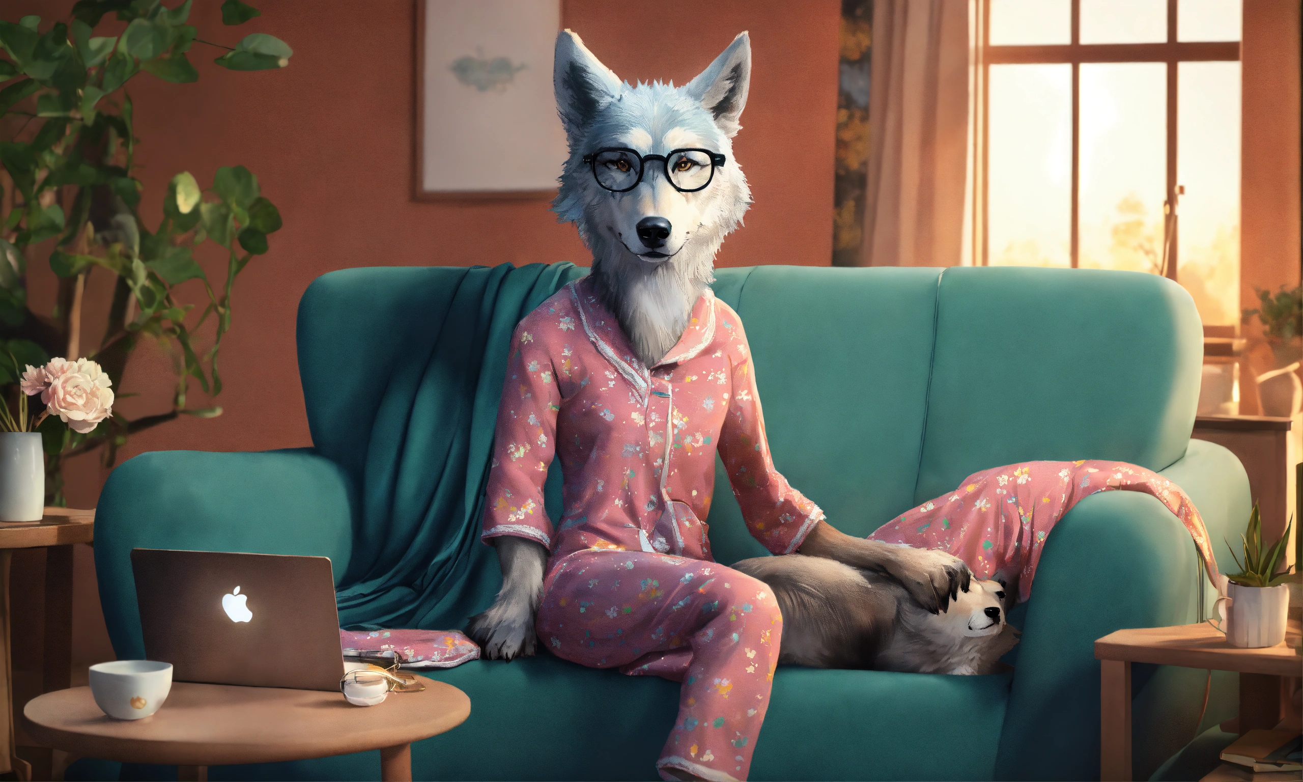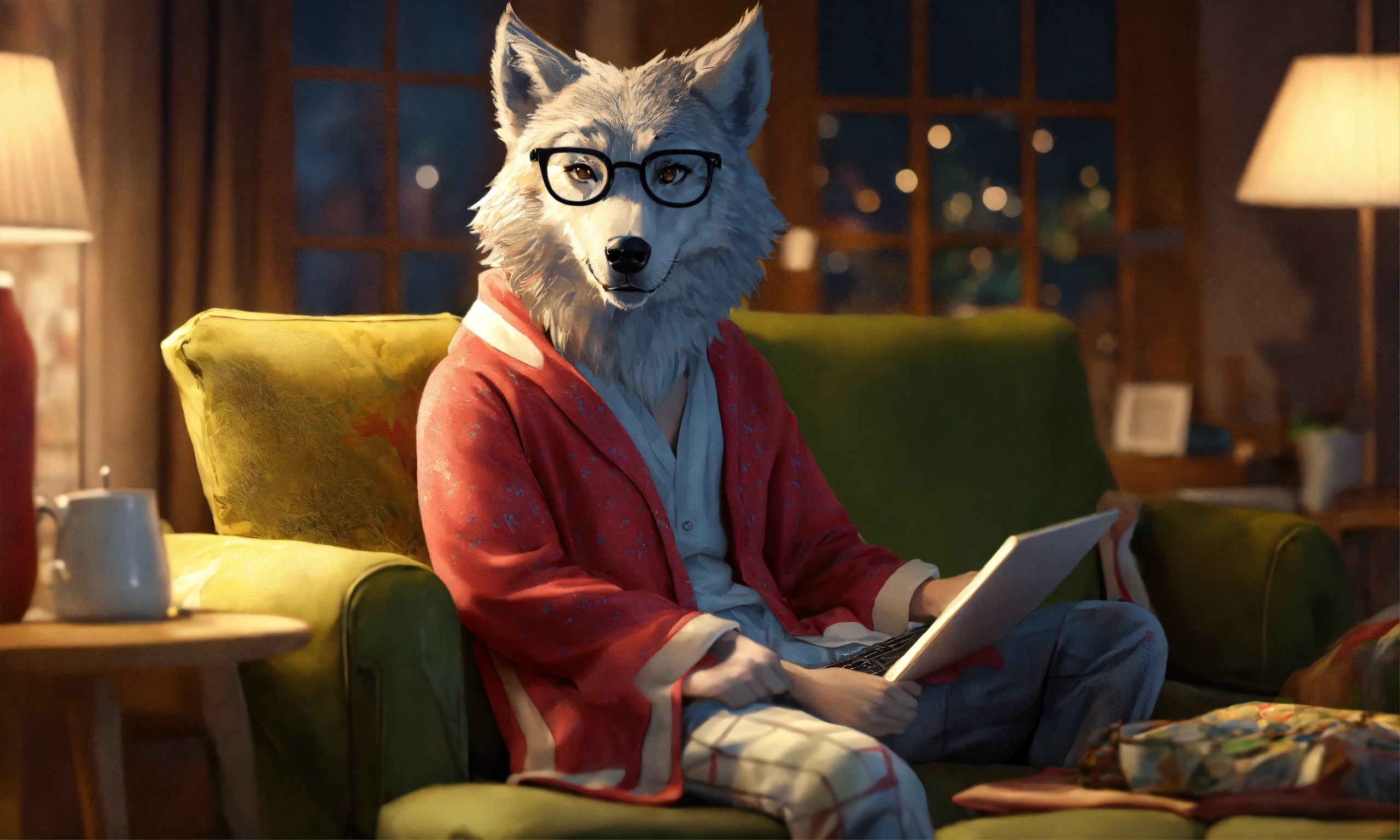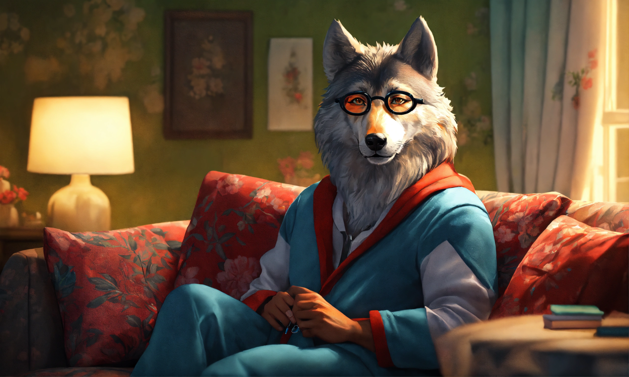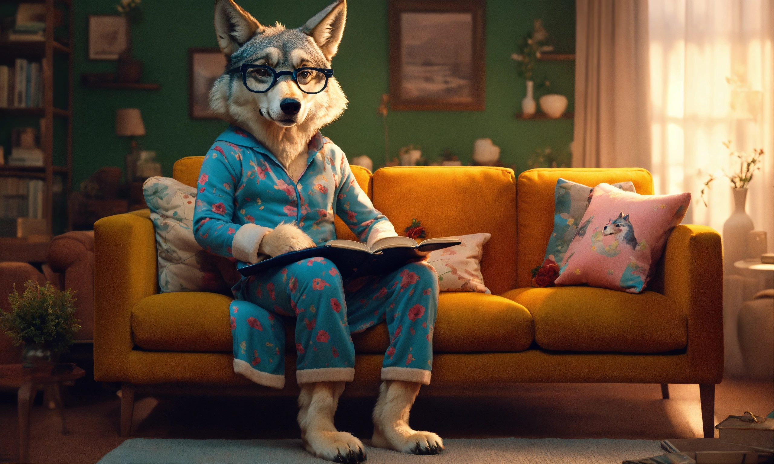 A humanised modern tall wolf, with muscles, home background, wearing grandmother's eyeglasses and women's pijama, seated in sofa, 4k
