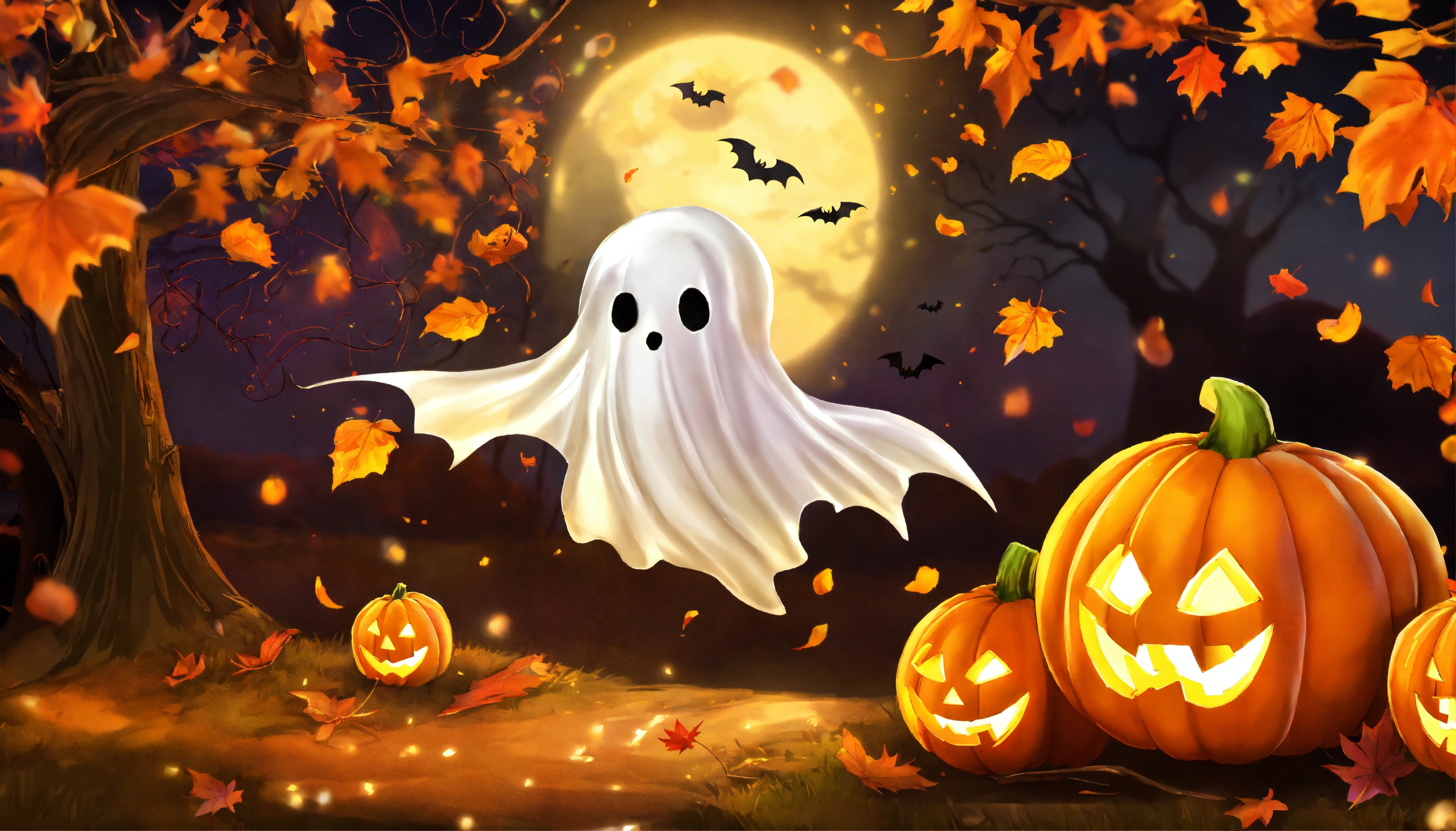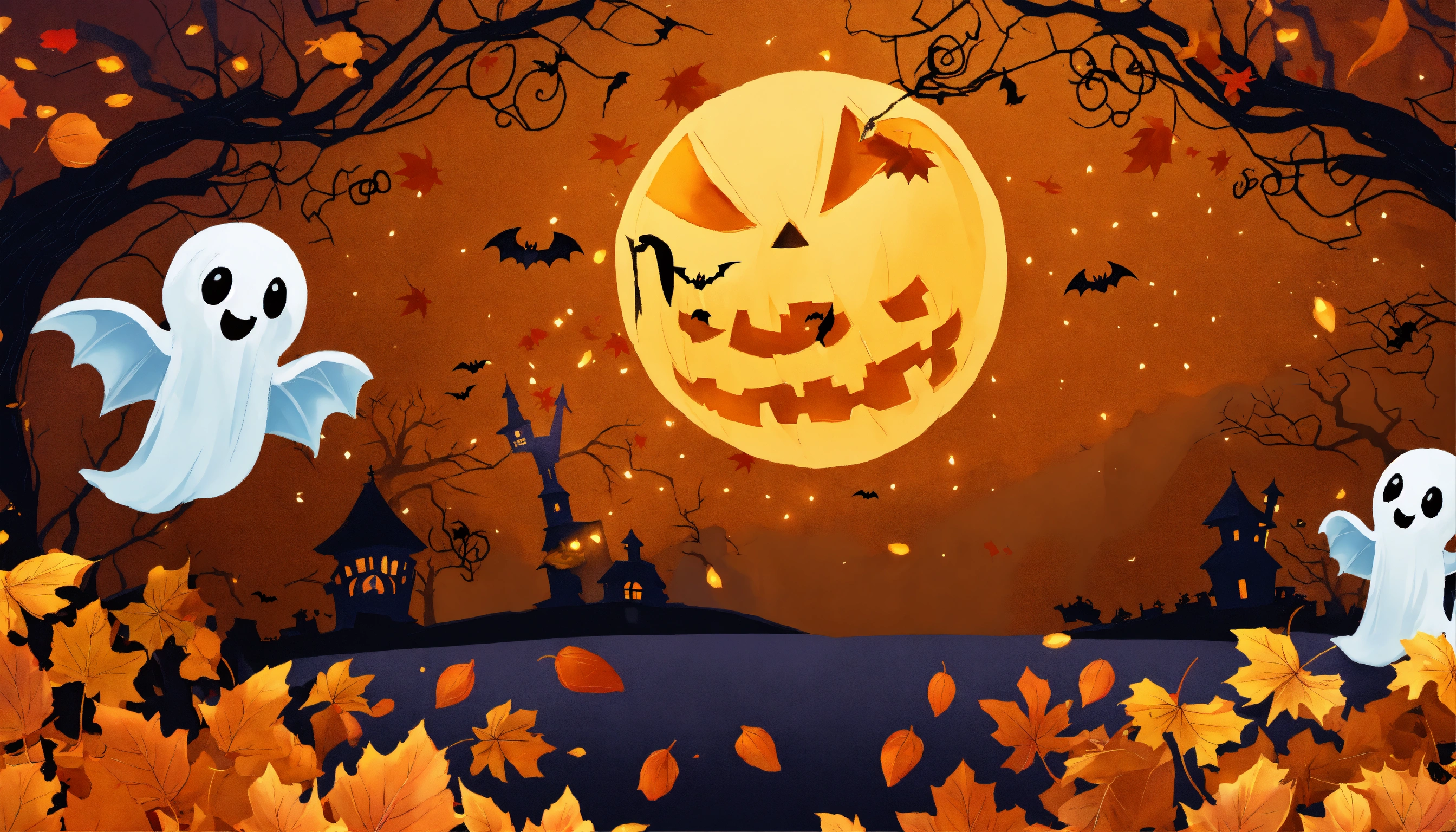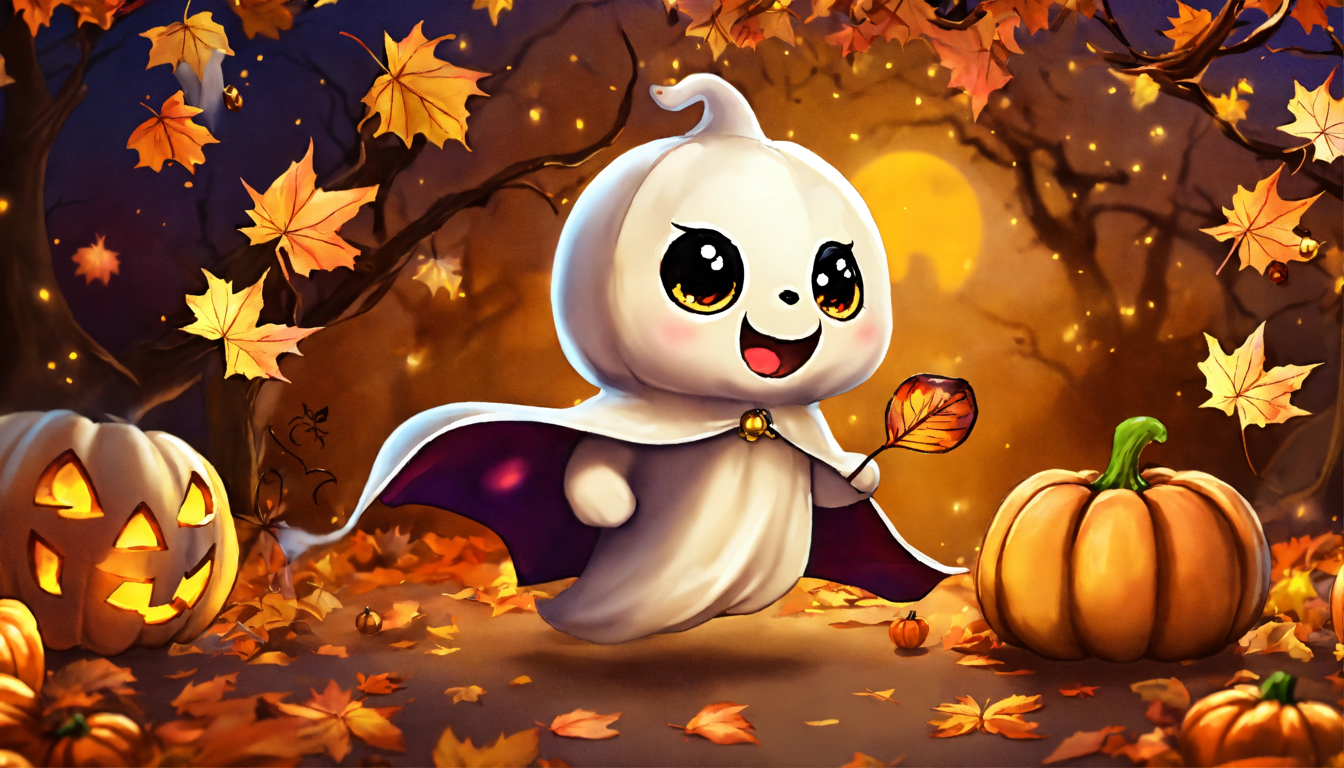 Halloween chibi ghost detailed flourishes fall leaves bats magic twinkles halloween background