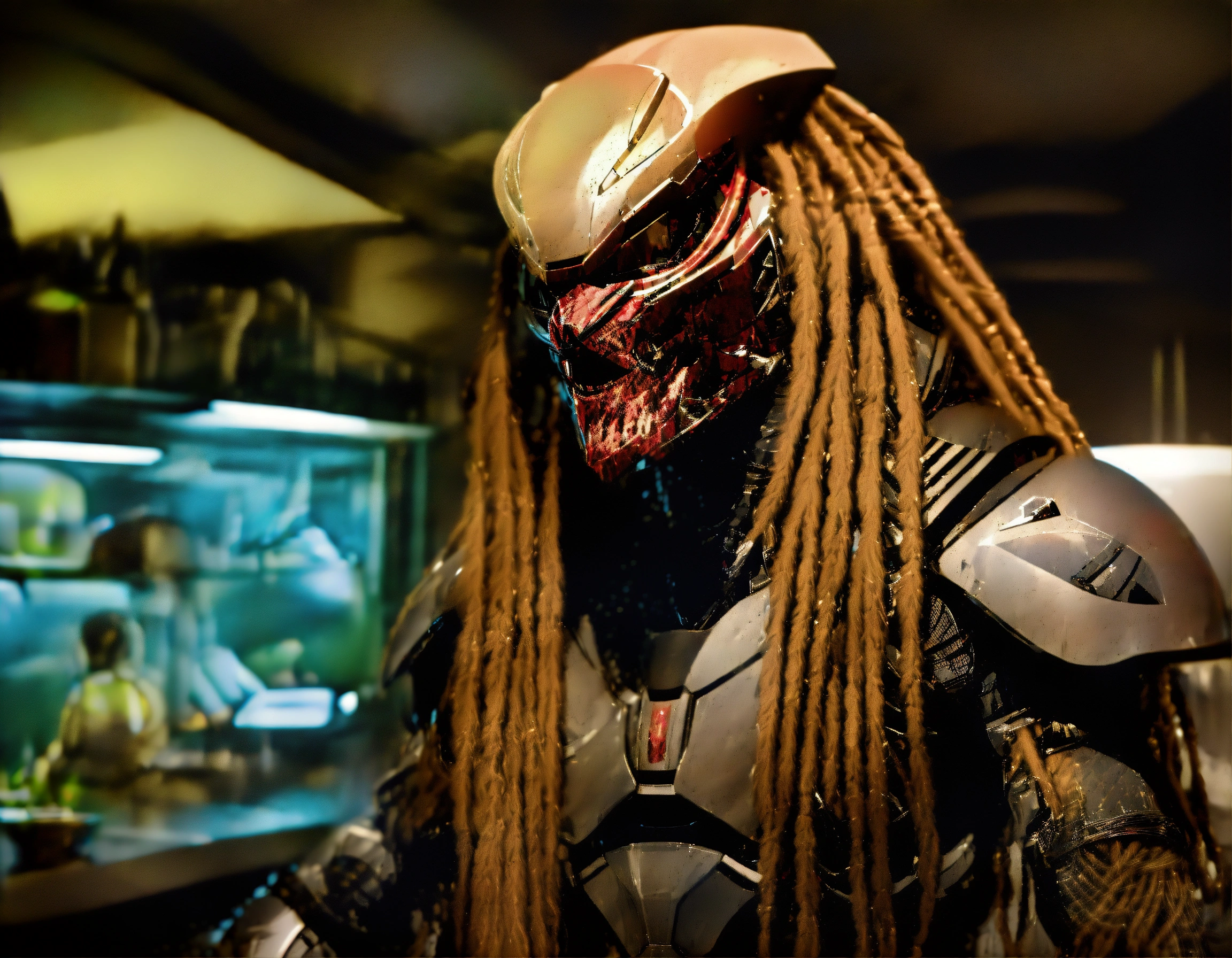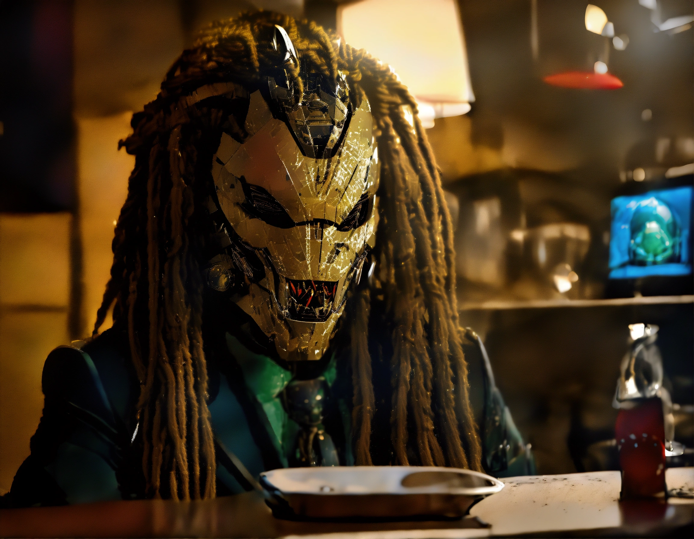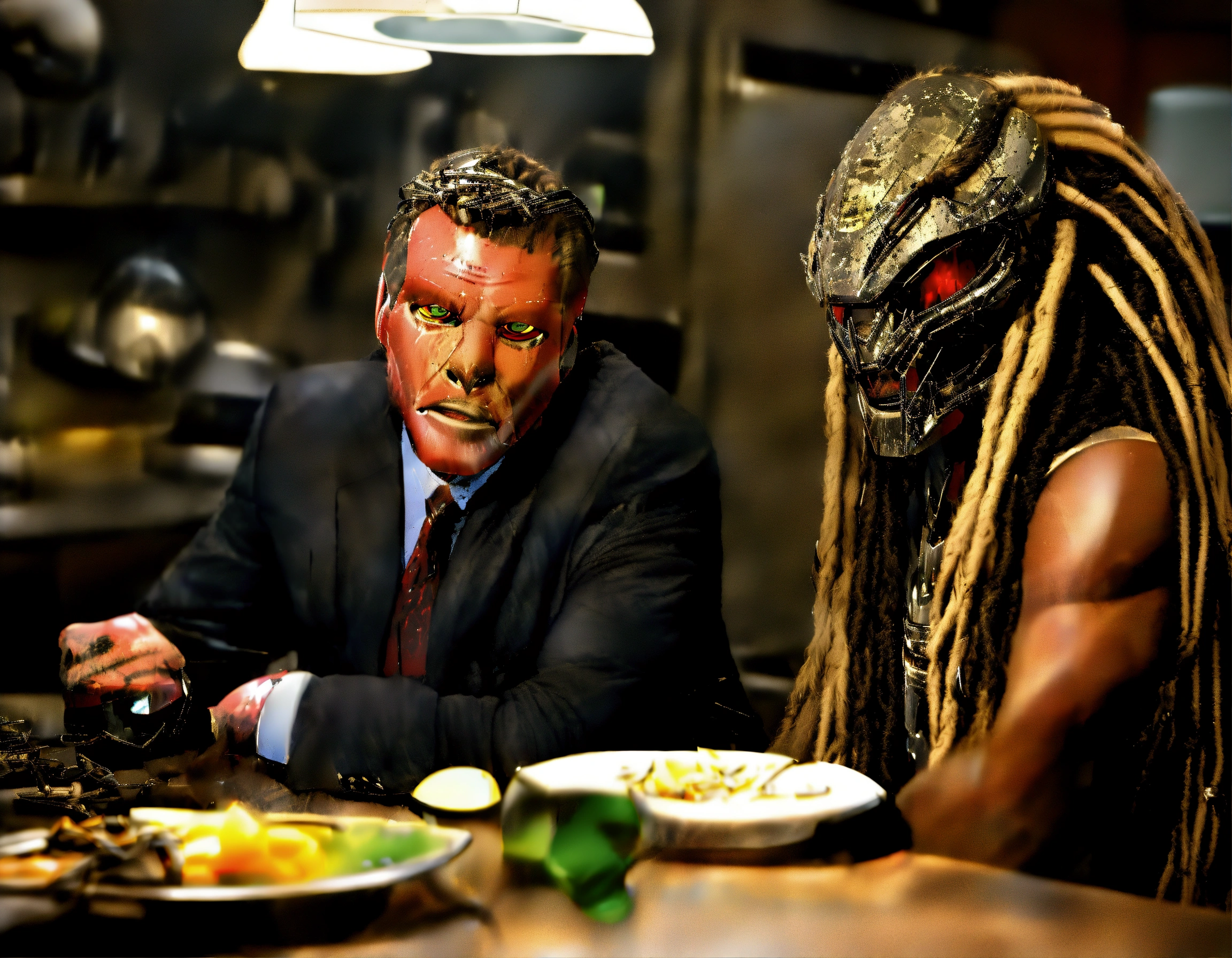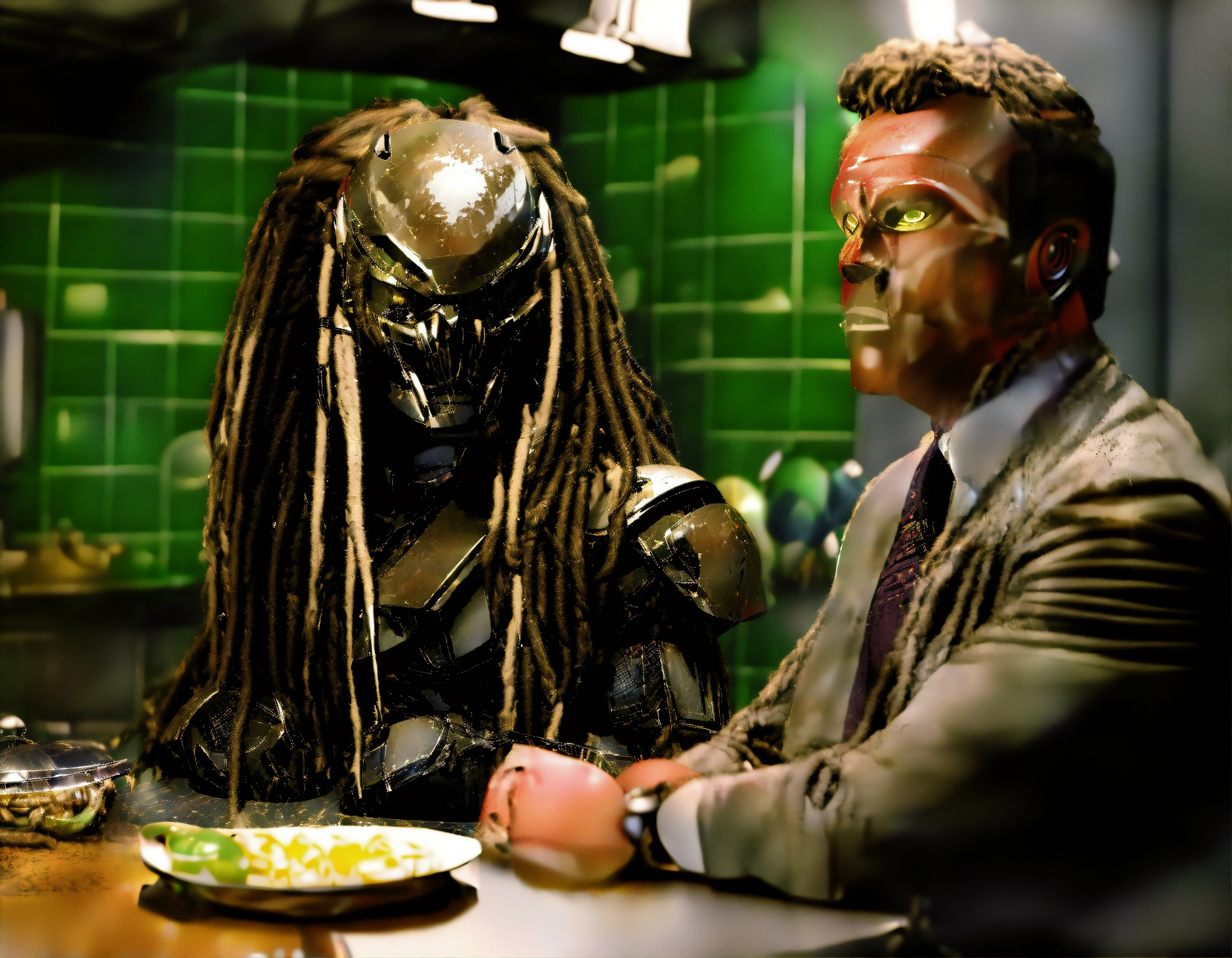 In a tense, awkward moment, (((chris hansen), host of "to catch a predator, ") sits across from the eponymous alien hunter from the predator films, in a kitchen.) chris questions the (((unmasked))) predator, also known as a "yatjua." (chris is in a suit.) (the (predator is ((unmasked)))), in its classic alien hunting gear, (((((without its helmet)))), leaving (its (strange ugly (alien (face, beady eyes, long dreadlocks, & mandibles))) exposed.)) the tension is palpable. the scene is captured in high-resolution 8khd, ensuring clear, sharply defined expressions. anatomy is flawlessly rendered, showing intricate details. lines are precise & clear, highlighting the golden ratio, contributing to a well-drawn, stylized composition. lighting casts long shadows, for eerie ambiance. ((the (predator’s ((facial) expression)) reflects fear & unease), while ((chris) maintains a stern, focused expression).) the atmosphere is tense. (ensure that (both (chris & the predator are within the image)).)