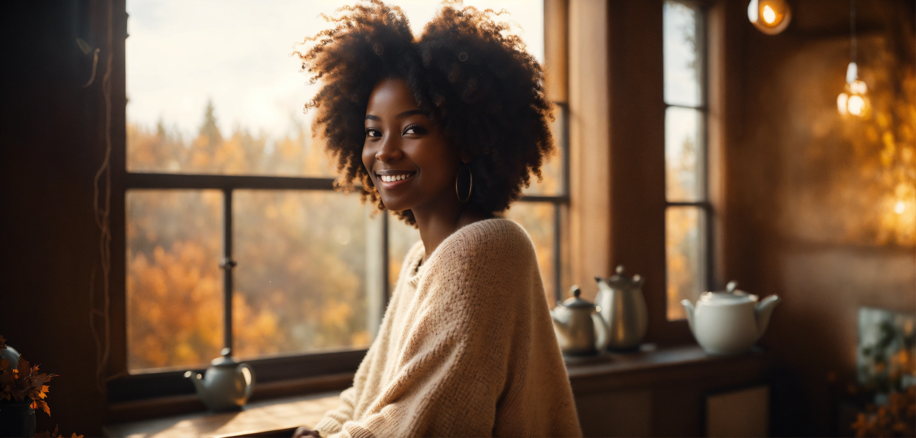 Wide-angle shot, beautiful melanated woman, dark skinned, peaceful face, smiling, white oversized sweater, bright, with afro hair with loose curls. the sun, the autumn trees, massive loft window, fall, cozy feminine living room, steaming tea, fantastic beauty. curls. ultra-detailed dreamlike, photography 8k resolution image, translucent and ethereal.