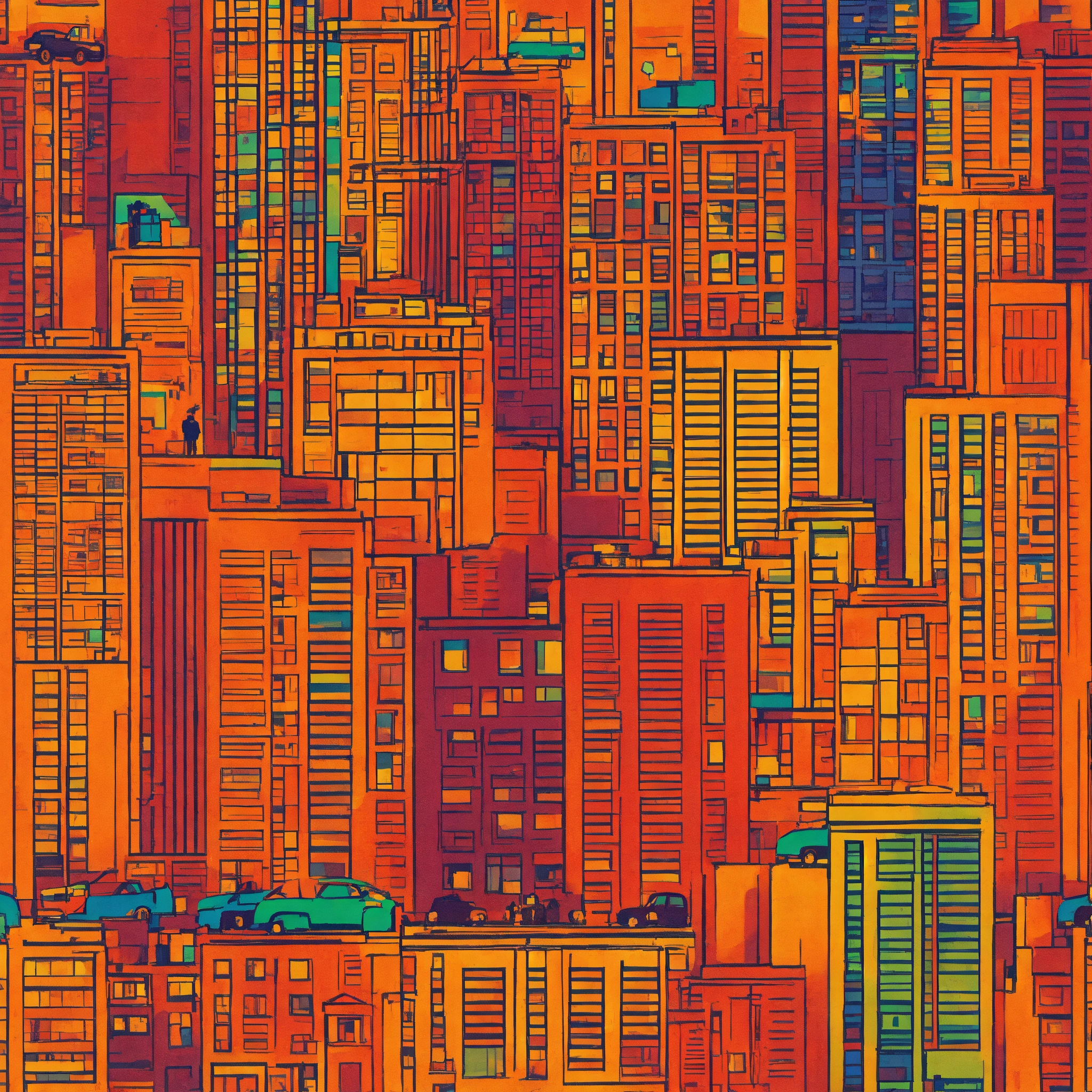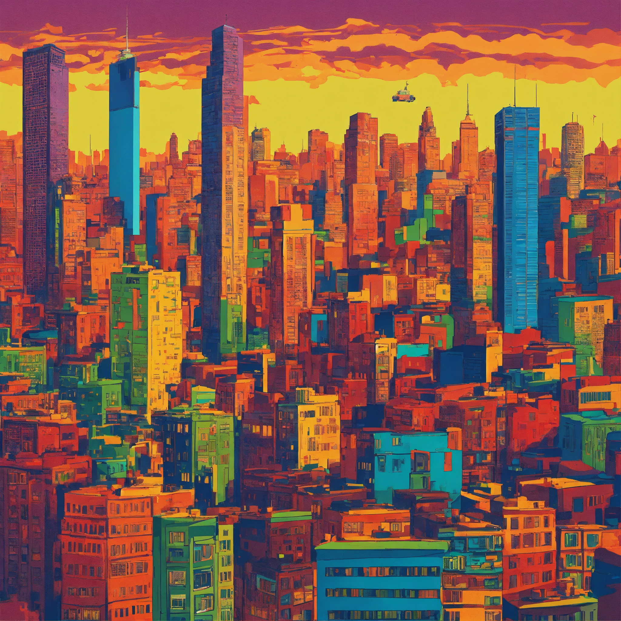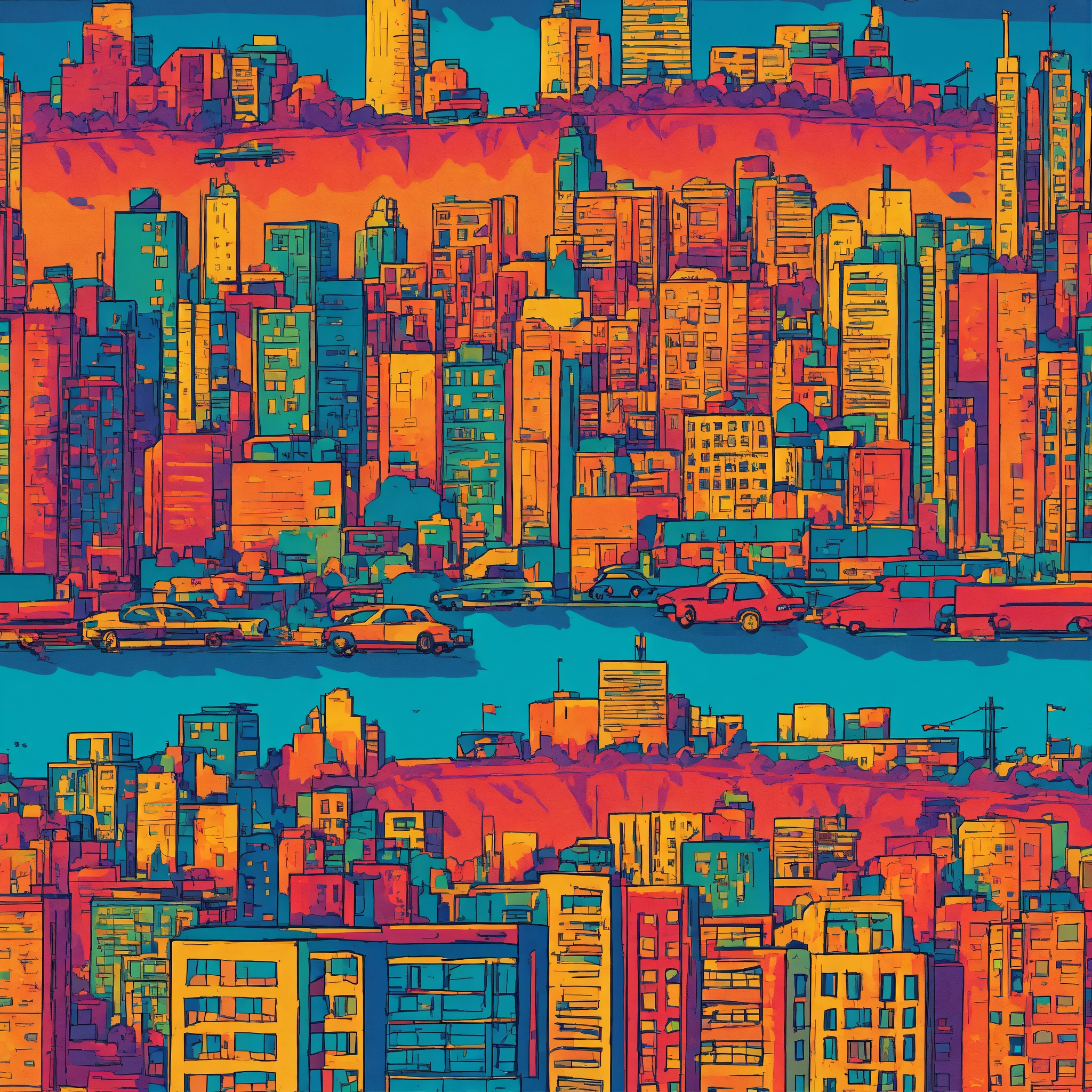 Imagine a t-shirt, with a solid color background, that captures the vibrancy and energy of a bustling cityscape on a solid color background. see skyscrapers, people, and cars, all set against a solid color backdrop, illustrating the transition from day to night on a solid color background, showcasing the beauty and chaos of urban life on a solid color background.