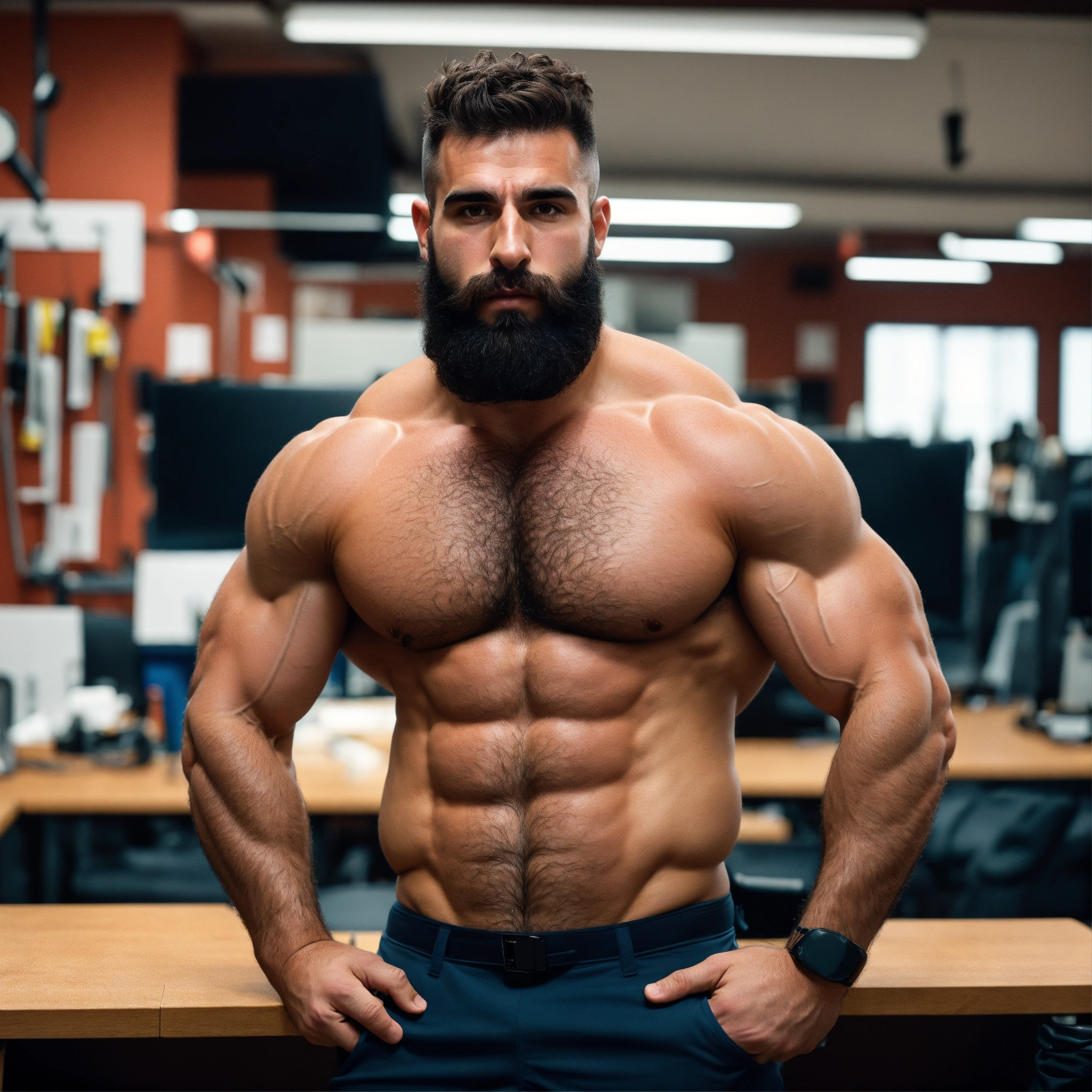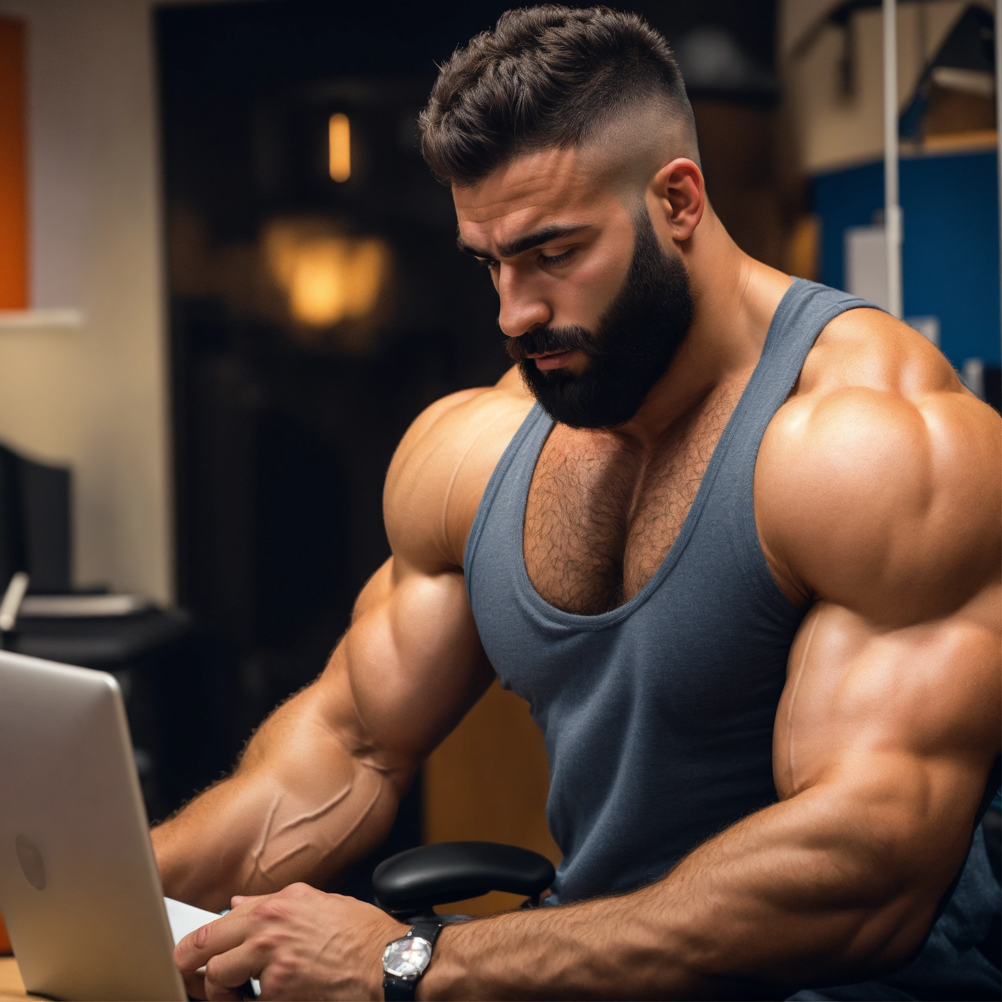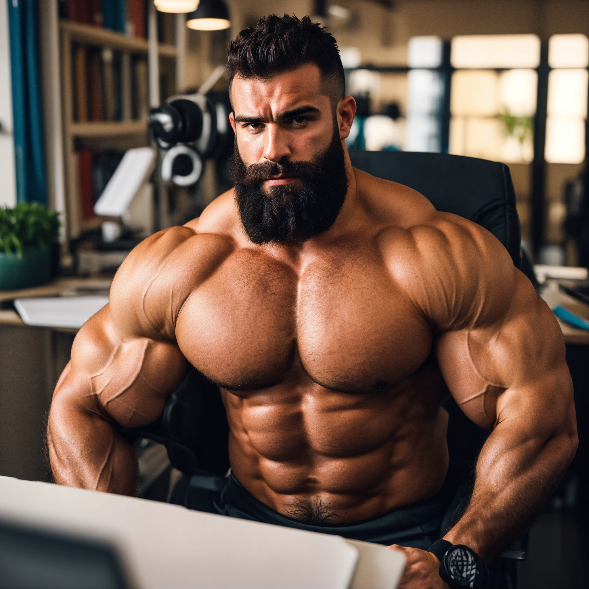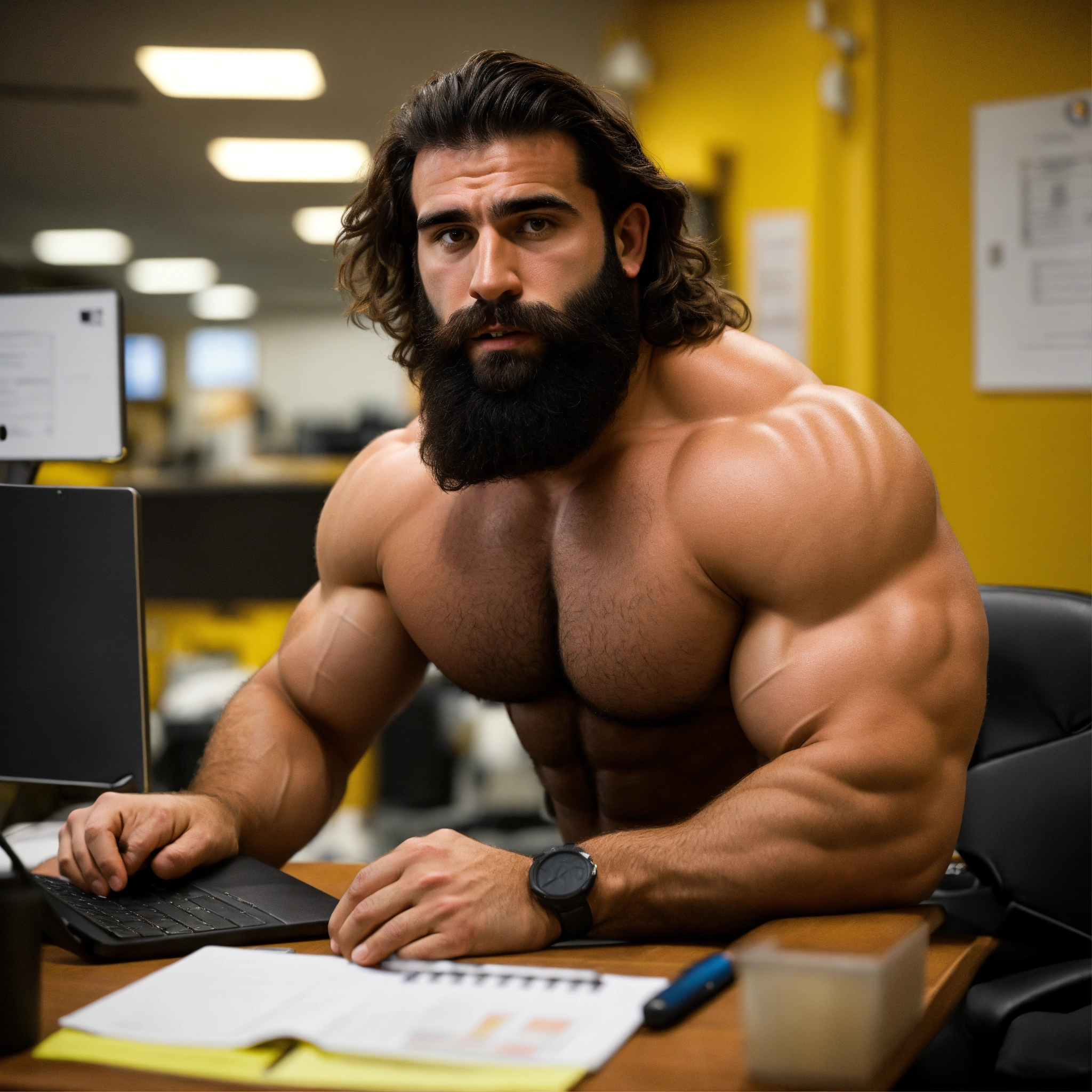 30-year-old hairy spanish man with big muscles, big bodybuilder, body like a wrestler, at work in his office