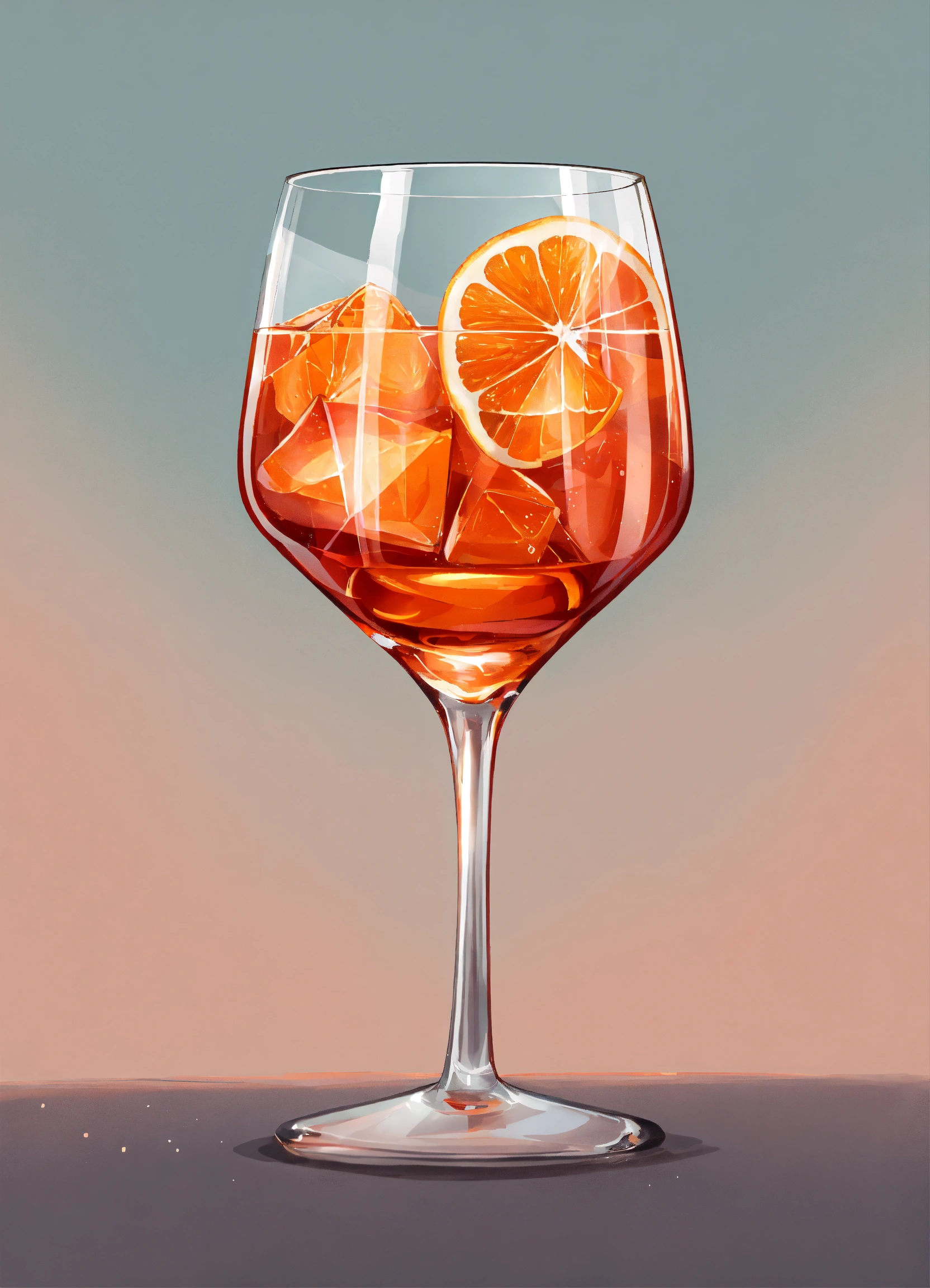 Cartoon minimalist elegant sophisticated aperol spritz drink drink edges in a wine glass ice cube transparent background